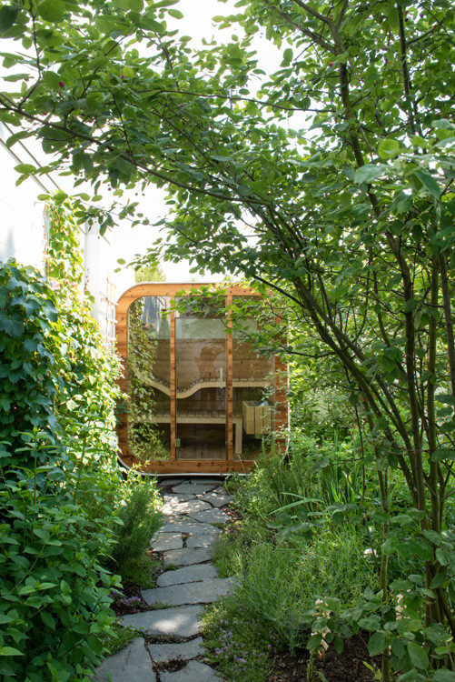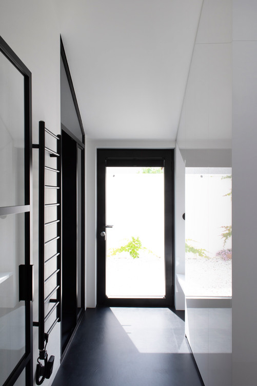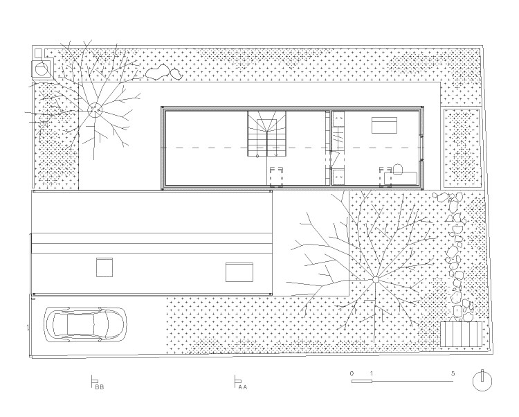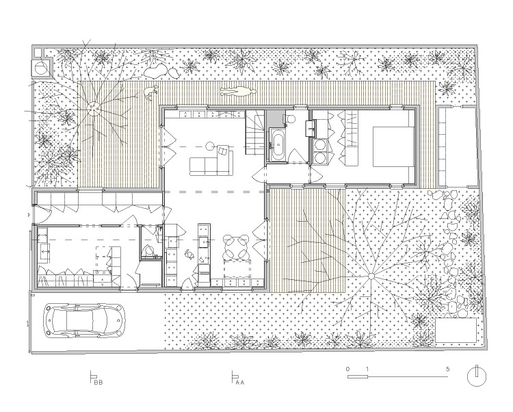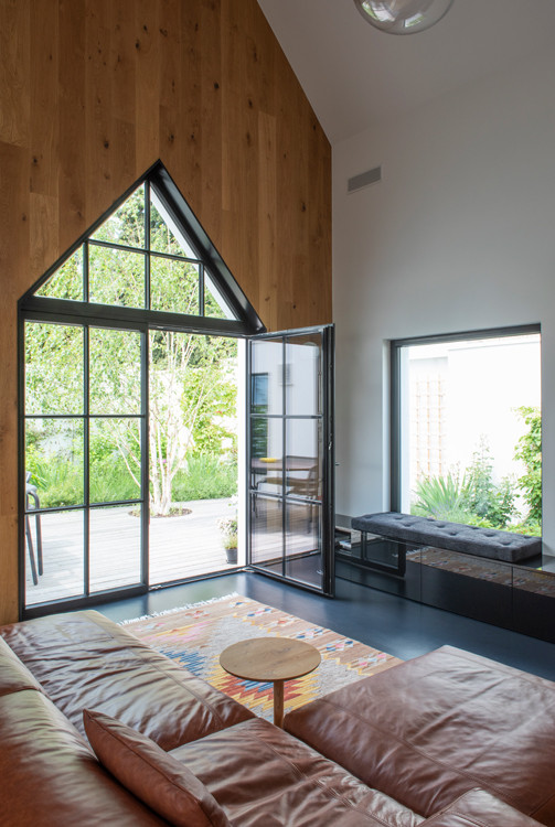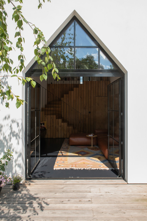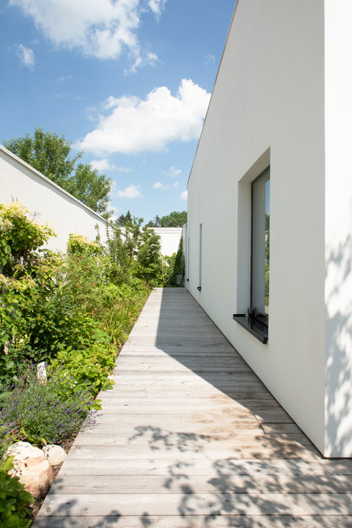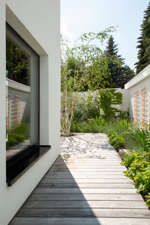 Dům rozčlenil také pozemek. „V místě vnitřních nároží vznikly dvě soukromé terasy. Východní ranní. Západní odpolední. Úhlopříčně jsou přístupné z interiéru obývacího středu domu,“ vysvětlují architekti základ svého konceptu. Z každé terasy je výhled na jeden vzrostlý strom, který ji zároveň stíní a dodává jí intimitu. Jsou tu i další zákoutí, v jednom z nich je ukrytá sauna. Člověk ovšem zahradu využívá, i když je uvnitř domu. Všechna okna vedou do zeleně, která se na pozadí bílých zdí kolem pozemku jeví jako živé obrazy.