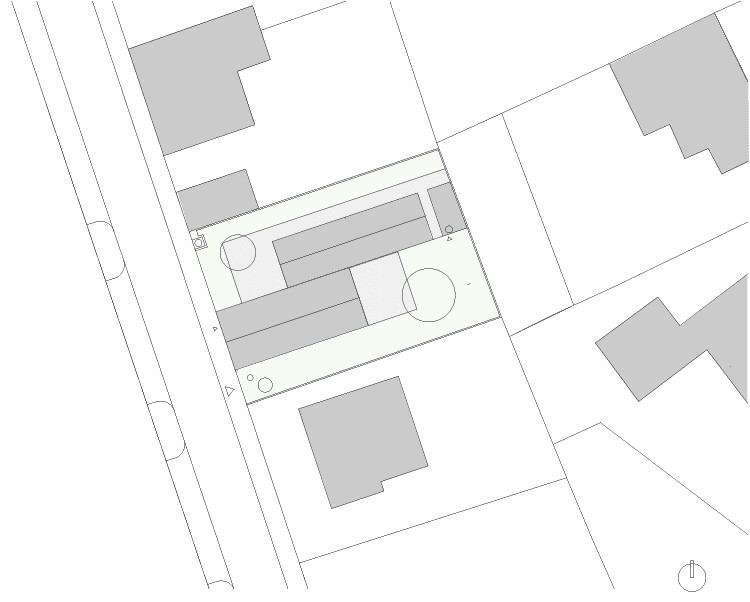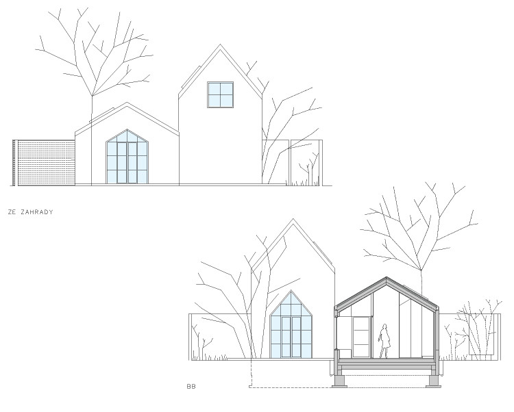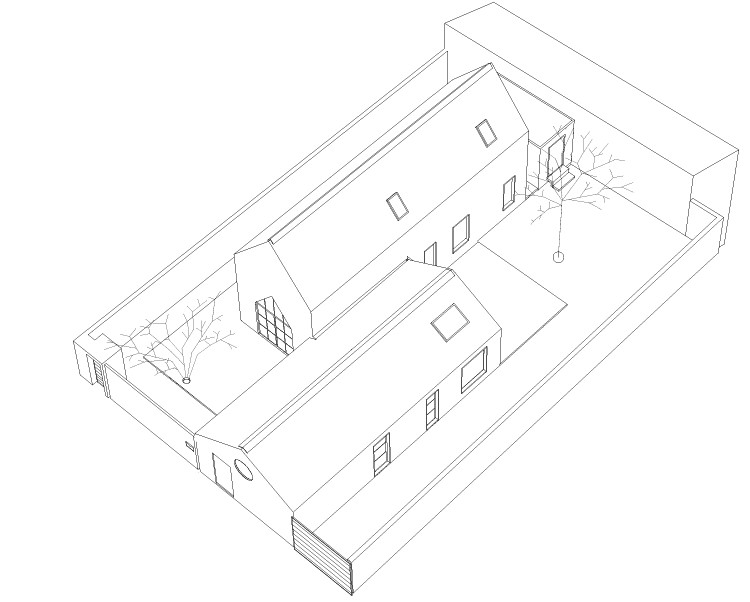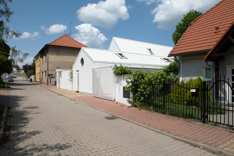 Pozemek se ovšem nacházel ve staré „vesnické“ části Lysolají a byl tedy poměrně malý – necelých 350 metrů čtverečných. Stál na něm podmáčený domek ze začátku 20. století. Místo něj tu měl vyrůst prostorný současný dům s pracovnou a garáží. Zadání dostali Milena Kubiszová a Ondřej Volný ze studia Skvadra architekti. Našli řešení – udělali domy dva a posunuli je podél podélné osy.
