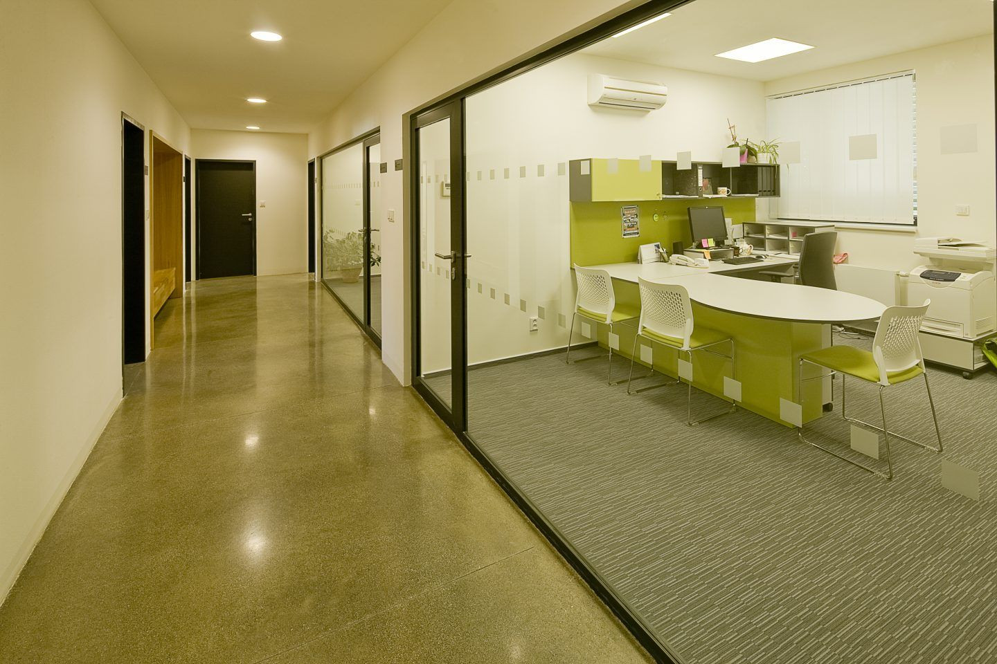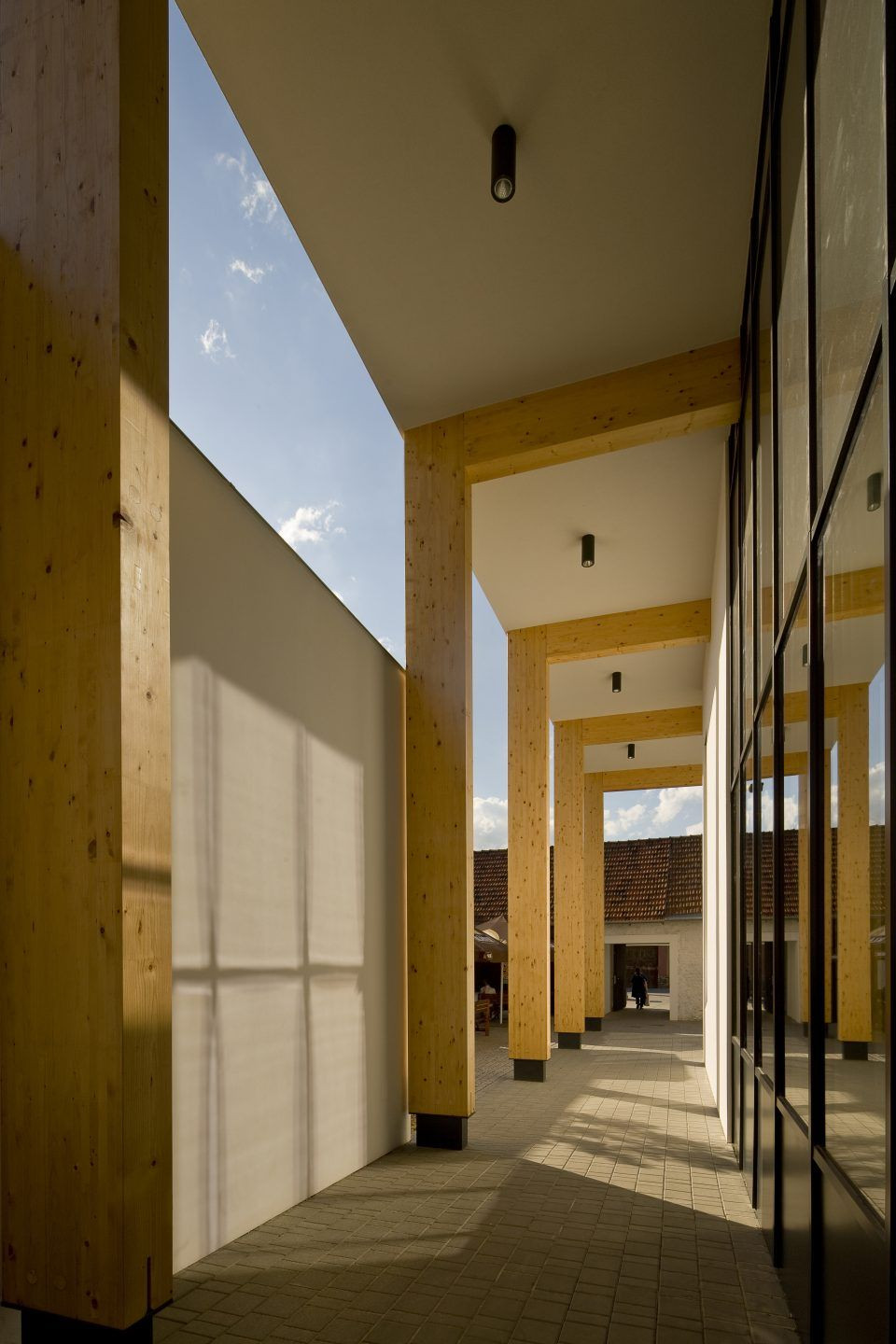 Celý průchod, spojující náves s náměstím je možné v nočních hodinách uzavřít oboustranně mřížemi proti vandalům. Architektonická forma obecního úřadu a pošty je jednoduchá. Jde o jednopodlažní objekty se sedlovou střechou s keramickou pálenou krytinou režné barvy. To objektům umožní lépe zapadnout do okolí jednopodlažních, převážně rodinných domů. Důstojnost veřejné správní budovy je podtržena kamenným obkladem meziokenních pilířů obecního úřadu.
