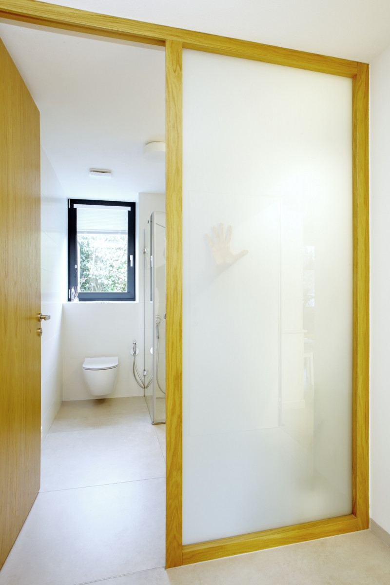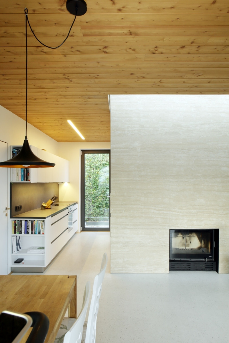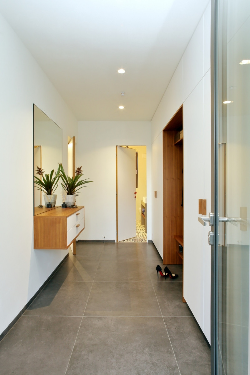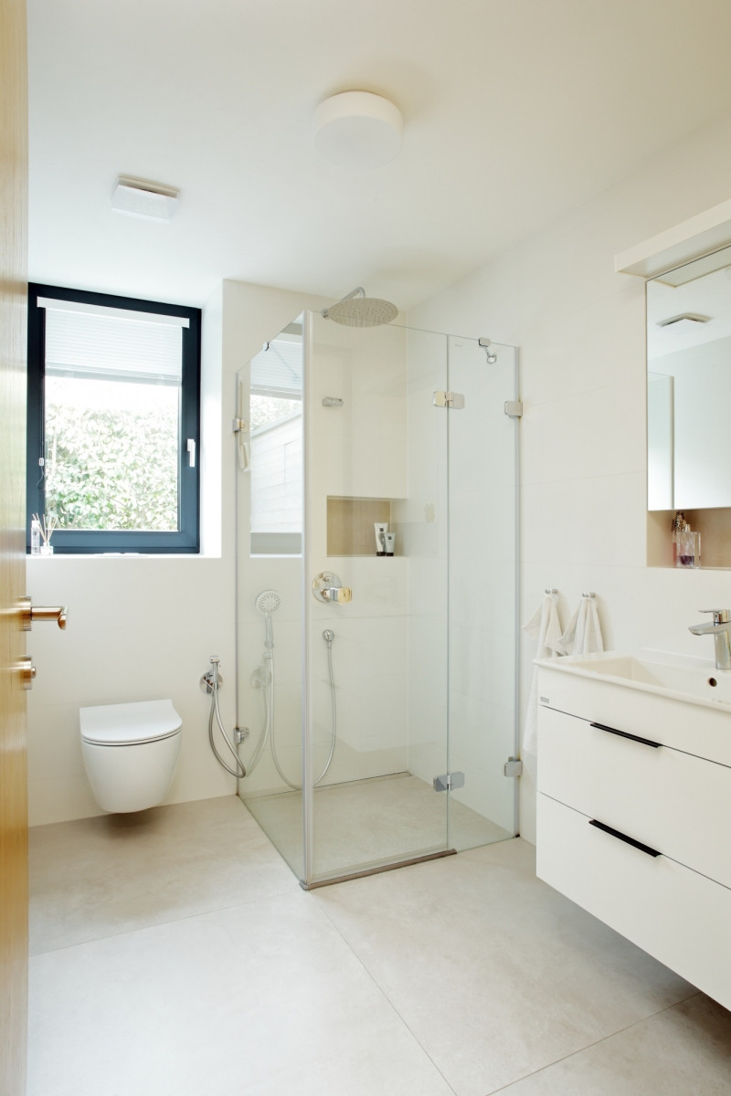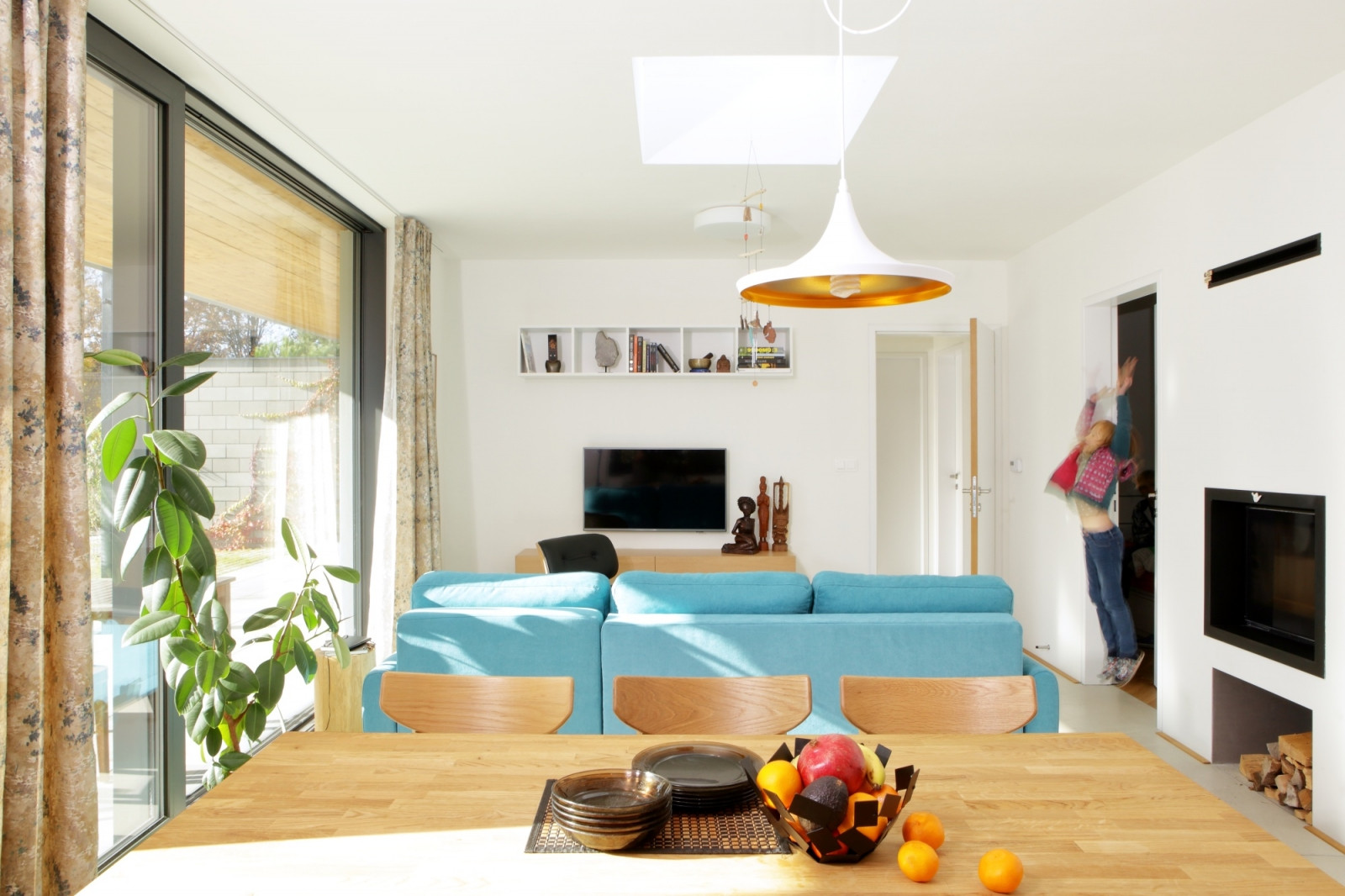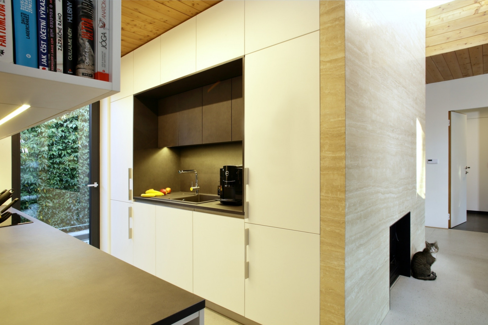 Bílá a šedá barevná paleta se z exteriéru přelévá i do interiéru rodinného domu. Místnosti jsou vybavené vestavným nábytkem šetřícím prostor. Betonové podlahy a bílé vybavení místy ozvláštňuje dýha z různých druhů dřeva, obklady s orientálním vzorem nebo třeba travertinové obložení krbu. Své místo zde našel i suvenýr přímo z Indonésie – větrací kamenná dlaždice umístěná v koupelně.