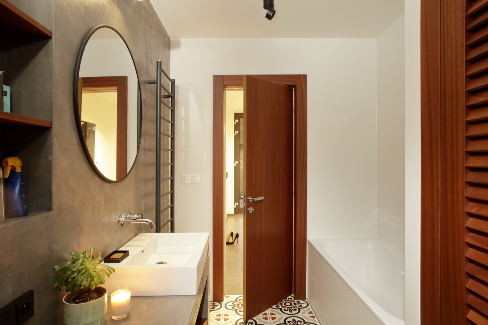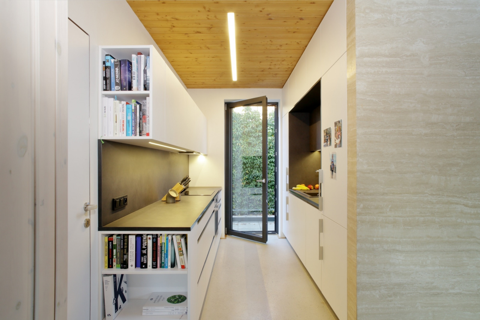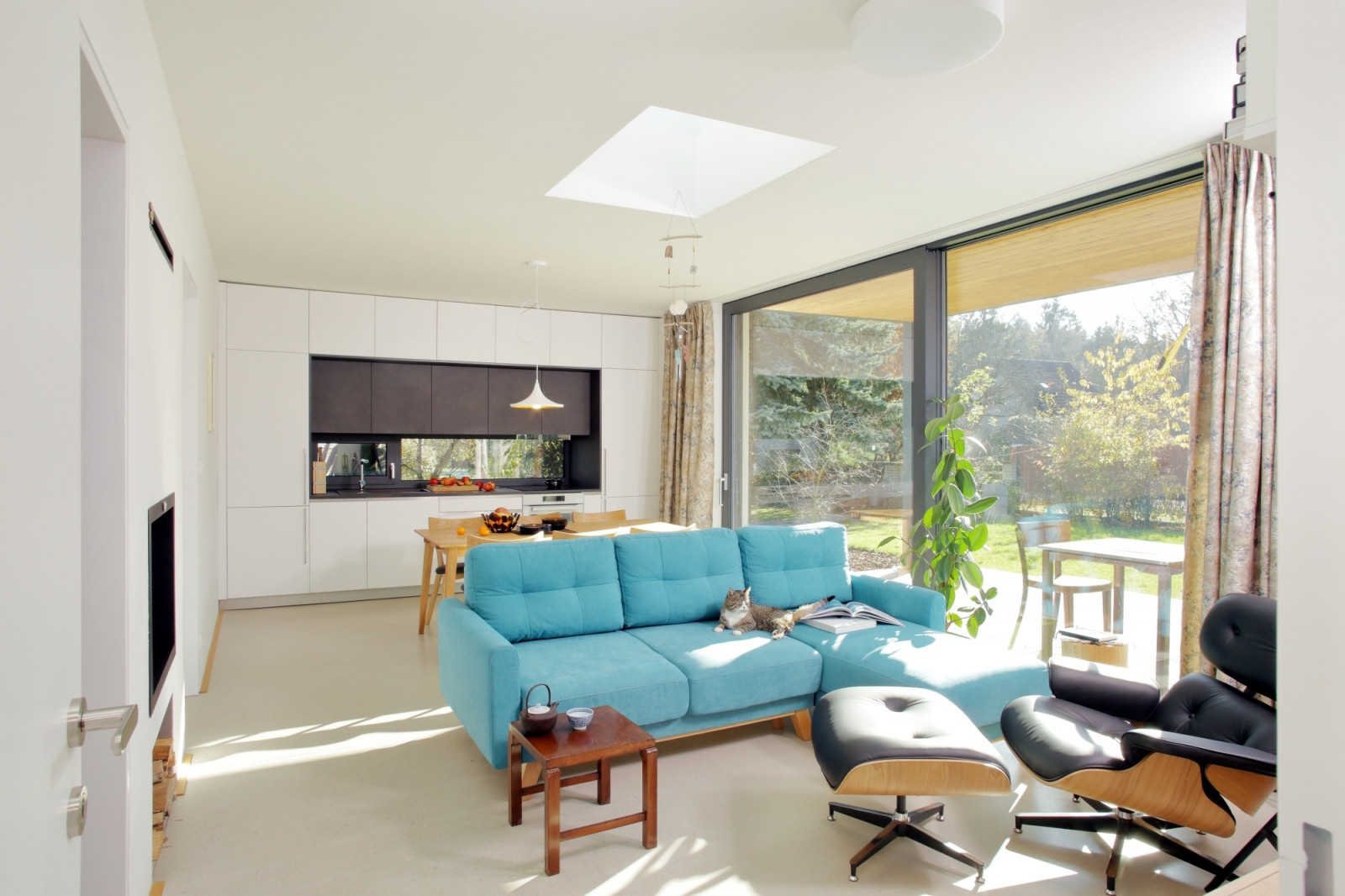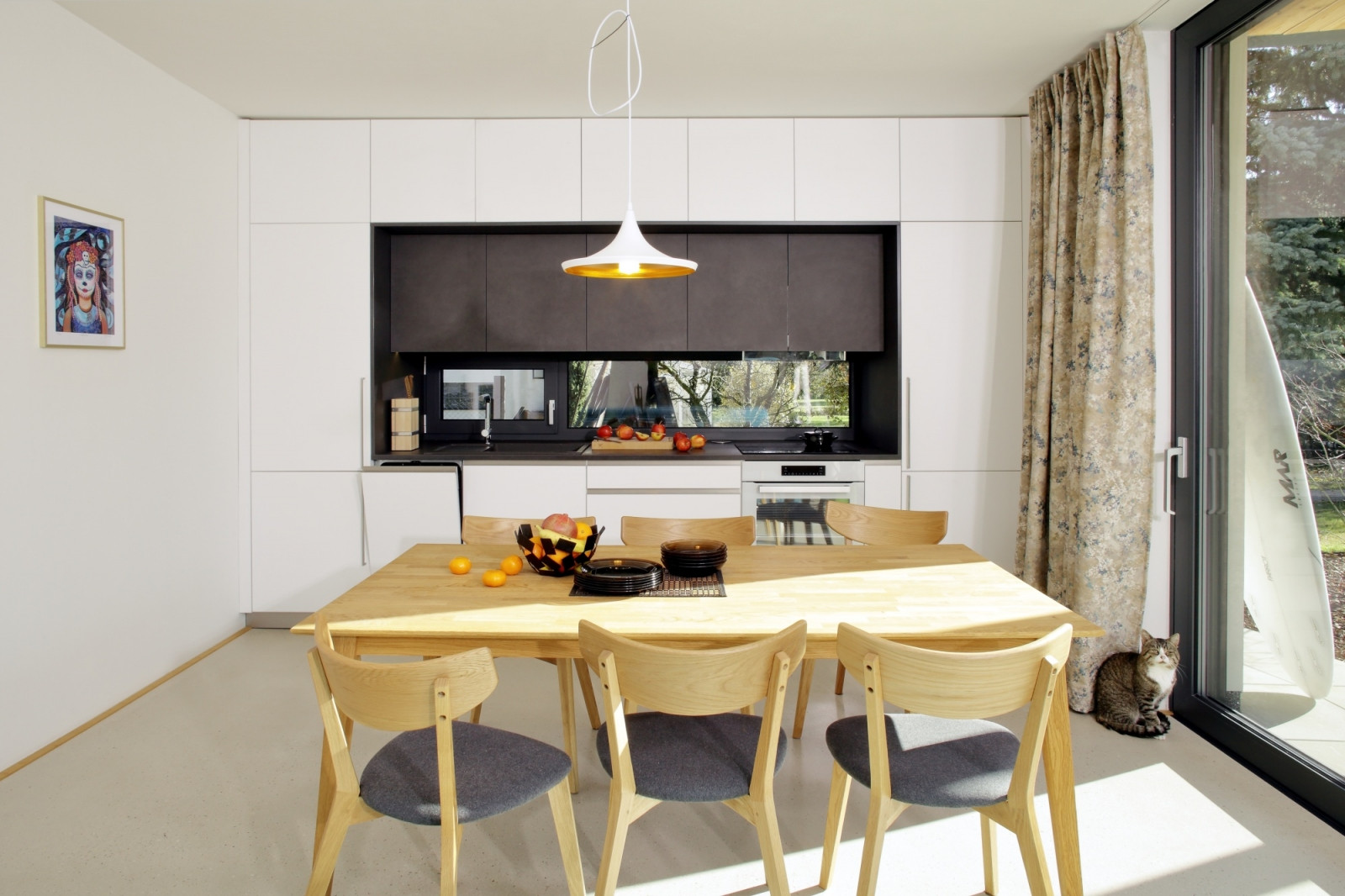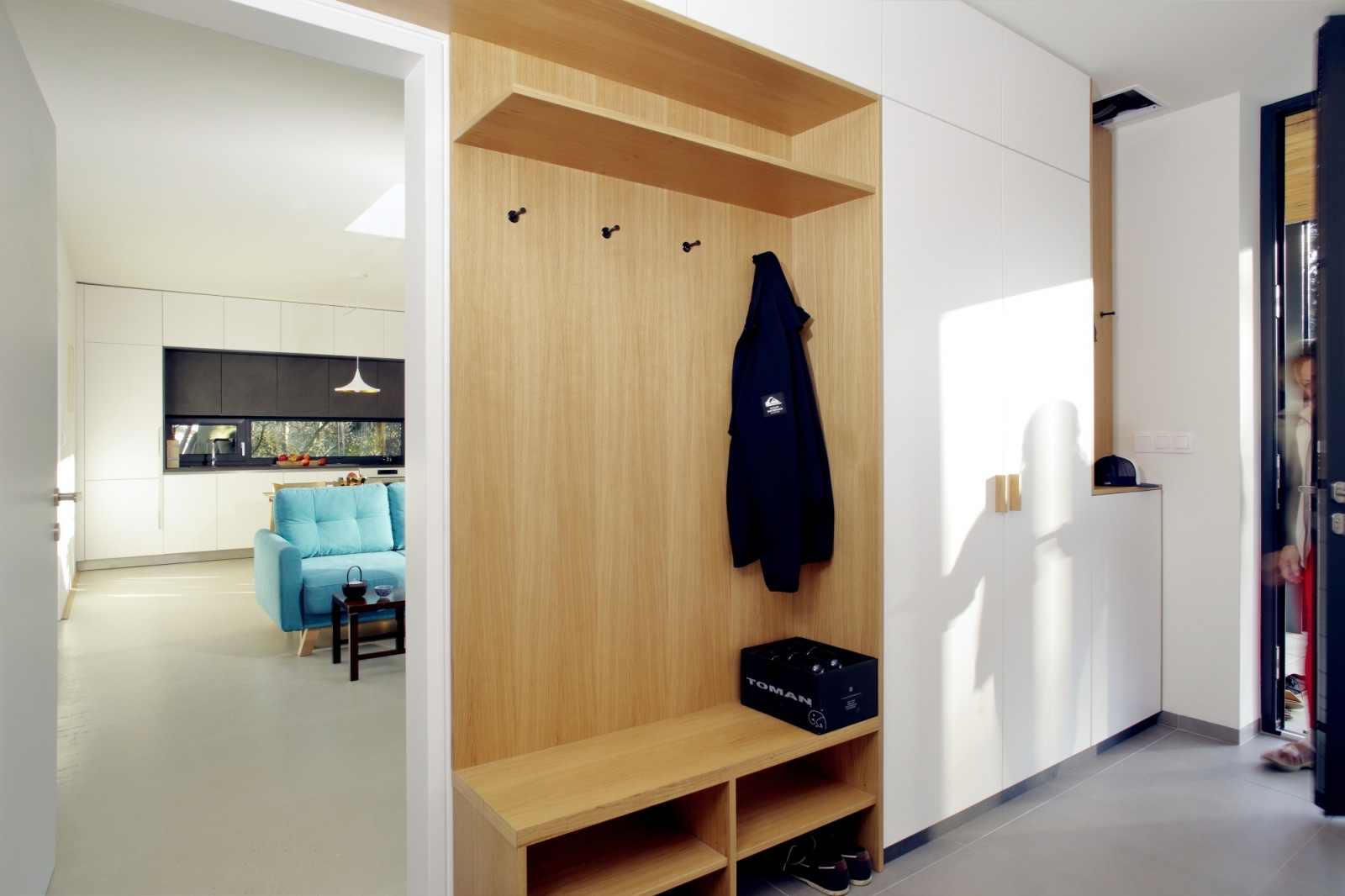 Bílá a šedá barevná paleta se z exteriéru přelévá i do interiéru rodinného domu. Místnosti jsou vybavené vestavným nábytkem šetřícím prostor. Betonové podlahy a bílé vybavení místy ozvláštňuje dýha z různých druhů dřeva, obklady s orientálním vzorem nebo třeba travertinové obložení krbu. Své místo zde našel i suvenýr přímo z Indonésie – větrací kamenná dlaždice umístěná v koupelně.