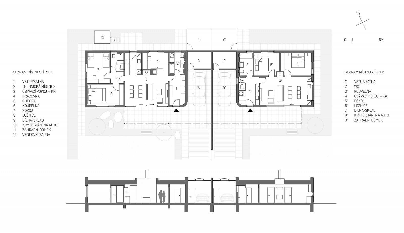 Domy, které stojí v Klánovicích nedaleko místního lesa, odděluje stěna z betonových tvárnic. Vše je komponováno co nejvíce symetricky. V průčelí se nachází dvě krytá parkovací stání. Do racionální skladby přinášejí ozvláštnění zaoblené stěny. Obytné pokoje se směrem do zahrady otevírají velkoformátovými okny a prosklenými dveřmi. „Na jižní fasádě z domu vystupuje ocelová pergola, která chrání velká okna před přehříváním a kryje terasu a vstupní prostor před deštěm,“ dodává architekt.
