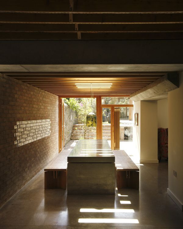 Ačkoli měli rodiče ze stěhování větší strach, architekti jim zaručili, že se v novém domě budou cítit lépe. Rodinný rituál, společná nedělní večeře, se stal ústředním bodem návrhu. Jídelnímu stolu bylo v domě vymezeno skoro až posvátné místo: Odlitý z betonu v podobě oltáře, sděluje svoji důležitost a dominanci každé návštěvě.