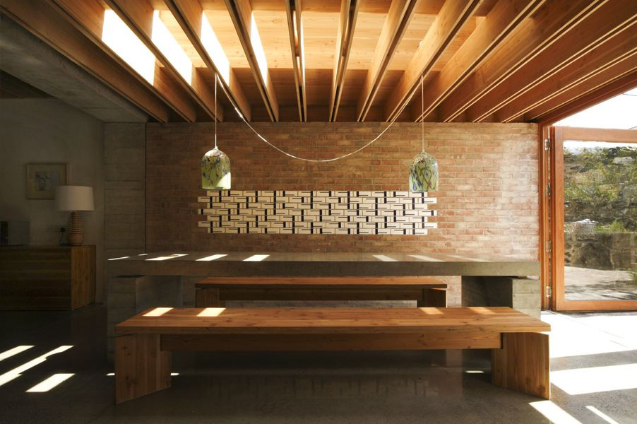 Další zvláštnost prostoru se nachází ve zdi za stolem. Do zdiva je zakomponováno 100 identických tzv. Ruskinových cihel, pojmenovaných podle Ruskinovy teorie o stavbě v architektuře. Zedníkovi byla při skládání cihel dána volnost a ty, které dostal, mohl použít v jakékoliv kombinaci, kterou považoval za vhodnou. Výsledná kompozice – náhodný grafický vzorek – znázorňuje proces výstavby a podtrhává hodnotu cihly. Umělecké dílo není zavěšeno na zdi, ale stalo se trvalou součástí konstrukce domu.