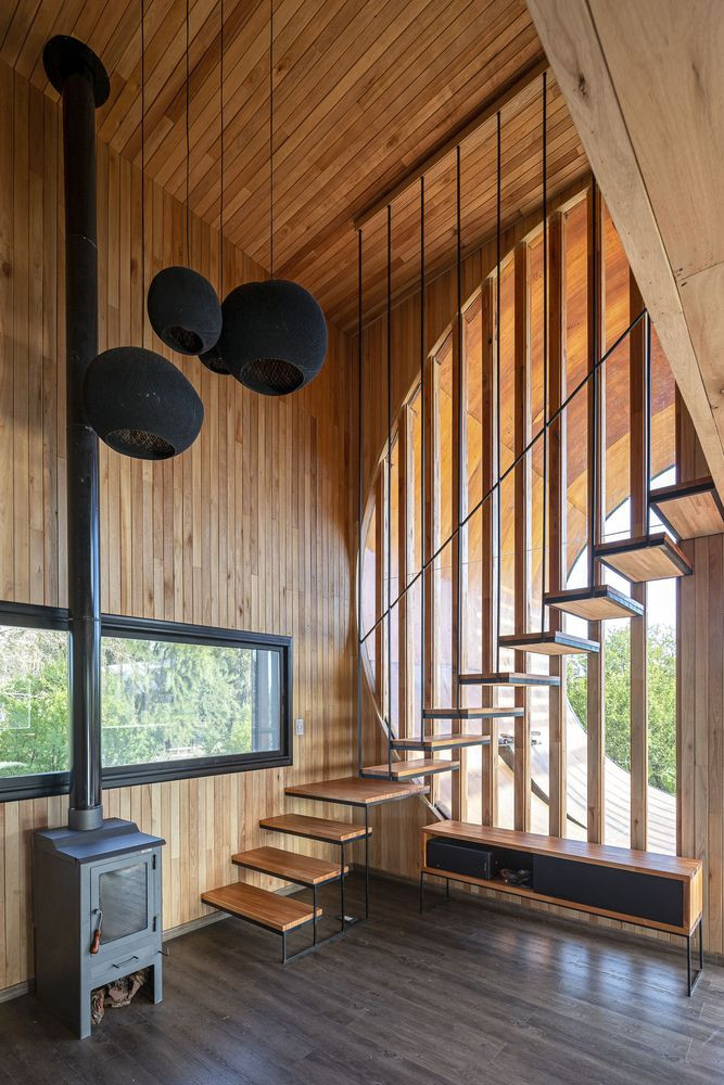 Dřevo vévodí také interiéru. Ve spodním patře se nachází kuchyň a obývací pokoj. Do horního patra vedou žebrované schody. Horní podlaží představuje ložnice s koupelnou a balkonem. Vše je zahaleno v jednotném odstínu dřeva, nenápadné a střídmé doplňky jsou v tmavých barvách.
