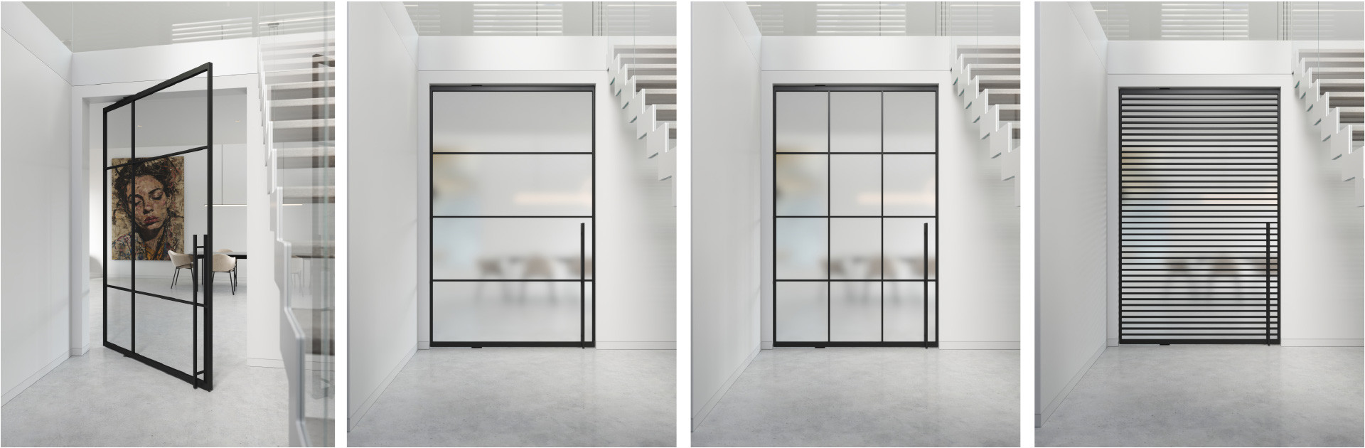 Všechny modely lze navrhnout také v dvoukřídlé variantě, doplnit o fixní boční světlíky a přizpůsobit je rozměrově i barevně dle vzorníků RAL, NCS i JAP Metallic. Pivotové uložení se vždy přizpůsobuje dané výšce a šířce dveří, čímž je zajištěna stabilita a funkčnost i u velkoformátového provedení.