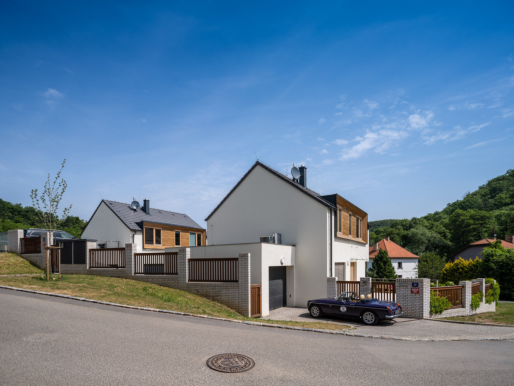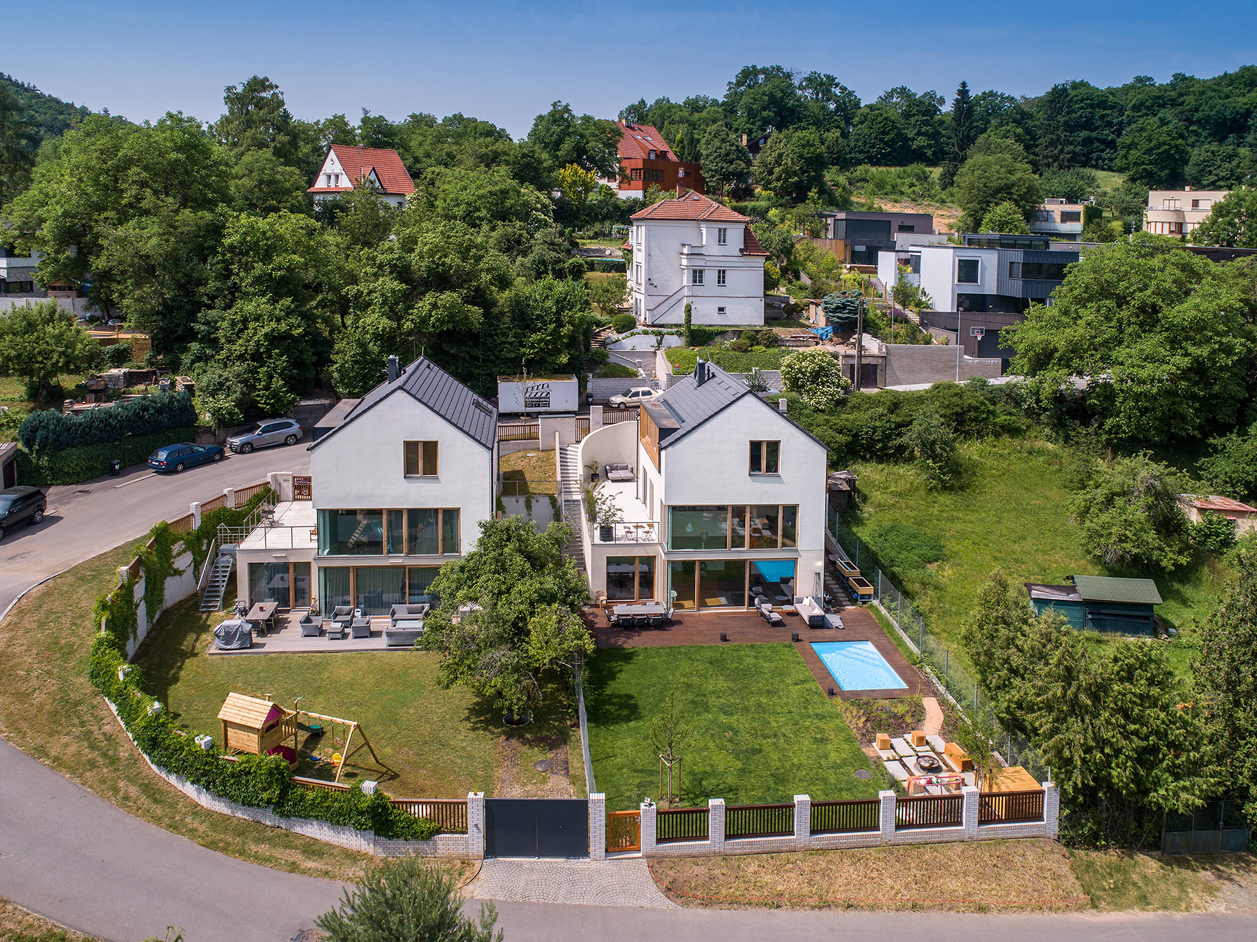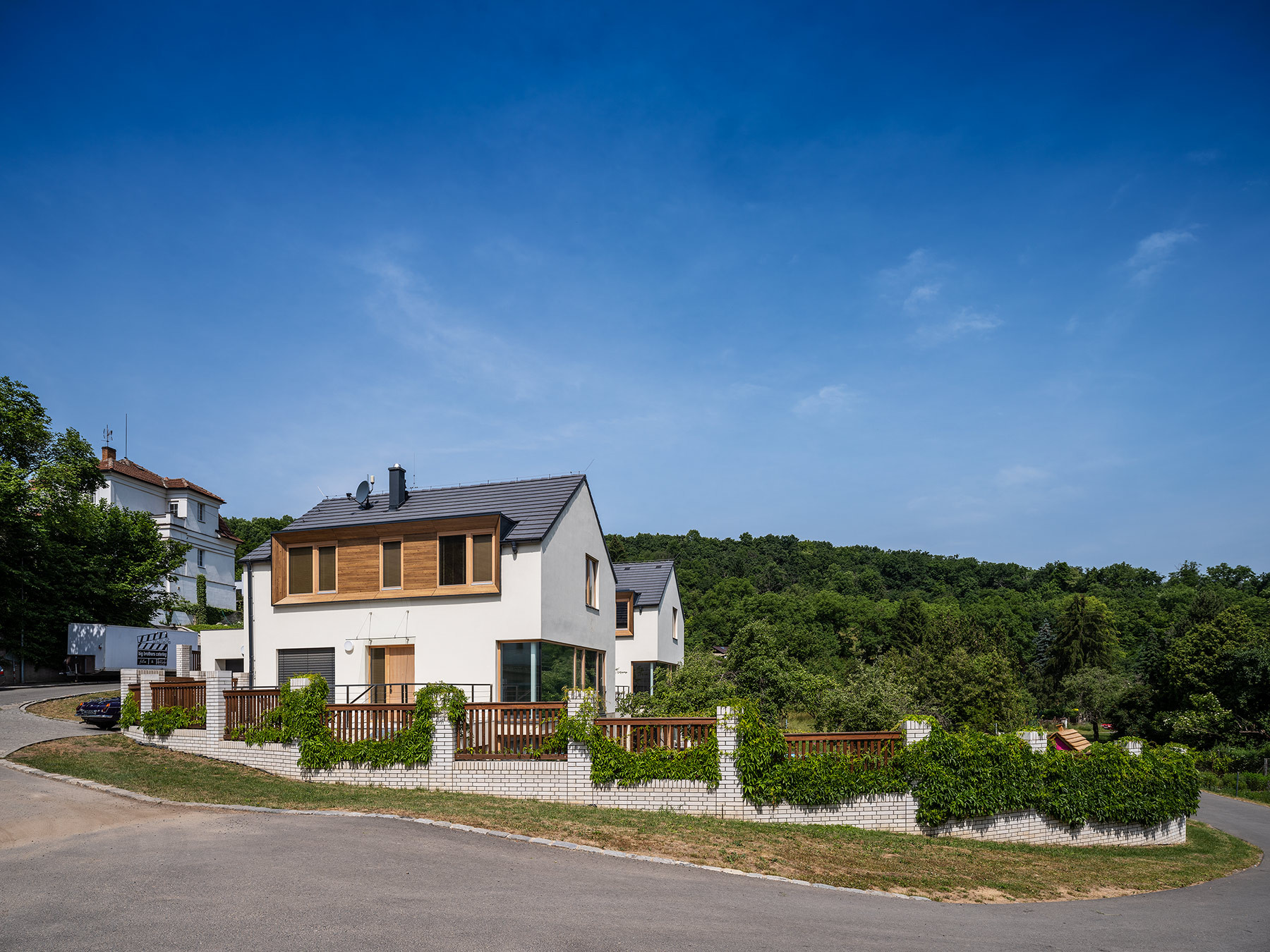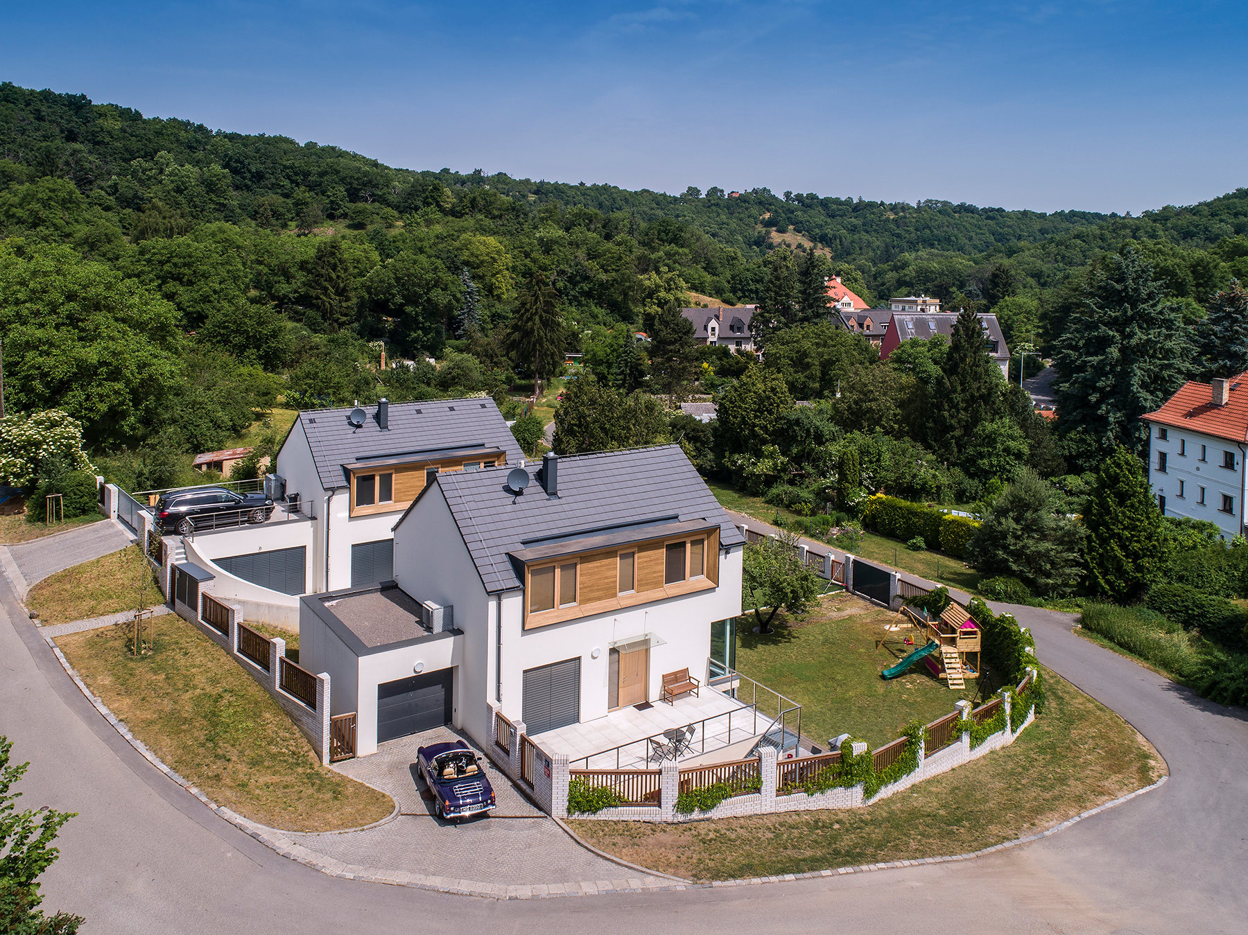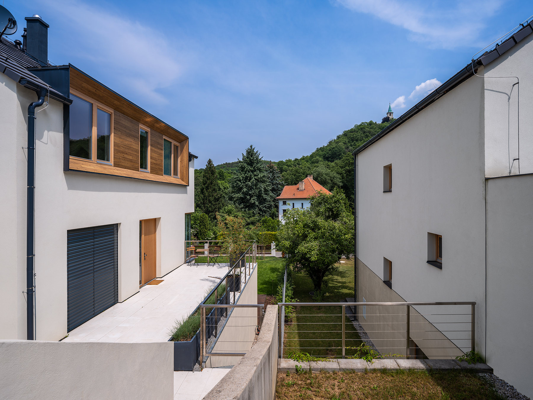 Architekti situaci nápaditě vyřešili prostornými vstupními terasami, které jsou napojeny na příchod z ulice. V případě krajního domu se k ní terasa přimyká ihned, u domu vedlejšího je vše propojeno zakřiveným schodištěm. „Důležitým spojujícím prvkem obou domů je důsledná práce s osazením na terén a zakomponování domu do svahu, propojení zahrady pomocí betonových a ocelových schodišť,“ podotýkají architekti Václav Navrátil a Jan Sedláček ke způsobu vetknutí novostaveb do terénu.