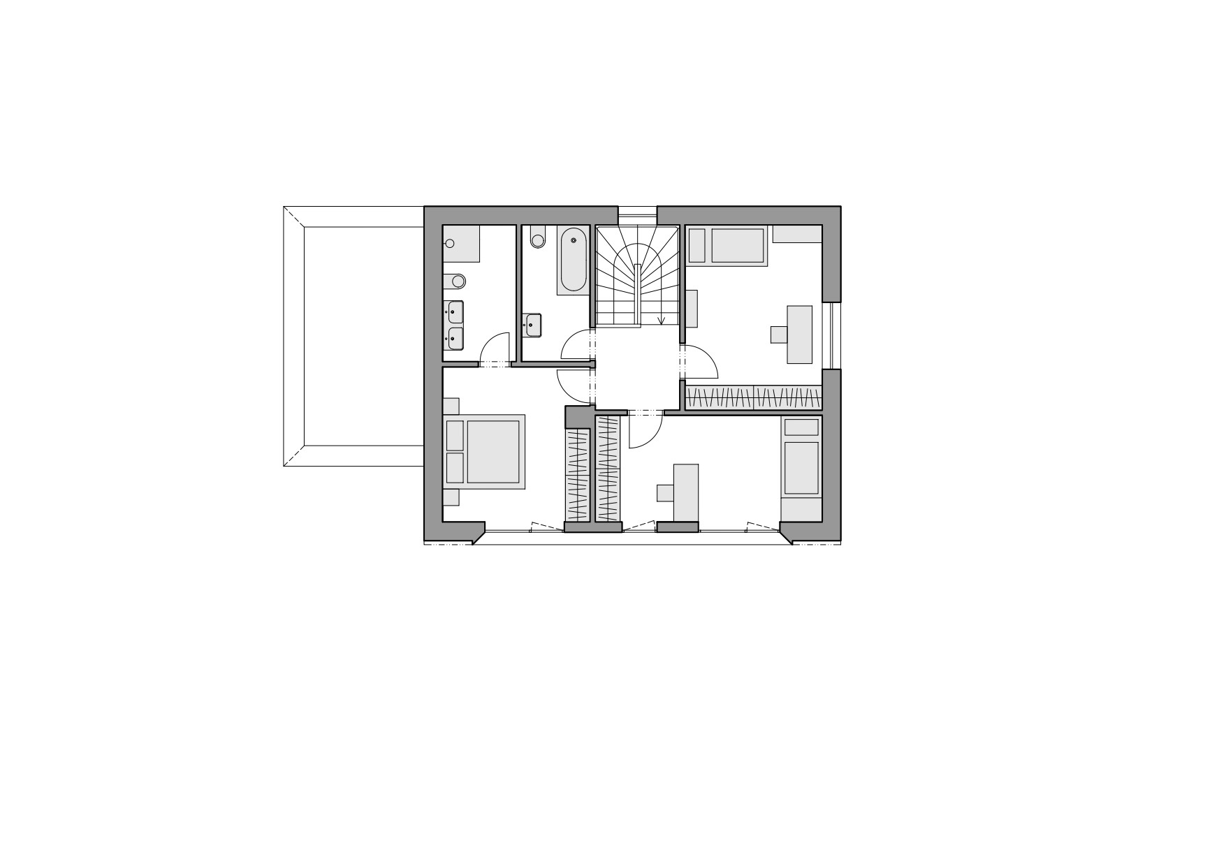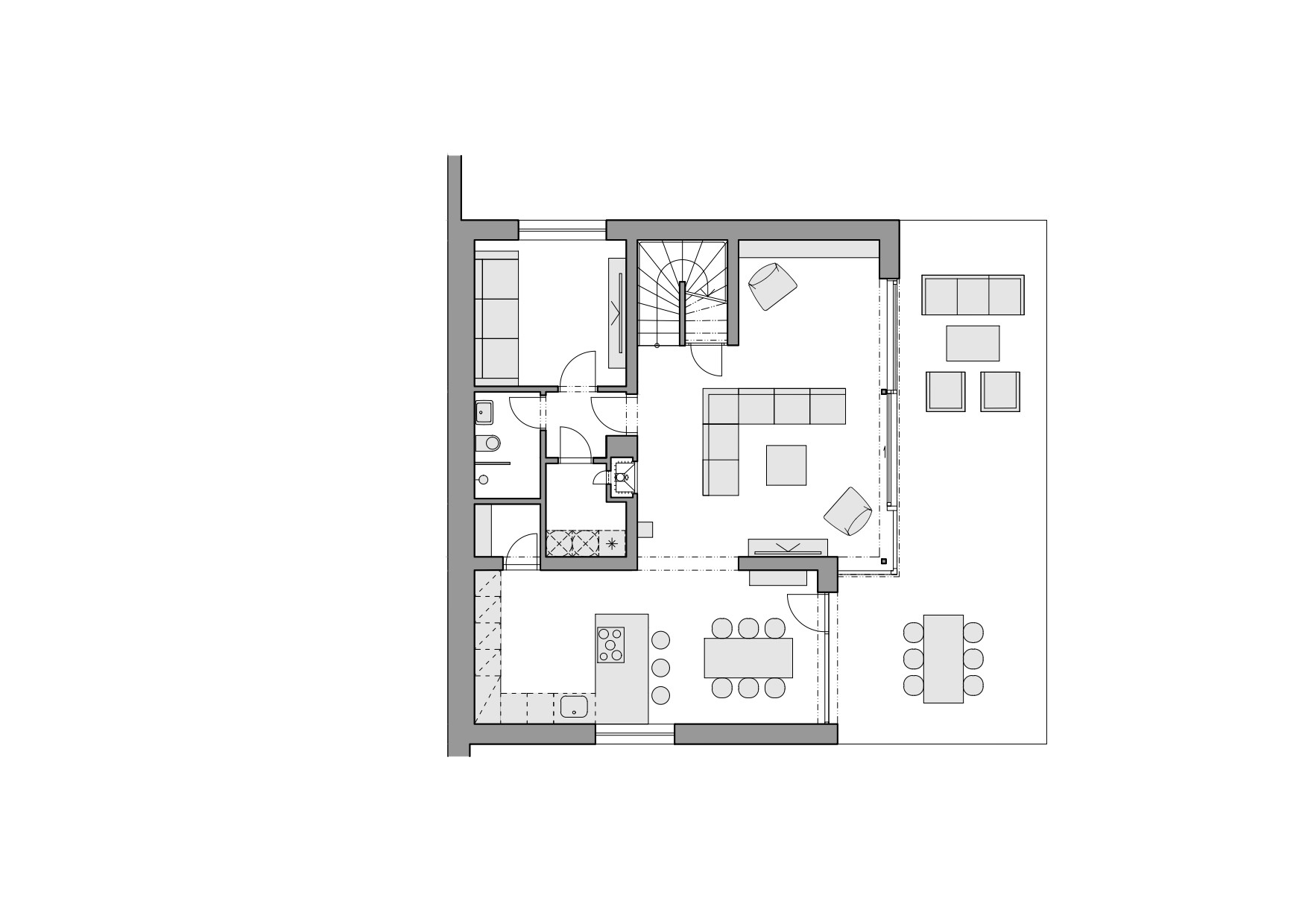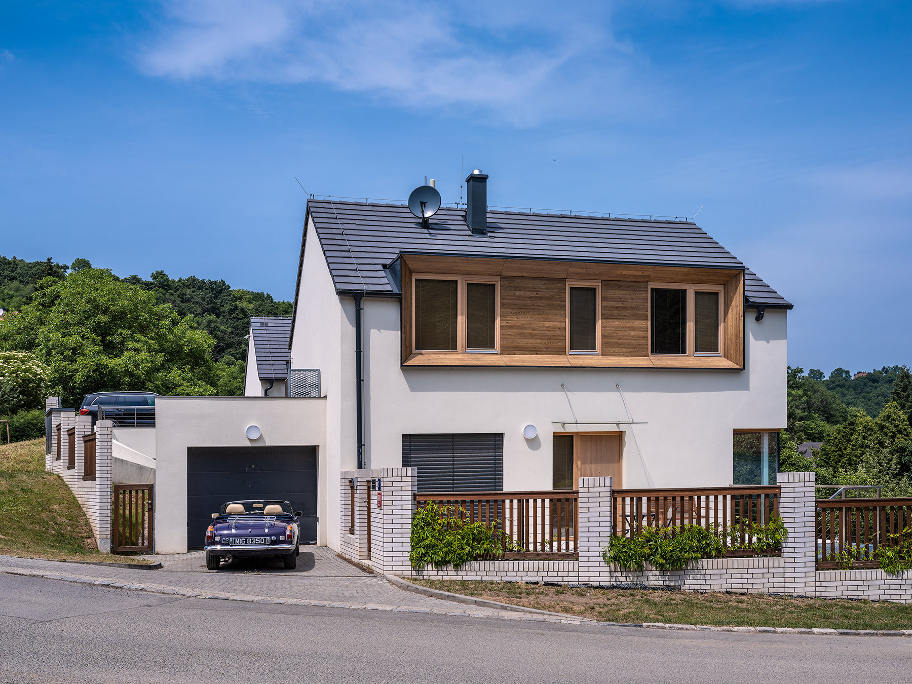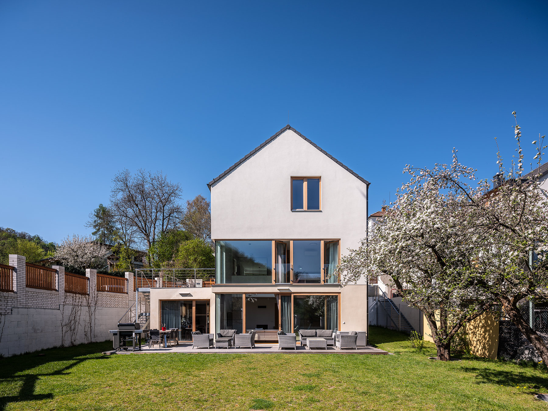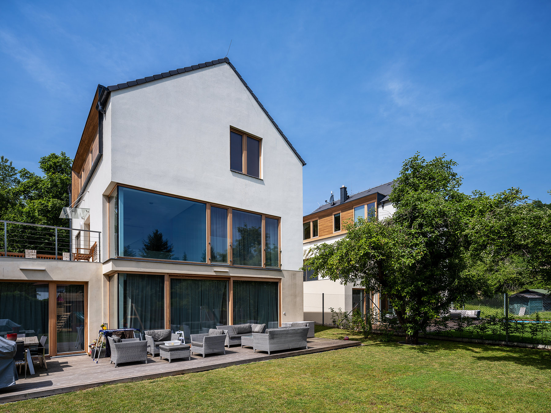 Architekti situaci nápaditě vyřešili prostornými vstupními terasami, které jsou napojeny na příchod z ulice. V případě krajního domu se k ní terasa přimyká ihned, u domu vedlejšího je vše propojeno zakřiveným schodištěm. „Důležitým spojujícím prvkem obou domů je důsledná práce s osazením na terén a zakomponování domu do svahu, propojení zahrady pomocí betonových a ocelových schodišť,“ podotýkají architekti Václav Navrátil a Jan Sedláček ke způsobu vetknutí novostaveb do terénu.