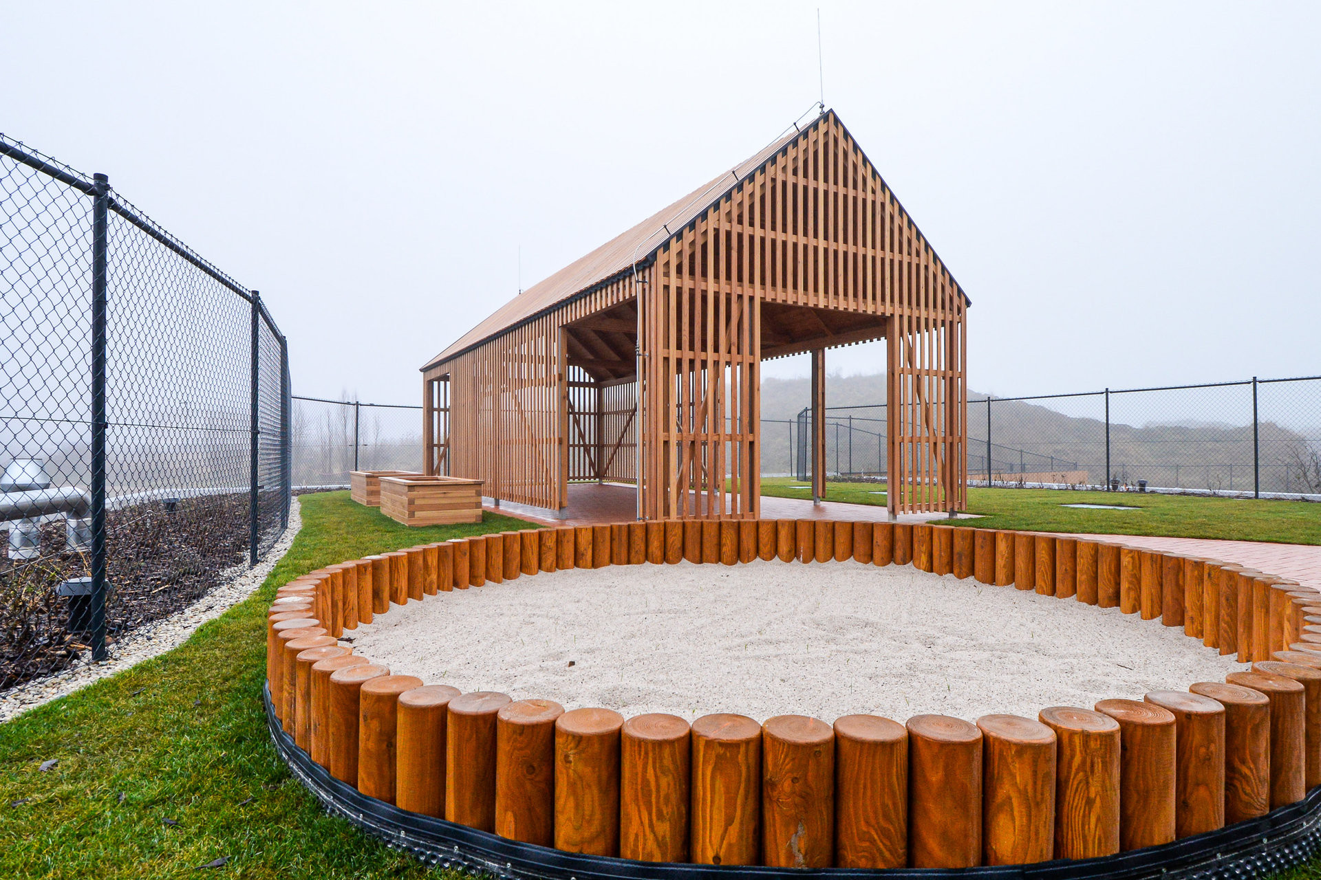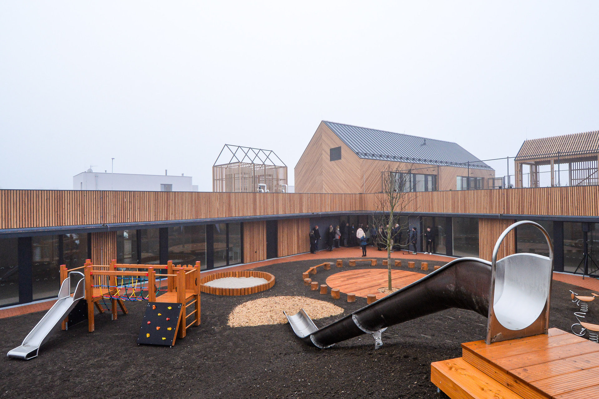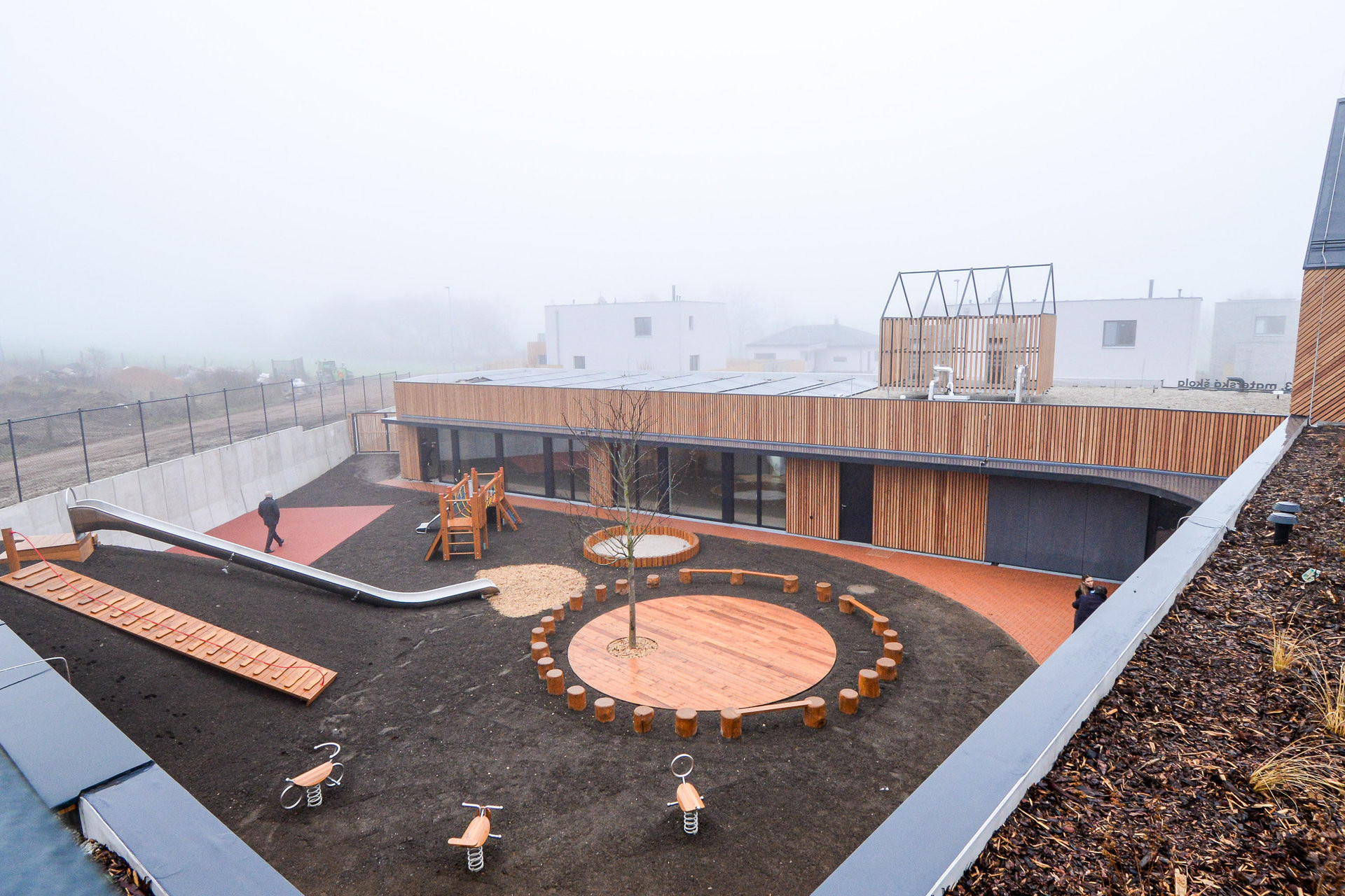 Výrazným prvkem stavby je pobytová střecha se zahradou, fungující jako venkovní učebna, dále vnitřní dvůr a flexibilní učebny využitelné i pro komunitní aktivity. Školka tak nepůsobí pouze jako vzdělávací instituce, ale jako lokální centrum setkávání.