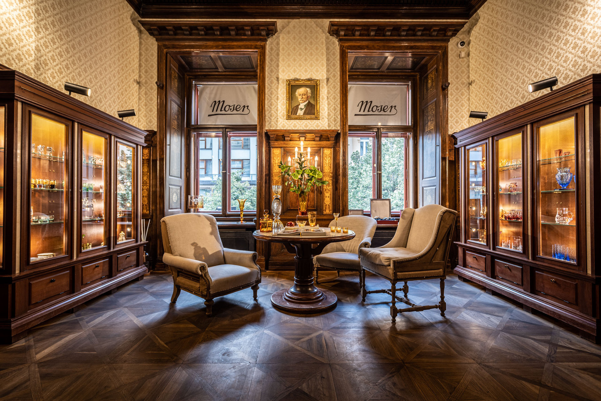 Sto let v centru Prahy, konkrétně Na Příkopě, slaví první pražská prodejna Moser v přízemí paláce Černá růže. Devět let po otevření se rozšířila do prvního patra, do bývalého bytu významné podnikatelské rodiny Bondyových. Vzácný novorenesanční interiér od architekta Josefa Fanty, s vitrážemi, intarzovaným obložením a kachlovými kamny, si uchoval noblesu až dodnes. Prodejní galerii navštívily během století tisíce významných osobností, včetně členů královských rodin, představitelů států či hvězd filmového světa. Prodejní galerie Moser tak patří mezi nejdéle fungující prodejny v Praze na jednom místě.