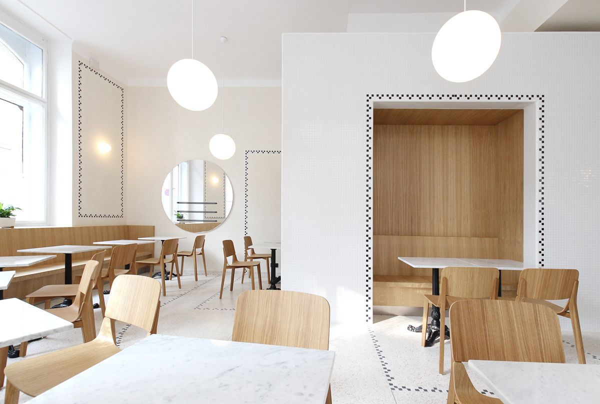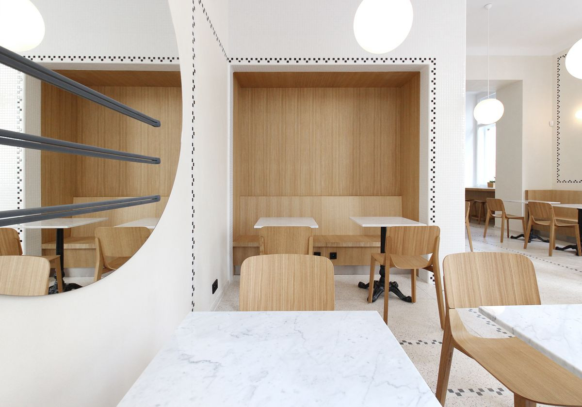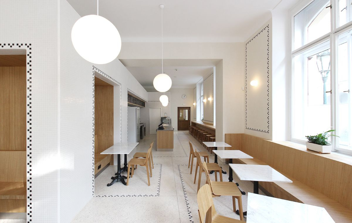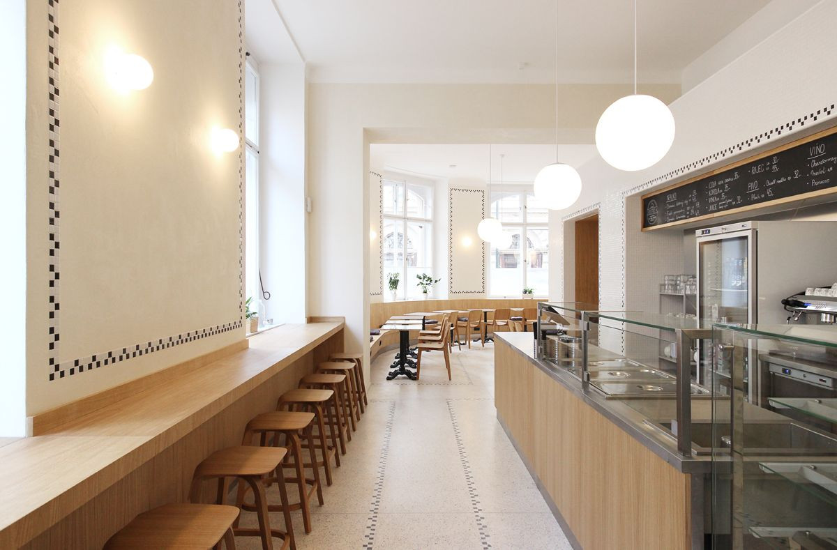 Architekti navrhli renovaci veřejně přístupné části, tedy výdeje a sezení. V interiéru pracují s keramickou mozaikou, která lemováním akcentuje jednotlivé výklenky pro sezení a pro výdej. Lemování se propisuje i do podlahy ze světlého terazza. Vybavení tvoří židle českého výrobce TON, stoly z bílého mramoru s litinovými podnožemi, lavice a pult v přední části bistra jsou truhlářské výrobky z přírodního dubu.