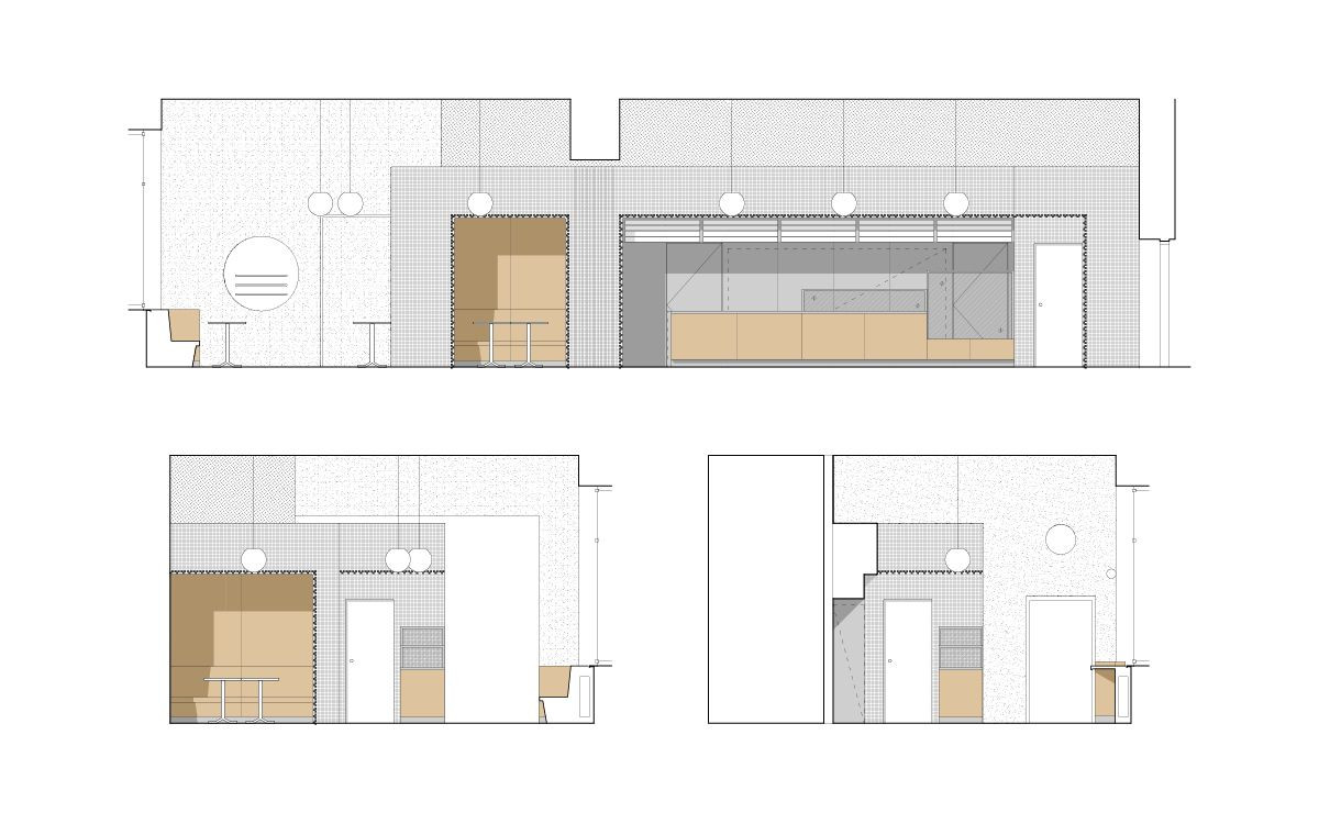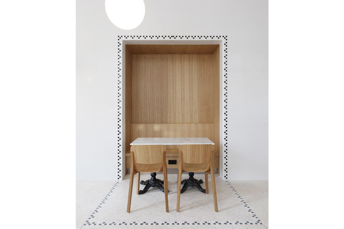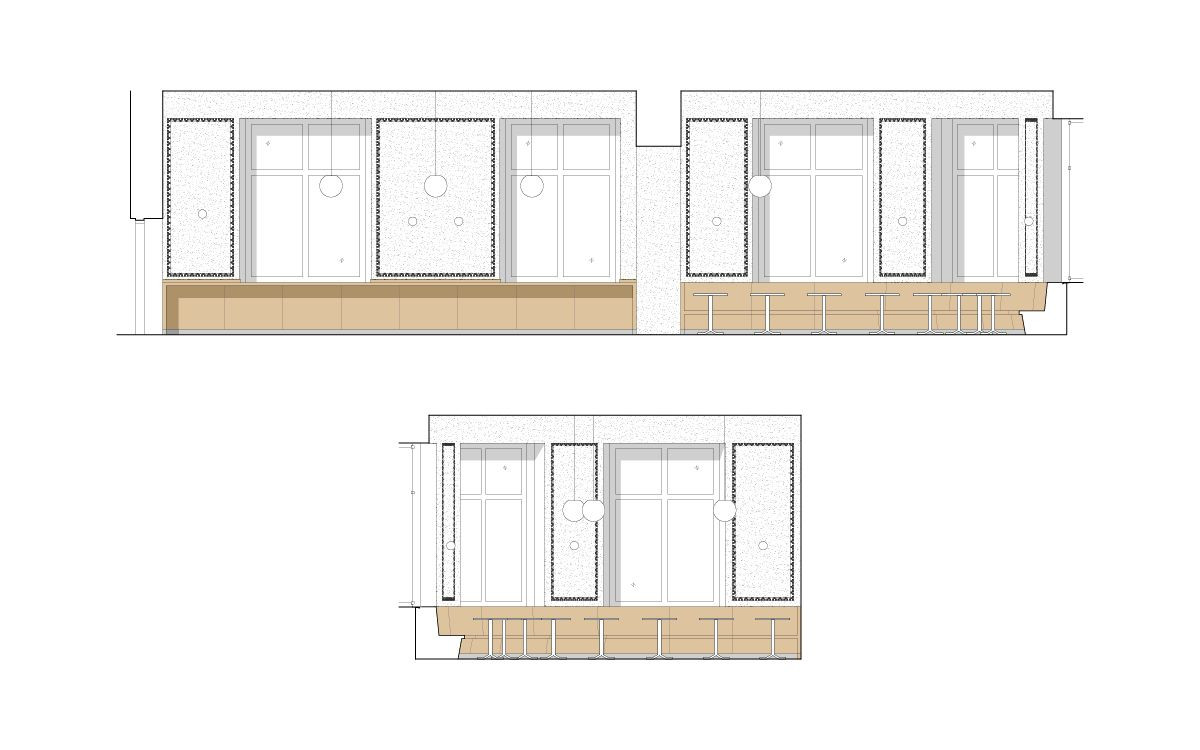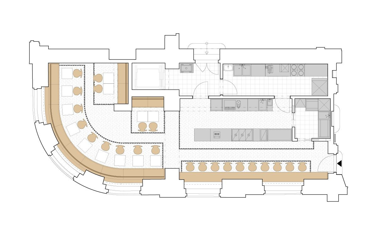 Architekti navrhli renovaci veřejně přístupné části, tedy výdeje a sezení. V interiéru pracují s keramickou mozaikou, která lemováním akcentuje jednotlivé výklenky pro sezení a pro výdej. Lemování se propisuje i do podlahy ze světlého terazza. Vybavení tvoří židle českého výrobce TON, stoly z bílého mramoru s litinovými podnožemi, lavice a pult v přední části bistra jsou truhlářské výrobky z přírodního dubu.