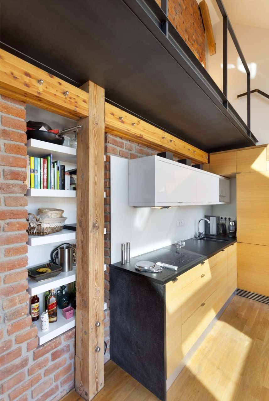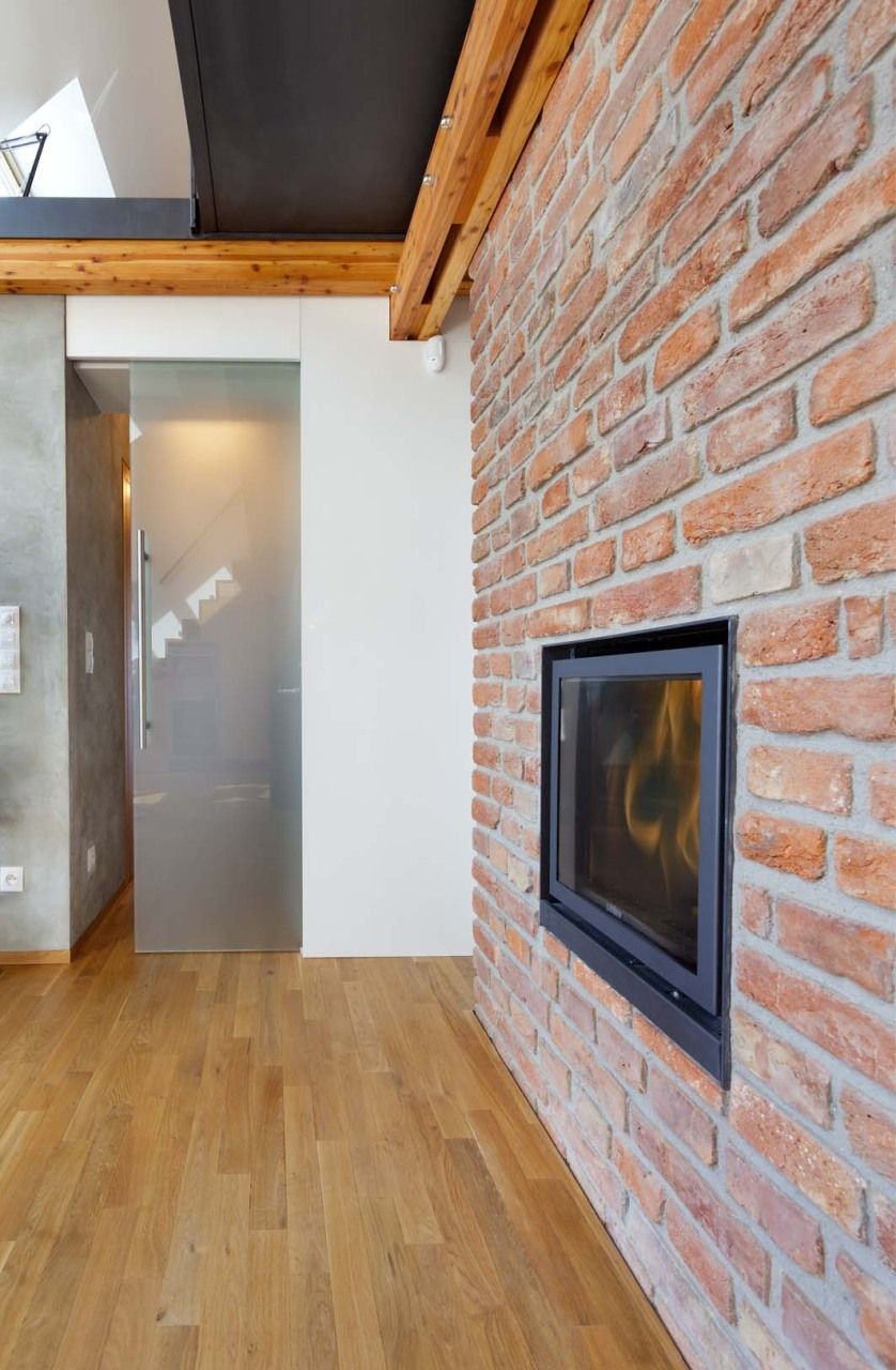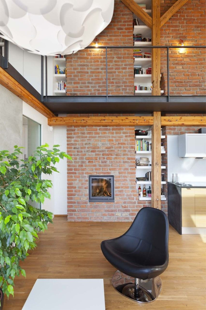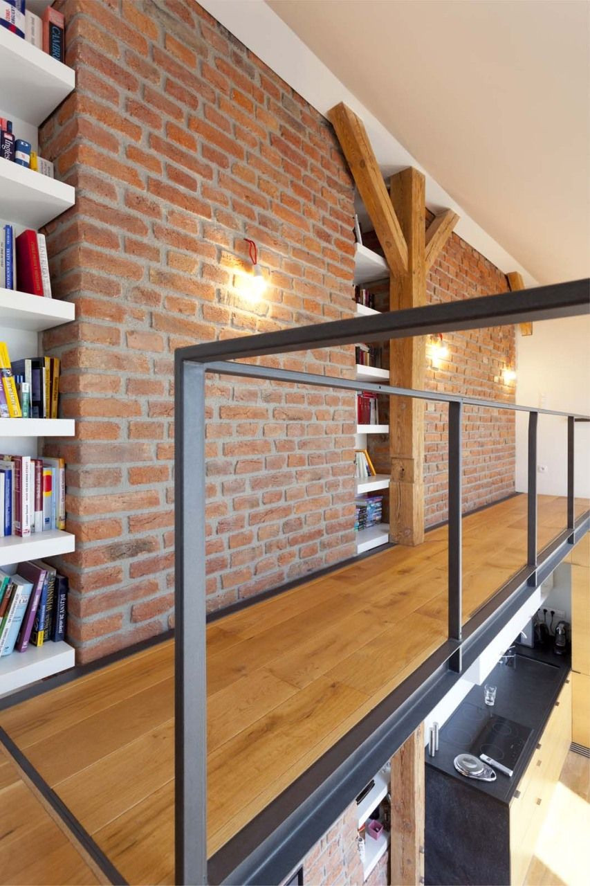 Efektivní nakládání s prostorem demonstruje především řešení masivního dubového schodiště vedoucího na galerii, v jehož jednotlivých stupních jsou integrovány kuchyňské spotřebiče a další úložné prostory. Rovněž celá stěna v ložnici a na galerii je nenápadně řešena jako kompaktní vestavěná skříň. Příjemnou atmosféru bytu zajišťuje také hra materiálů – kromě výrazných dřevěných prvků přiznané trámové konstrukce nebo tmavé ocelové lávky si můžeme všimnout například zajímavého kontrastu původních pálených cihel s čistými konturami lakovaného nábytku.