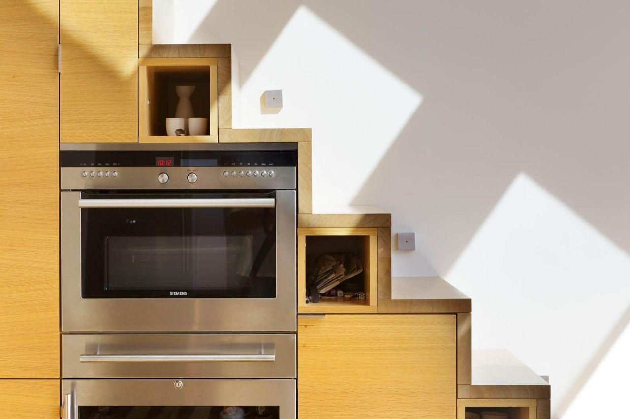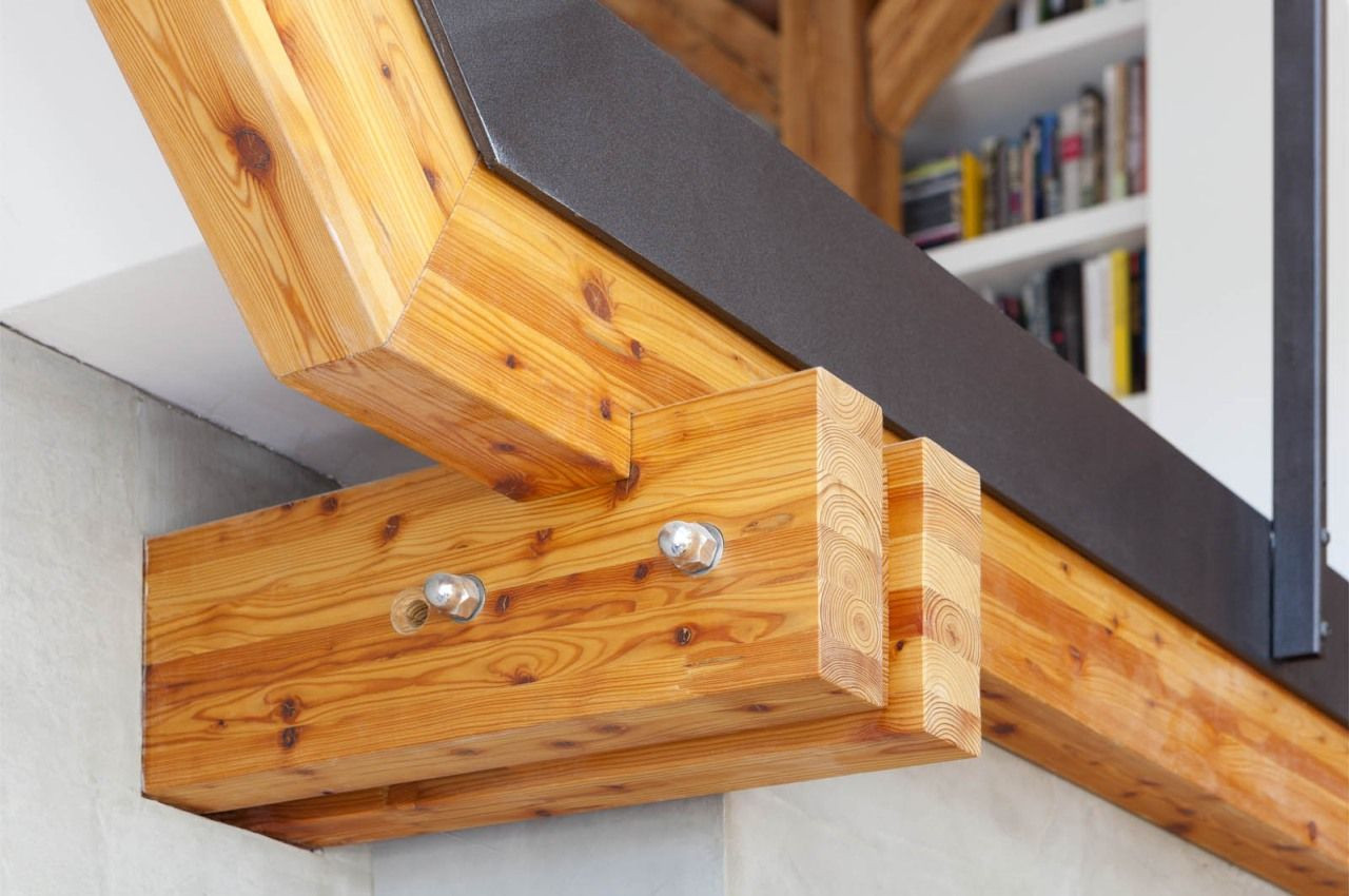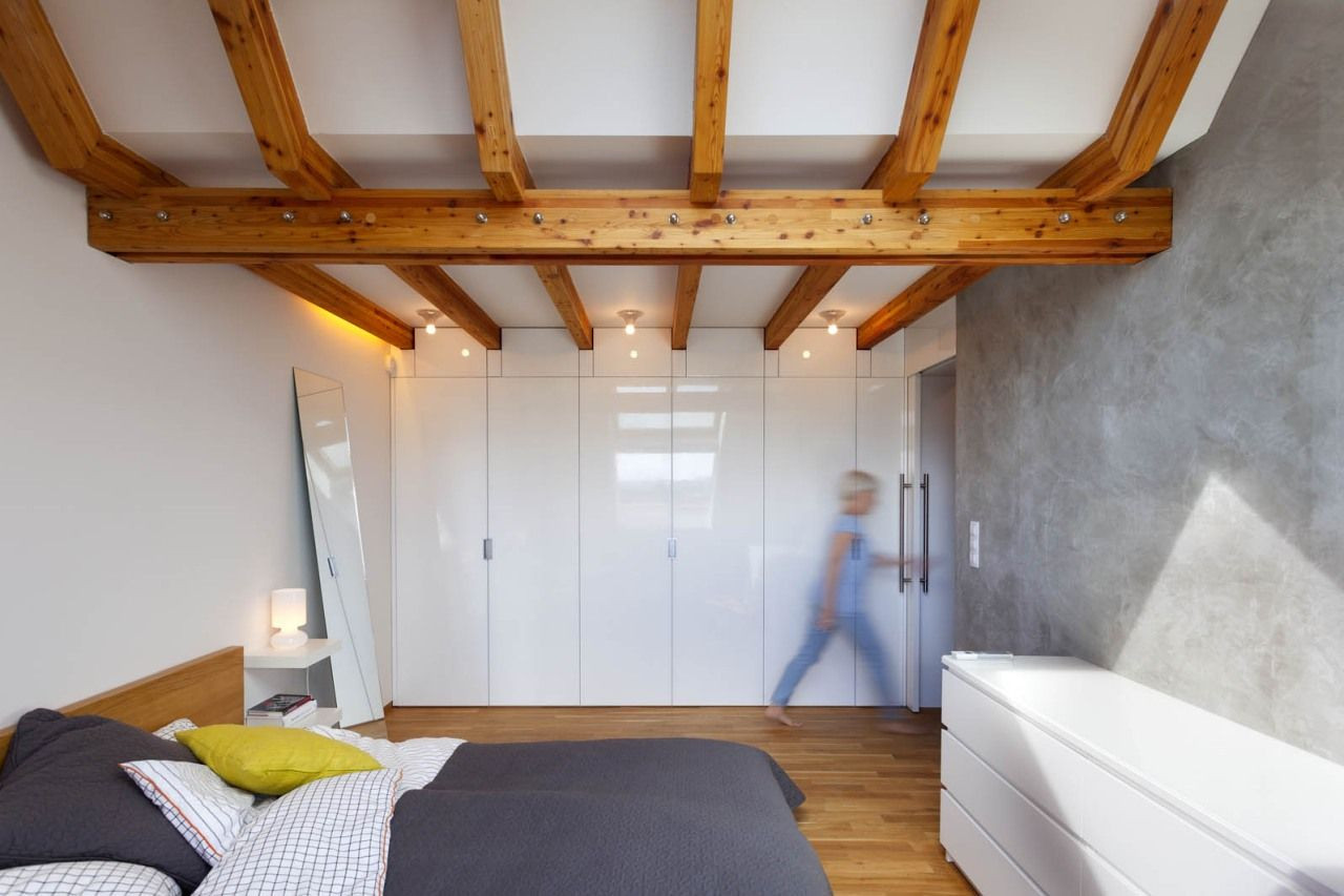 Efektivní nakládání s prostorem demonstruje především řešení masivního dubového schodiště vedoucího na galerii, v jehož jednotlivých stupních jsou integrovány kuchyňské spotřebiče a další úložné prostory. Rovněž celá stěna v ložnici a na galerii je nenápadně řešena jako kompaktní vestavěná skříň. Příjemnou atmosféru bytu zajišťuje také hra materiálů – kromě výrazných dřevěných prvků přiznané trámové konstrukce nebo tmavé ocelové lávky si můžeme všimnout například zajímavého kontrastu původních pálených cihel s čistými konturami lakovaného nábytku.