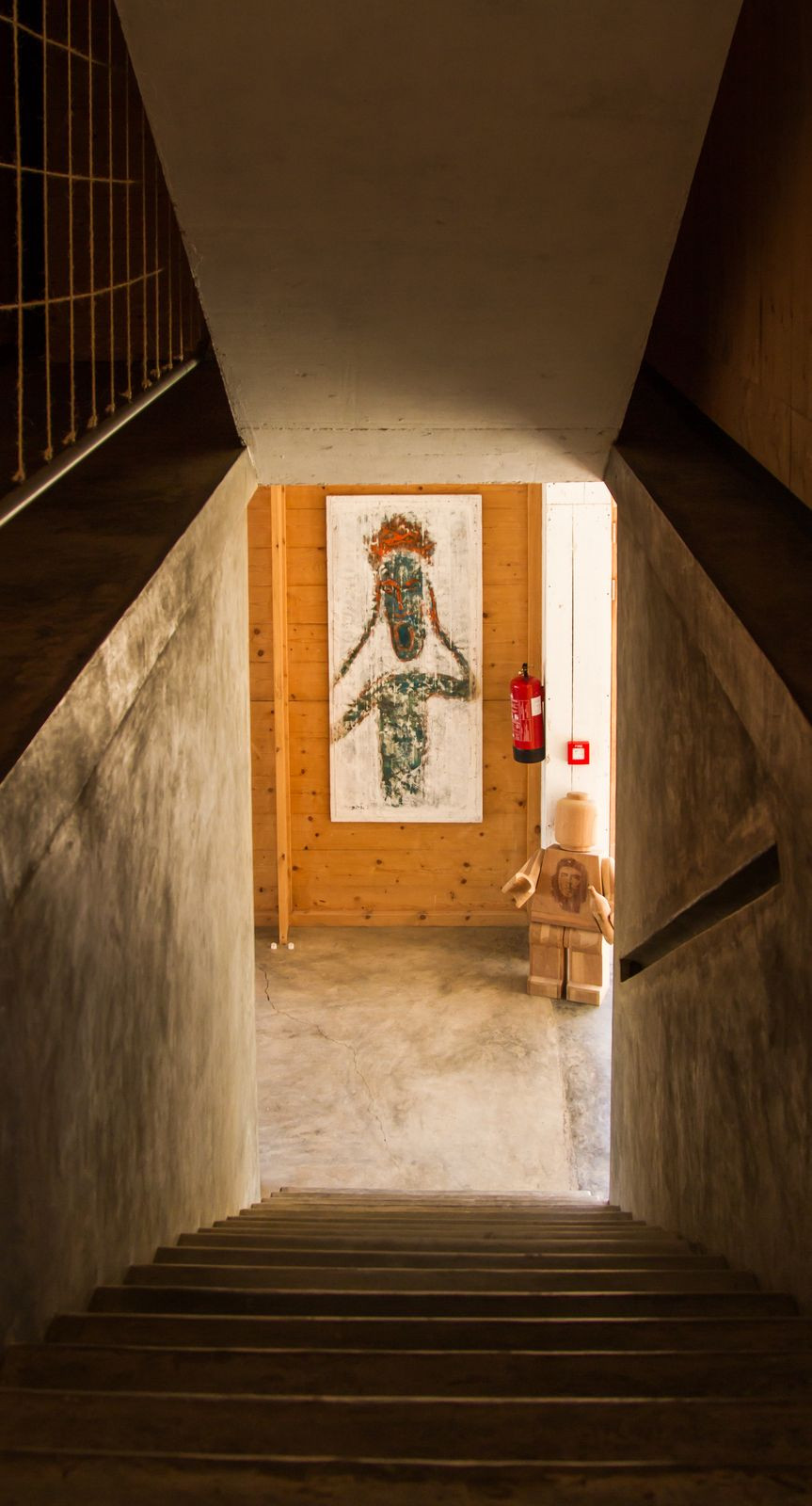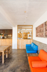 V přízemí se nachází recepce, kuchyně a restaurace. Betonová podlaha a jednoduchý nábytek, který je vyroben z recyklovaného dřeva jsou hlavní dekorací tohoto otevřeného prostoru.