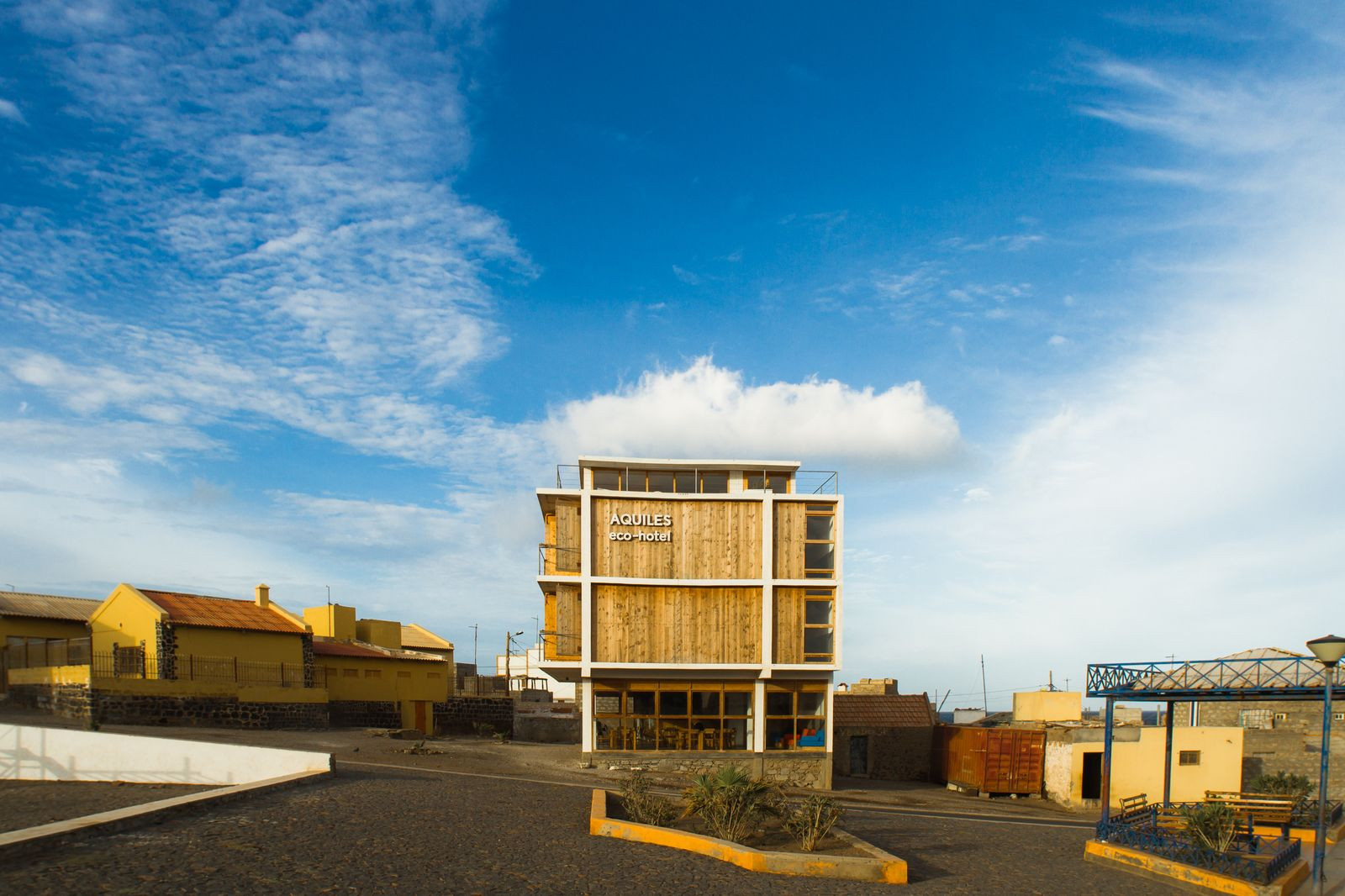 Na hlavním náměstí malé rybářské vesničky na ostrově Sao Vicente se nachází Aquiles Eco Hotel. Jeho stavba se snaží zapadnout mezi místní architekturu, styl má jednoduchý, syrový a flexibilní. Komunikuje s okolními domy a malými stavbami, které se tu nachází.