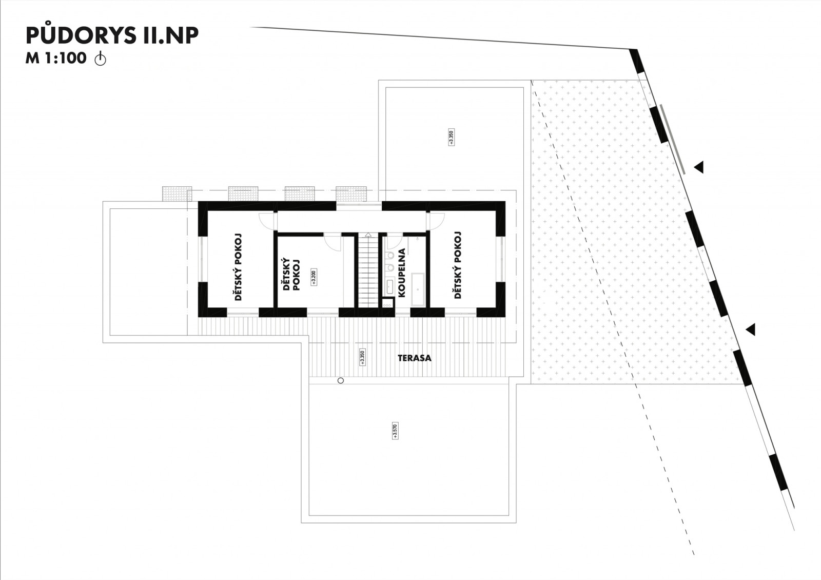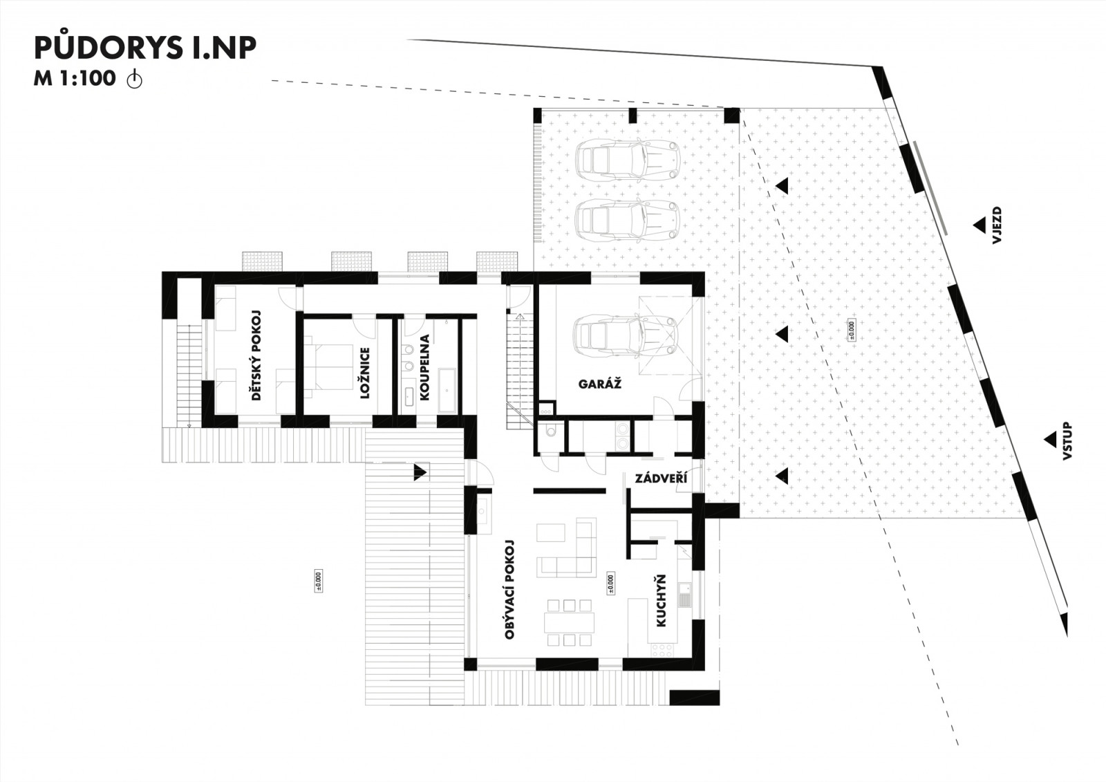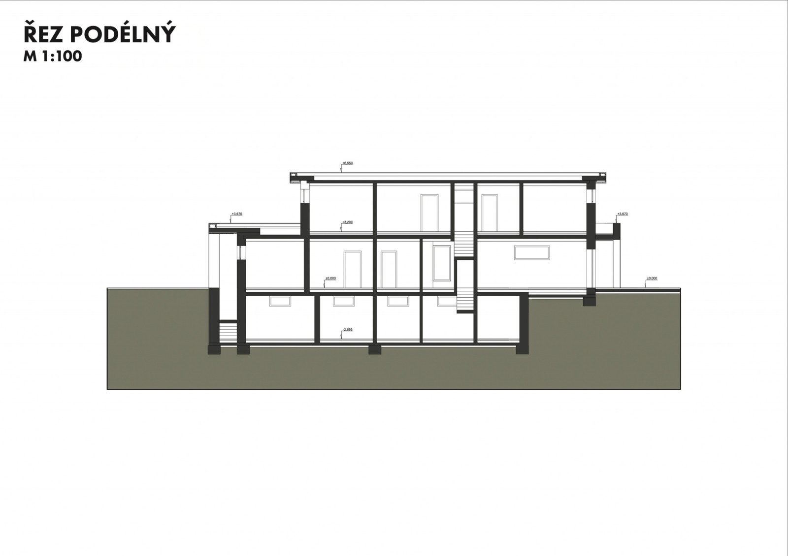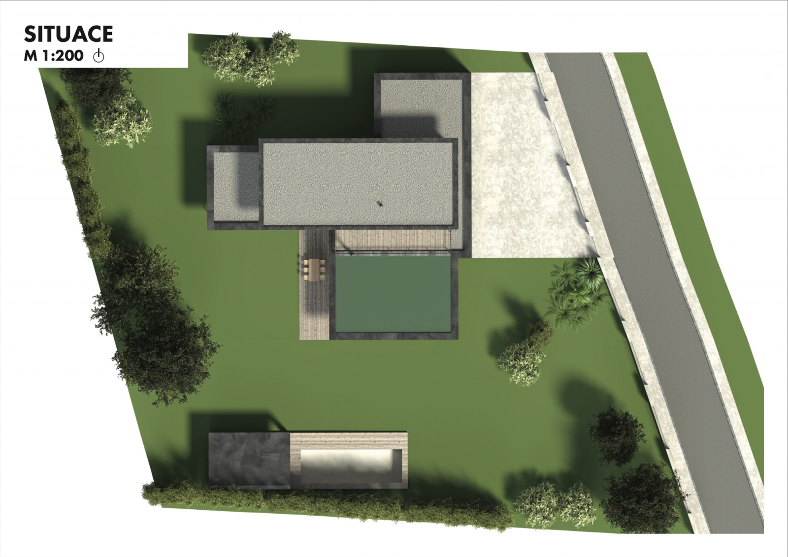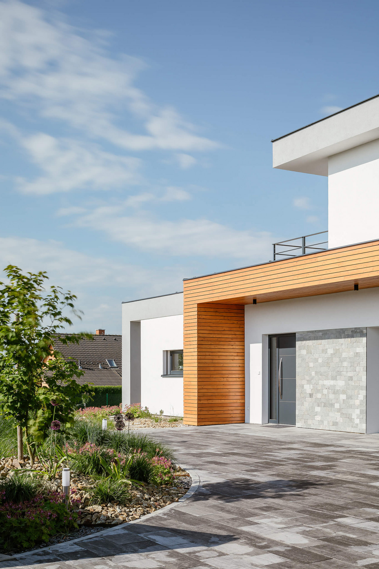 Dům stojí na rovinatém pozemku a skládá se ze třech kubických hmot. „Základní myšlenkou domu jsou tři hmoty – přízemí, přístřešek pro vozidla a druhé nadzemní patro. Propojením těchto tří celků se střešními přesahy vznikla finální hmota půdorysného tvaru L,“ vysvětlují architekti Dan Merta a David Lukas.