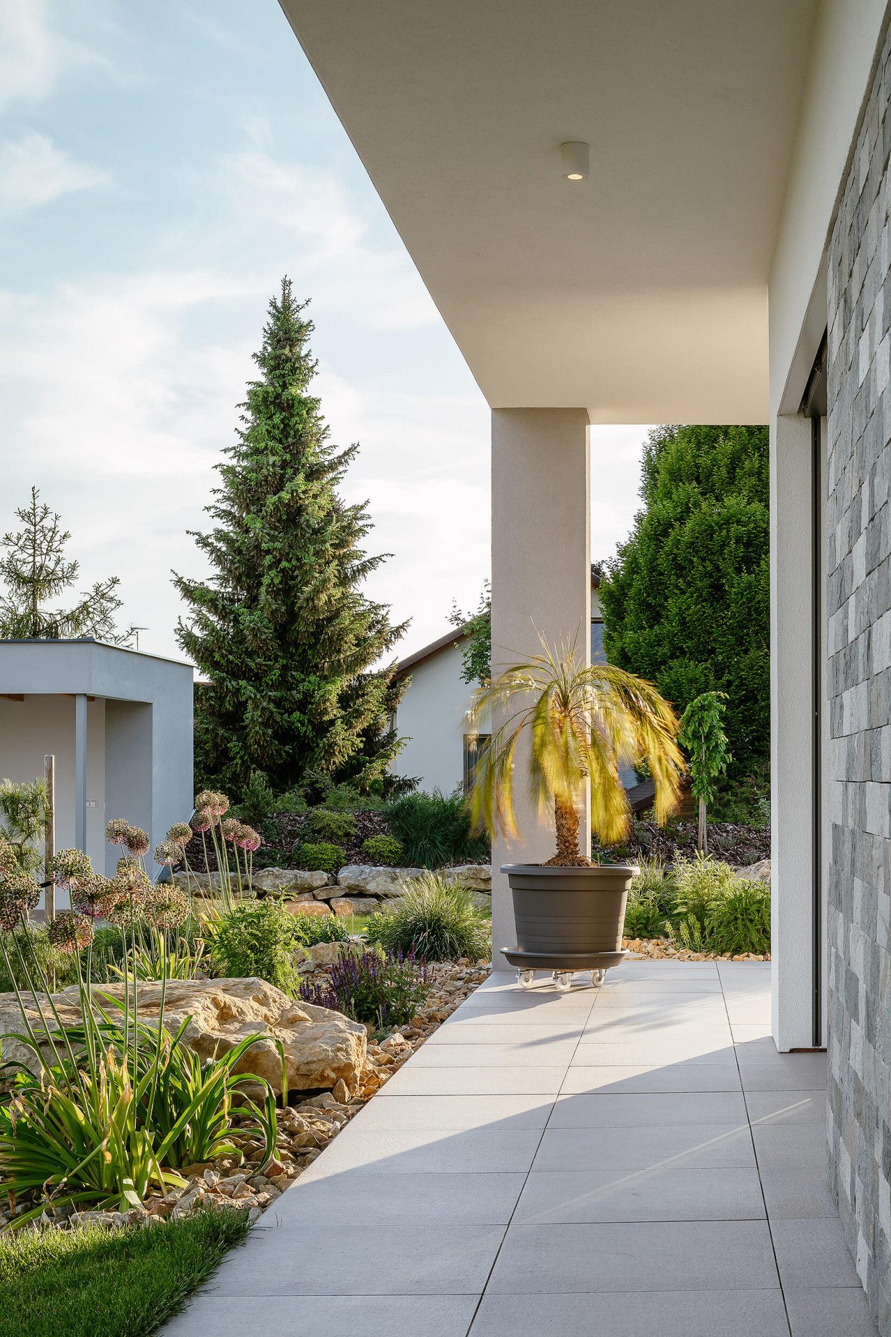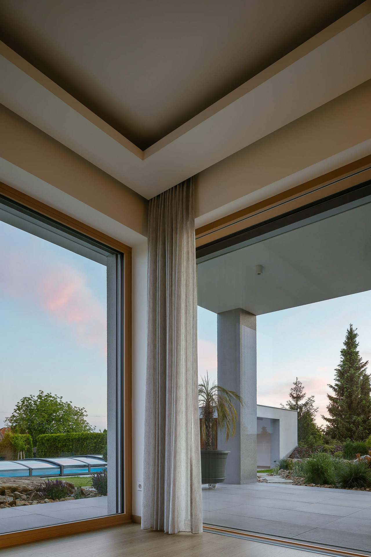 Zalomený půdorys umožňuje otevřít interiér do soukromé zahrady, na níž se nachází s vilou sladěný zahradní domek a bazén. Hlavní obytný prostor lze snadno propojit s venkovní dlážděnou terasou, kterou kryjí přesahy střechy. Vzniká tak další místo pro aktivity, které lze podnikat na hranici interiéru a exteriéru. Ložnice, koupelny a dětské pokoje architekti umístili do západního „klidového“ křídla a také do prvního patra, kam vede centrálně umístěné schodiště.