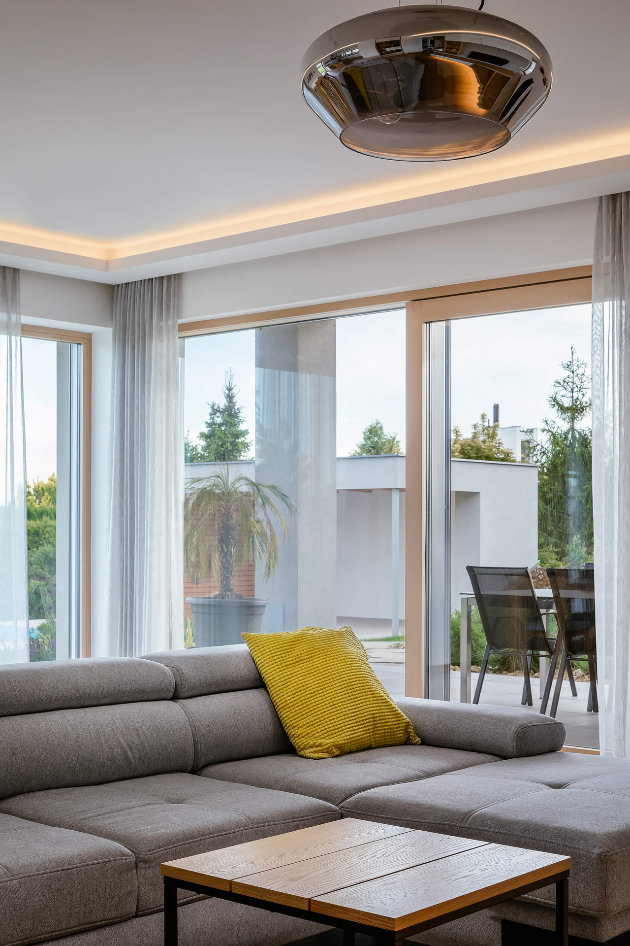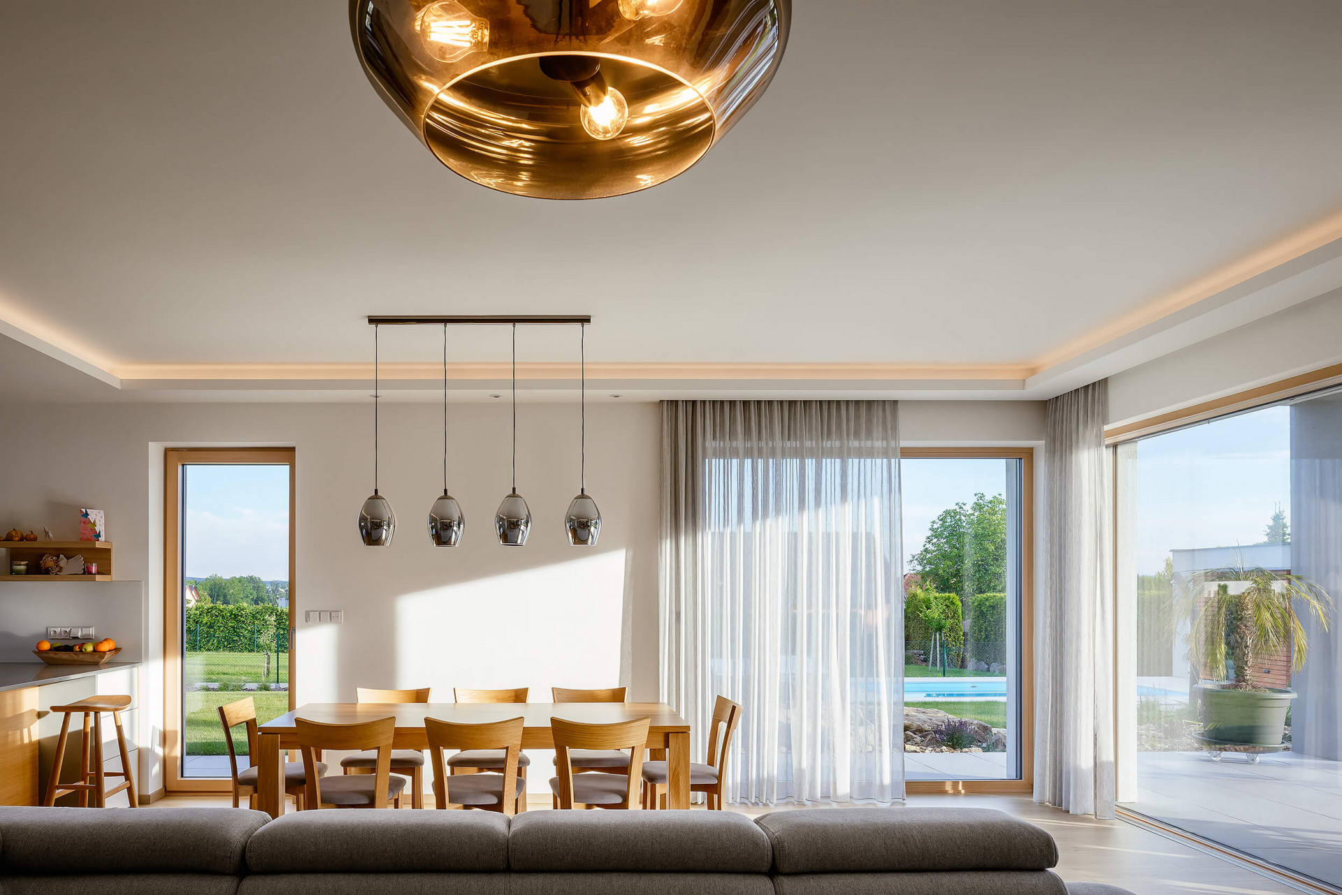 Energeticky úsporná vila s výraznými střešními přesahy přináší prostory na pomezí interiéru a exteriéru