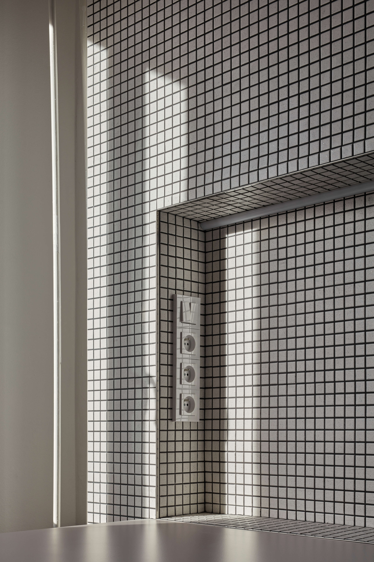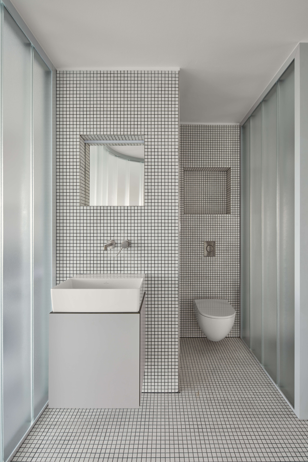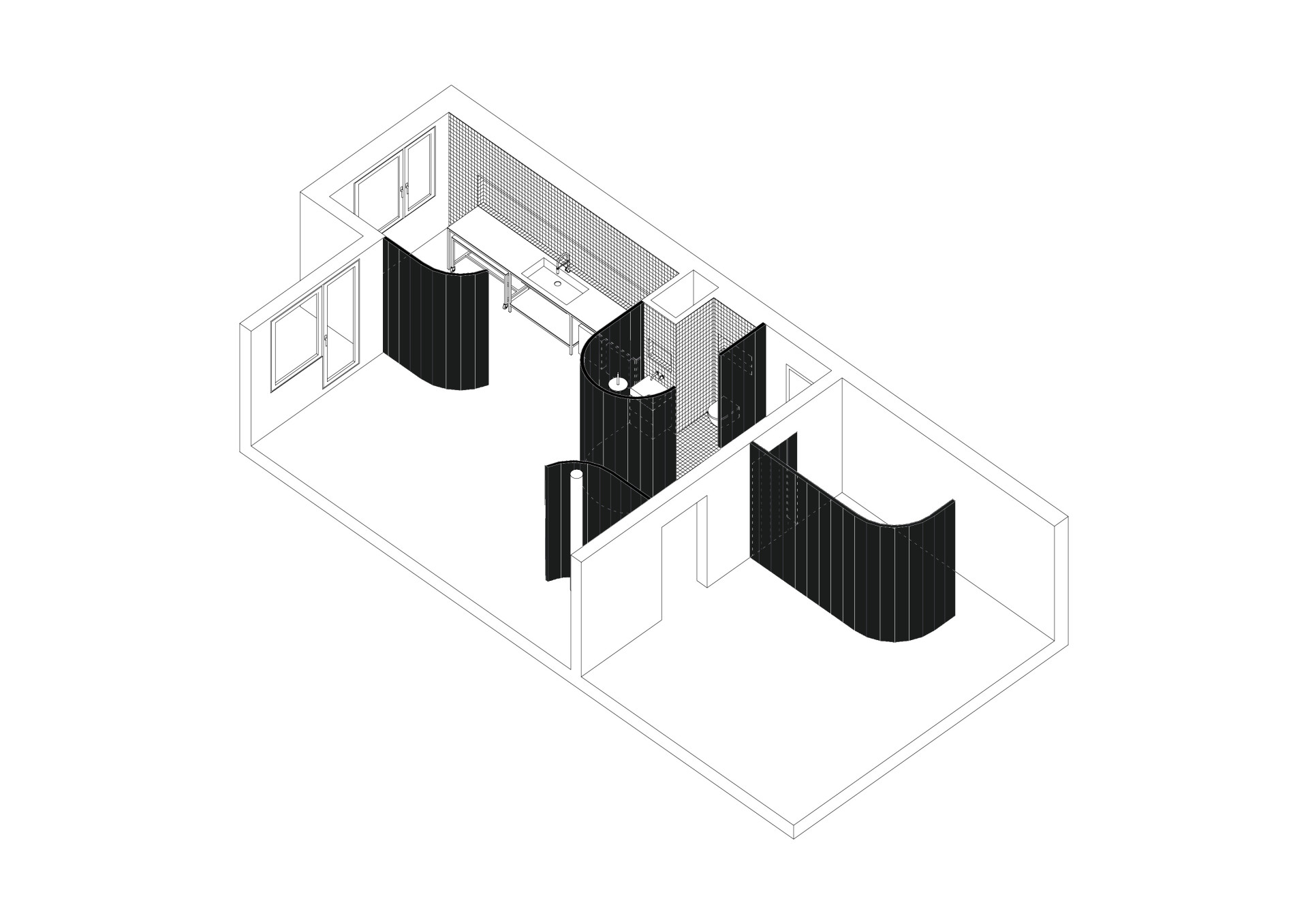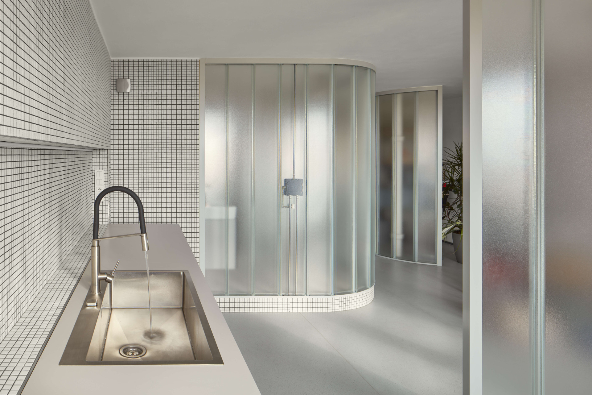 Autoři tak copilitovými hokejkami „rozmlžili hranice a funkce“ mezi jednotlivými zónami ložnice s šatnou, kuchyní s jídelnou a pracovnou. Patrně nejpozoruhodnějším prvkem se ale stala koupelna, která sprchou půlkruhem vstupuje přímo do centra obývacího prostoru na místě bývalé koupelny. Sprchující osobu dělí od obýváku pouze průsvitná linie skla, po které stéká voda. Pro někoho jistě příliš, pro klienta, kterému je byt ušit na míru, ale naopak splnění přání. A tak je to správně.