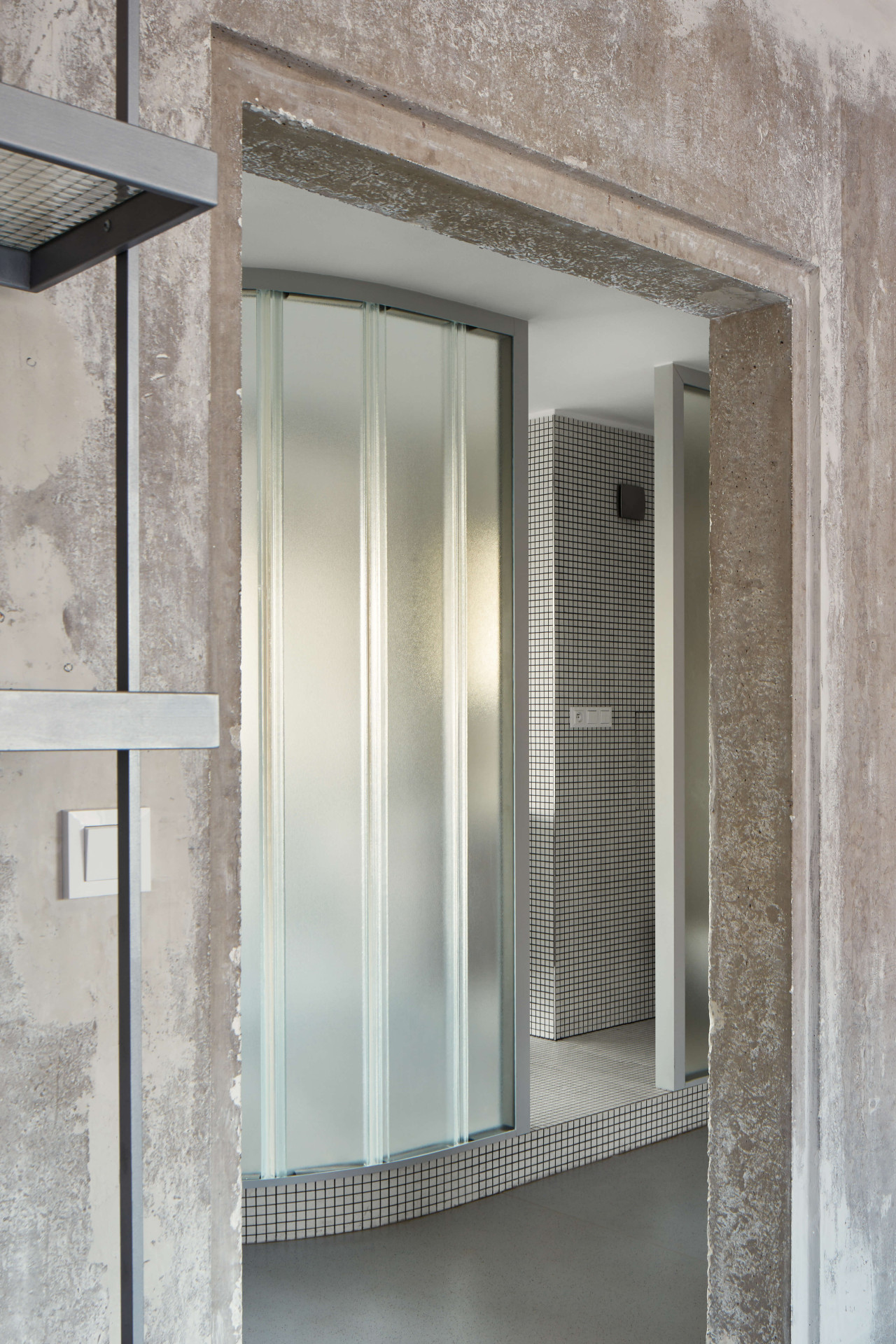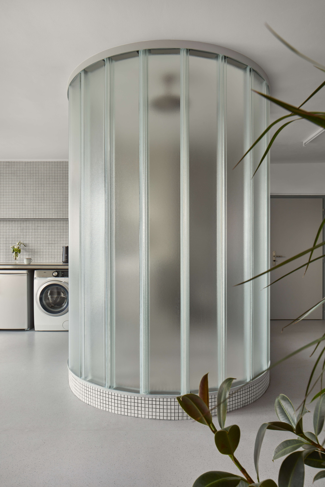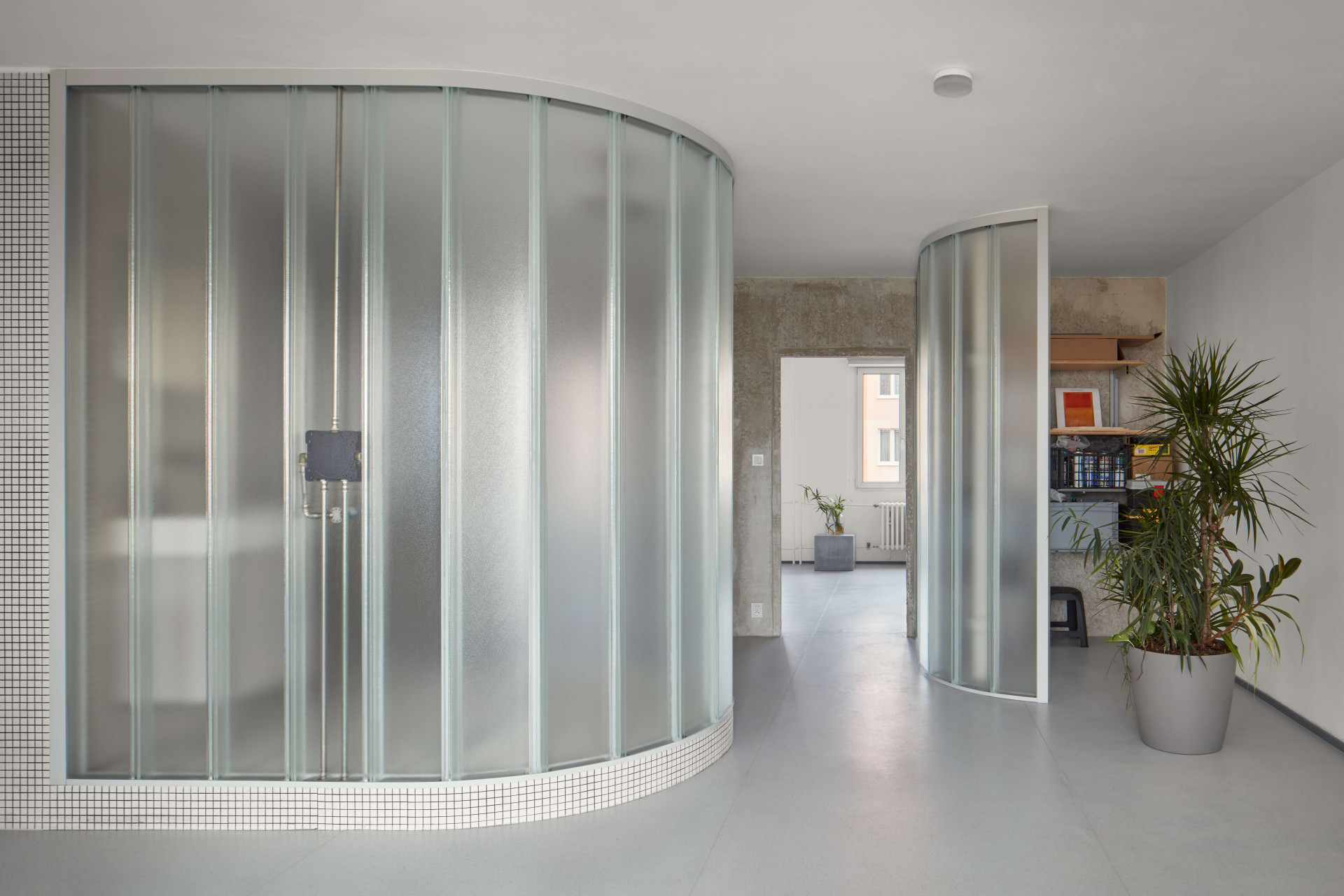 Právě světlo bylo jedním z klíčových elementů toho, proč autoři pro nové aditivní dělící prvky zvolili materiál copilit. Vysoké skleněné profily vytvářejí transparentní příčky, které matně rozmazávají dění na druhé straně, ale plně nechávají prostoupit světlo všemi kouty půdorysu. Temný byt se nyní stává světelným prostorem, který se proměňuje v čase. A aby nové dělící prvky nepůsobily v prostoru „invazivně“ rozhodli se je namísto ostrých úhlů zaoblit, aby jimi tak jako světlo, volně proplouval i prostor. Vznikla tak velmi netradiční koupelna, a „tři hokejky“.