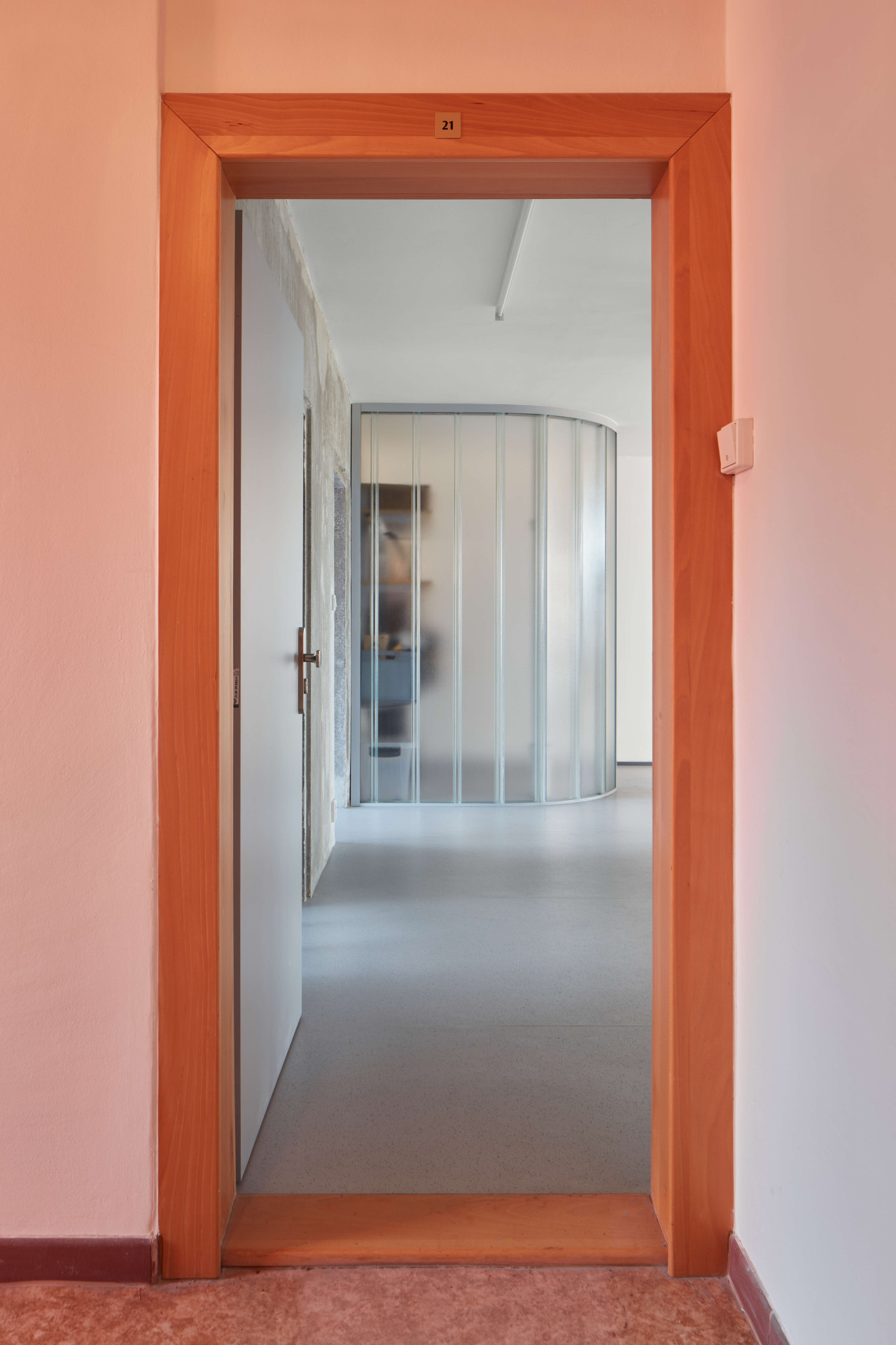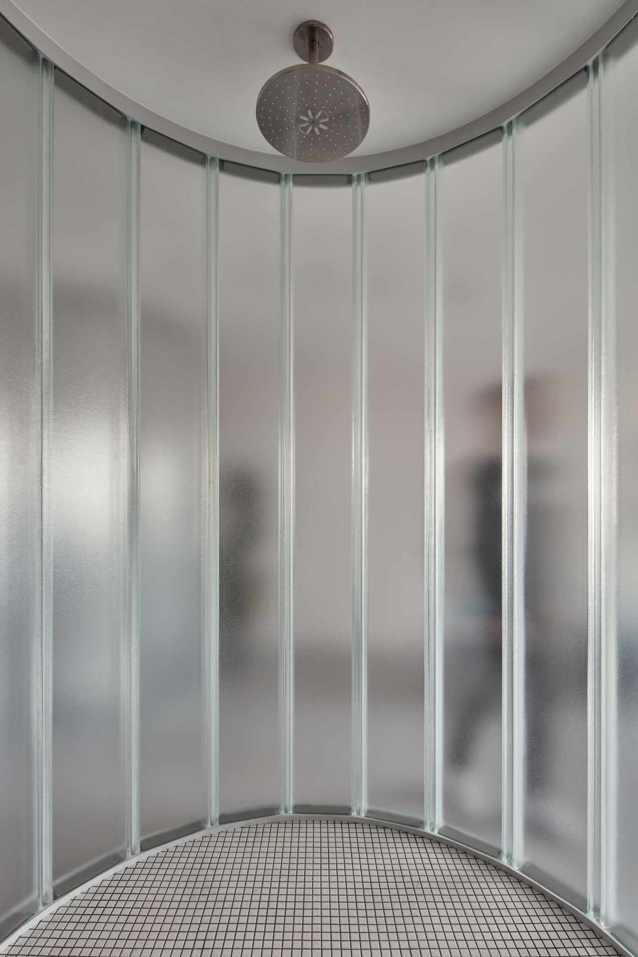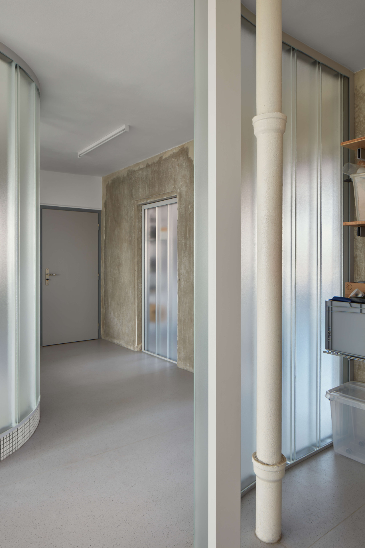 Právě světlo bylo jedním z klíčových elementů toho, proč autoři pro nové aditivní dělící prvky zvolili materiál copilit. Vysoké skleněné profily vytvářejí transparentní příčky, které matně rozmazávají dění na druhé straně, ale plně nechávají prostoupit světlo všemi kouty půdorysu. Temný byt se nyní stává světelným prostorem, který se proměňuje v čase. A aby nové dělící prvky nepůsobily v prostoru „invazivně“ rozhodli se je namísto ostrých úhlů zaoblit, aby jimi tak jako světlo, volně proplouval i prostor. Vznikla tak velmi netradiční koupelna, a „tři hokejky“.