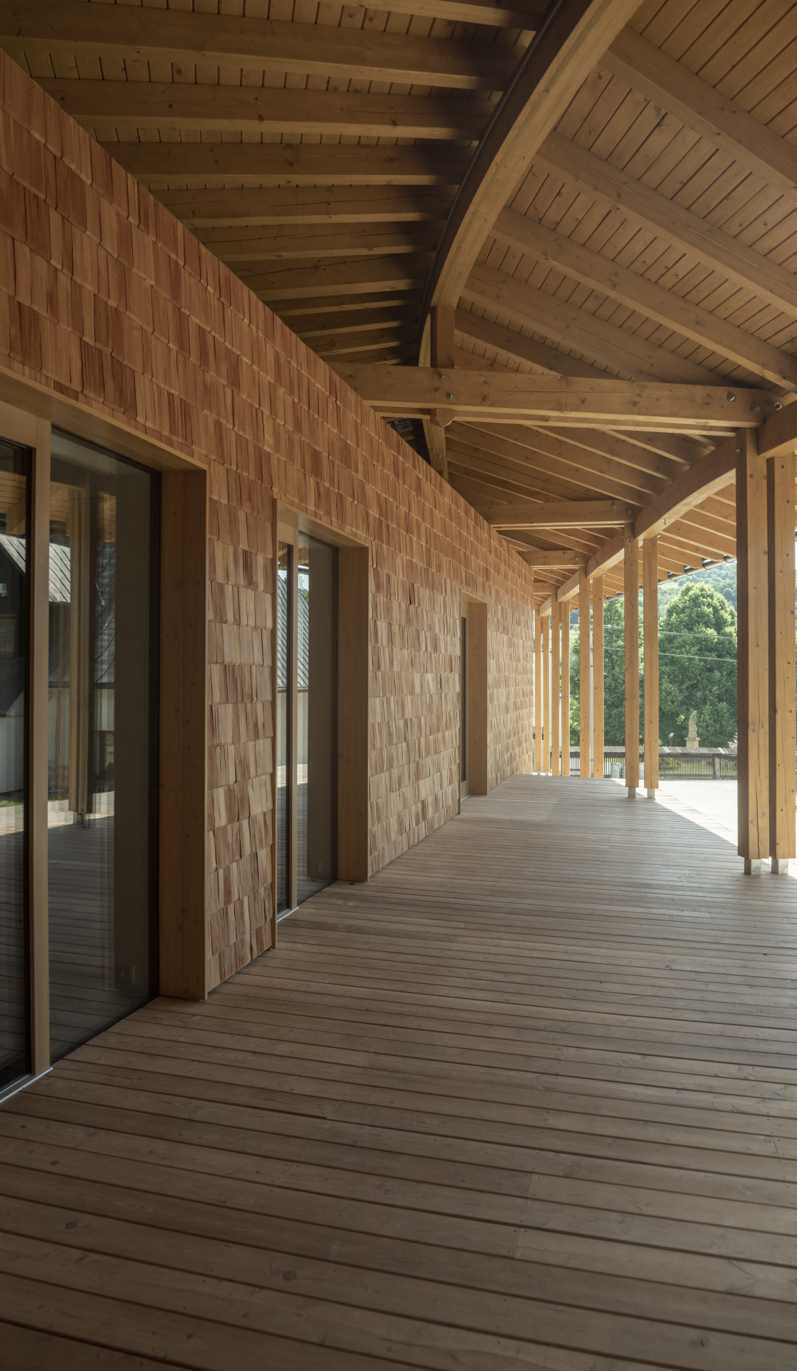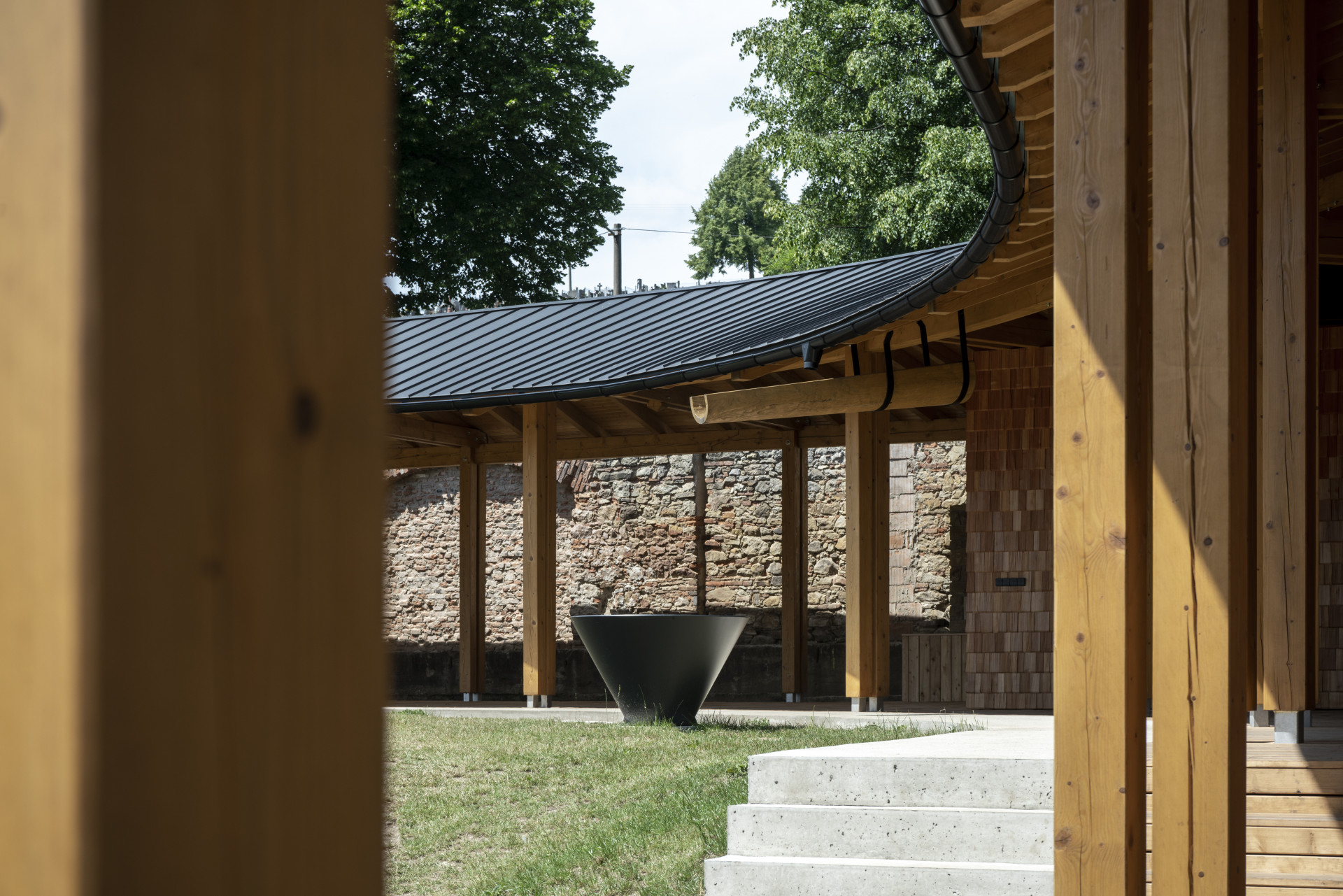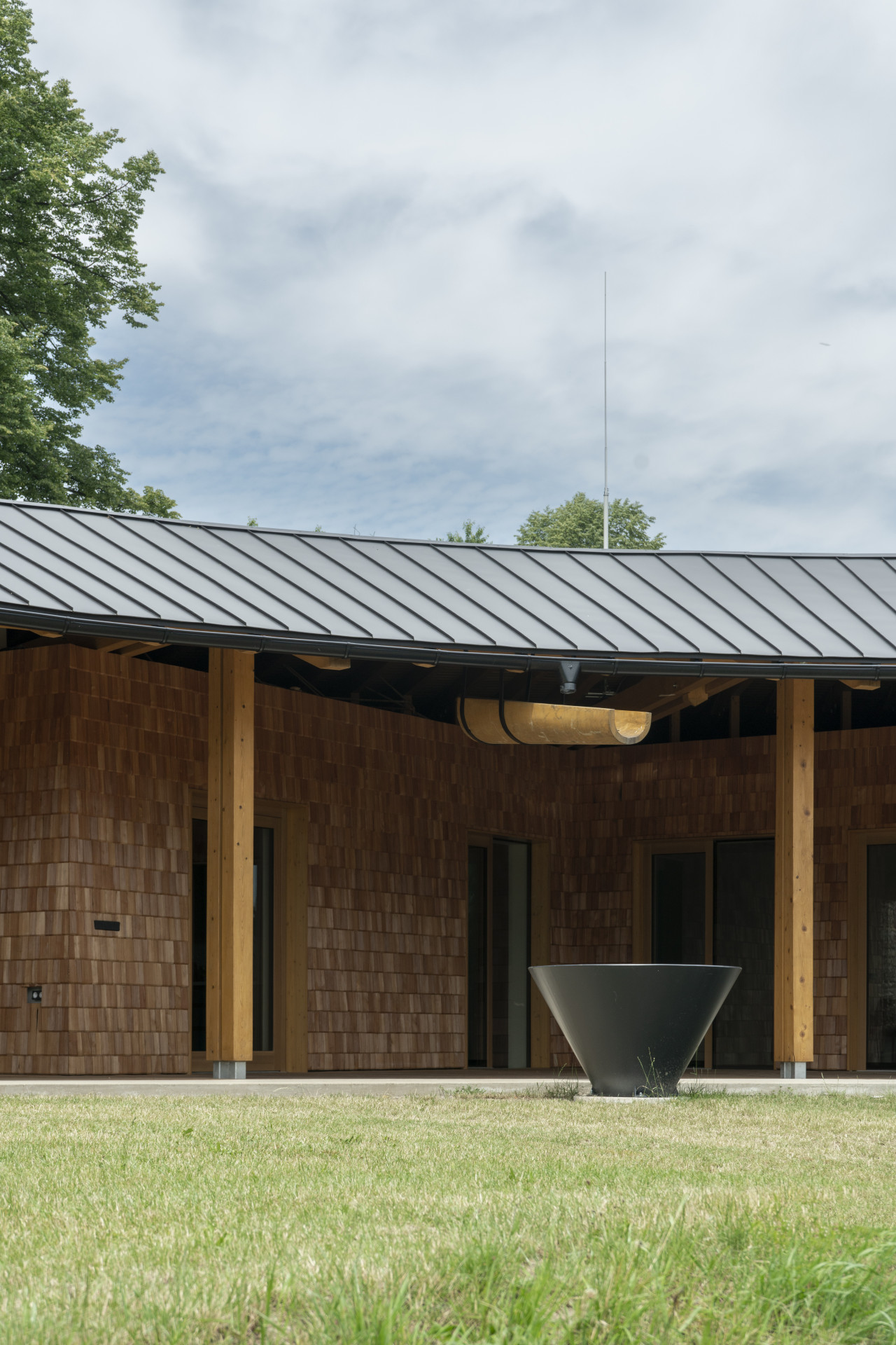 „Venkovní část tvoří sloupková vaznicová konstrukce z jedle a smrku, terasa je modřínová. Zakřivené vazníky jsou z jedlových lepených prvků. Obklad je štípaný šindel z českého modřínu na dřevěném roštu. Konstrukce sálu je z keramického střepu,“ popisují architekti konstrukční a materiálové řešení stavby.