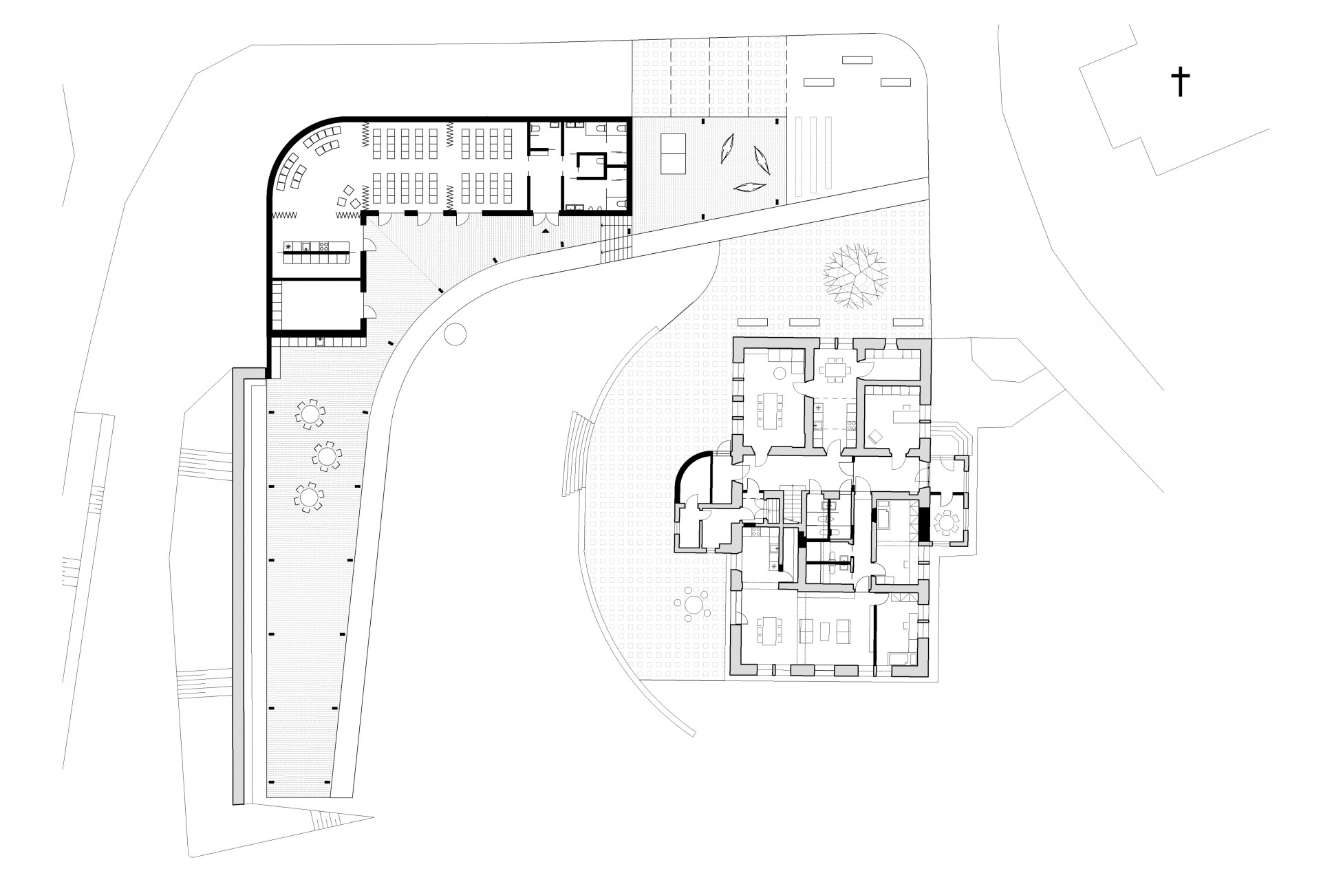 Novostavba vznikla na místě původního kulturního centra z 50. let. „Společenský sál pomyslně uzavírá parcelu, propojuje její části a vytváří prostranství pro venkovní aktivity,“ přibližují svůj návrh architekti Jan Vojtíšek a Jakub Staník.
