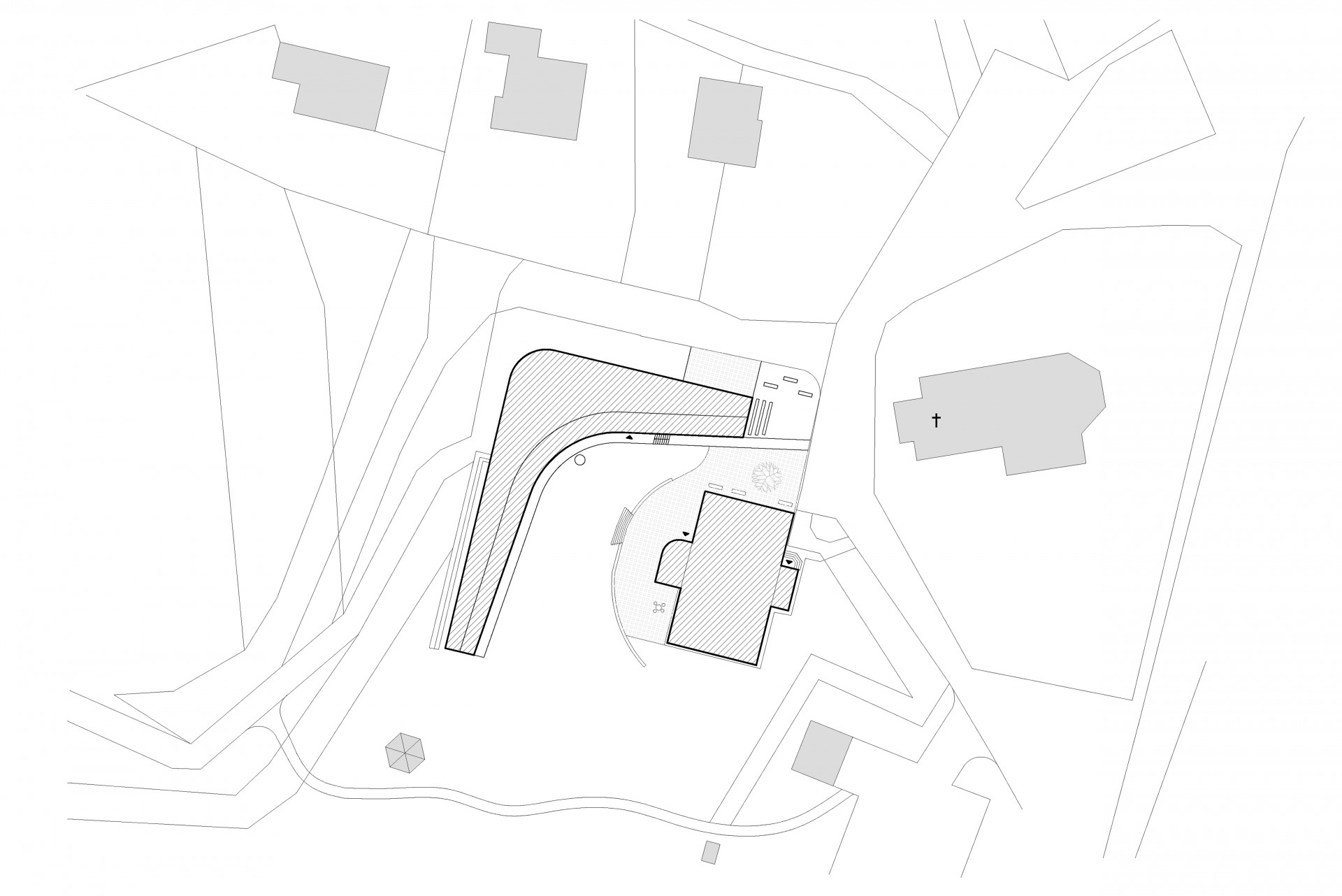 Farní centrum má svým rozložením navozovat dojem procesní cesty. Vše začíná upraveným prostranstvím před kostelem, pokračuje pod střechou podél společenského sálu a končí u torza zdi bývalého hospodářského stavení. Při pohledu ze silnice, která farní centrum z jedné strany obtáčí, objekt funguje jako hradba udržující klid v zahradě a na kryté terase.