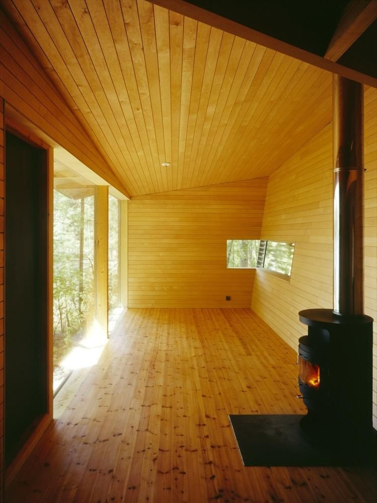 Součástí stavby je obytná místnost, sauna a mezi nimi umístěná venkovní odpočinková zóna. Jednotlivé části jsou spojeny valbovou střechou z překližky. Přístup do budovy, vznášející se na břehu na ocelových podpěrách, je přes rampu ze dřeva a oceli.