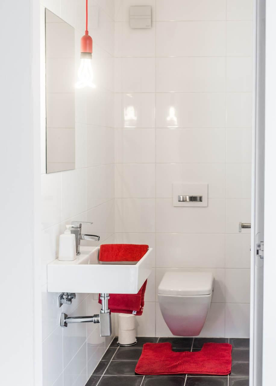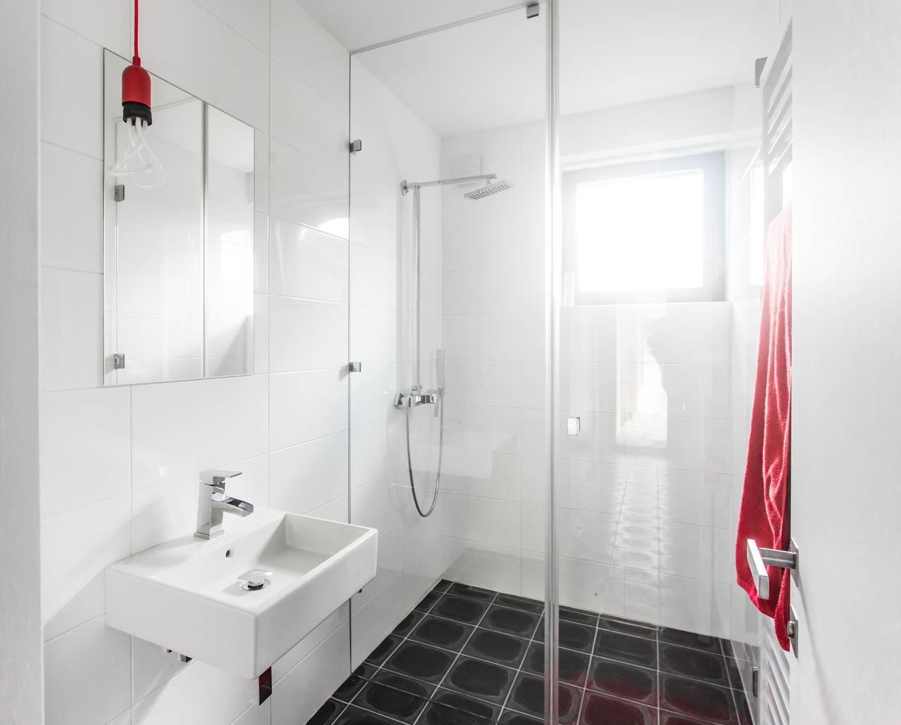 Pohled od interiéru je opravdu netradiční, protože byl vytvořen kompletně na míru. Za vstupními dveřmi bez zámku vás okolo pokoje pro hosty povede čedičová dlažba až k srdci domu. Velkorysý hlavní obytný prostor má ve svém středu červeně zářící schodiště. Jeho tubus je kompletně obložený akátovým dřevem, stejným, jaké je na podlaze. Architekti řešení nazvali „nakousnutým jablkem“.