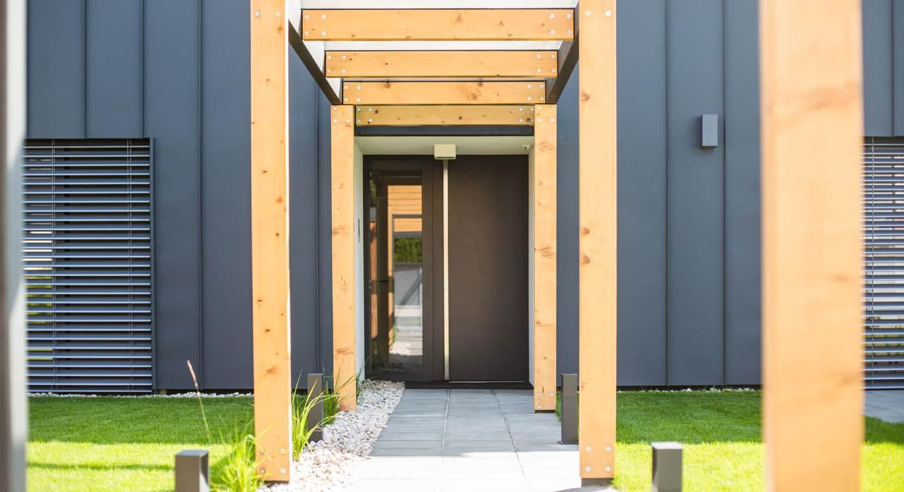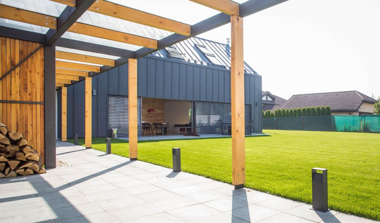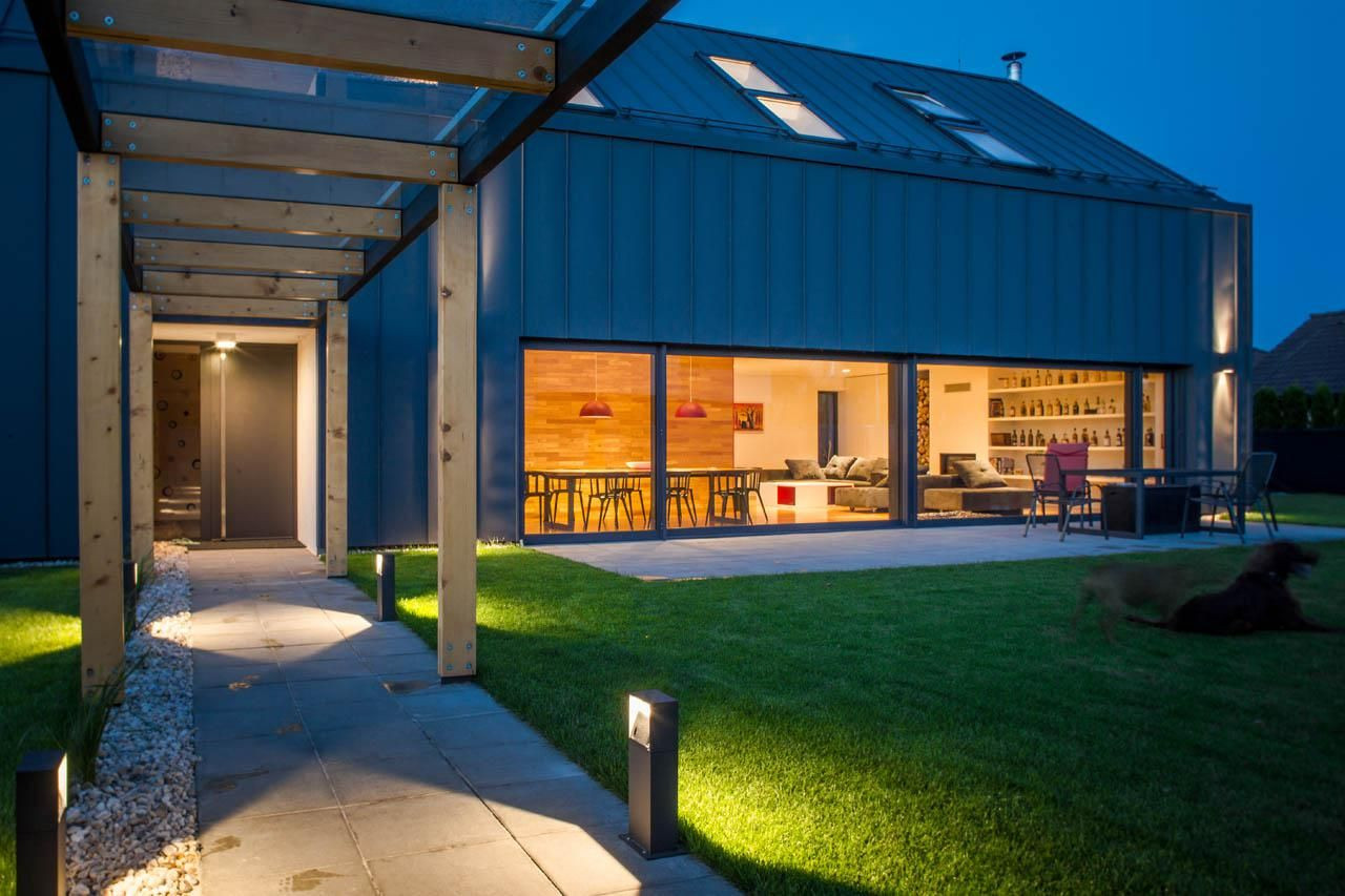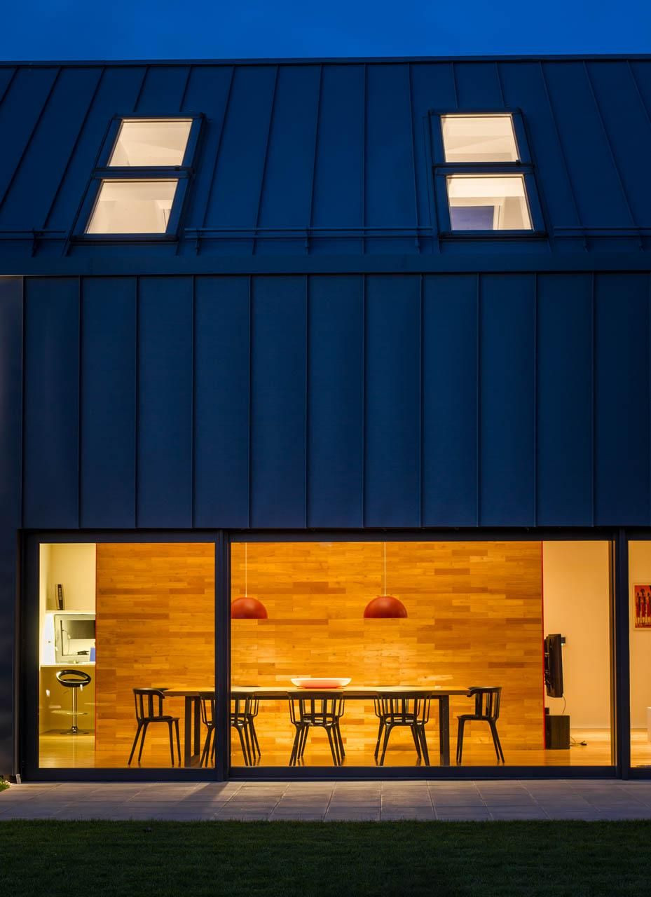 Čelní fasáda i sedlová střecha mají oblek v podobě tmavého falcovaného plechu. Při pozorování z větší vzdálenosti působí jako čistě černý, důstojně připravený na slavnostní večerní návštěvu divadla nebo opery. Když přijdete blíž, ukáže se světlejší výraz materiálu, takže vnímáte jeho strukturu i antracitový odstín, při kterém dům působí optimističtěji a ležérněji.