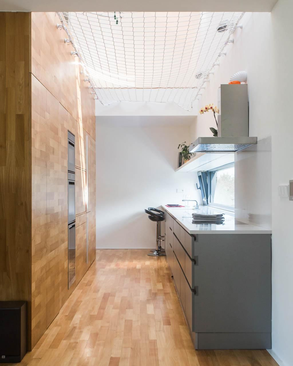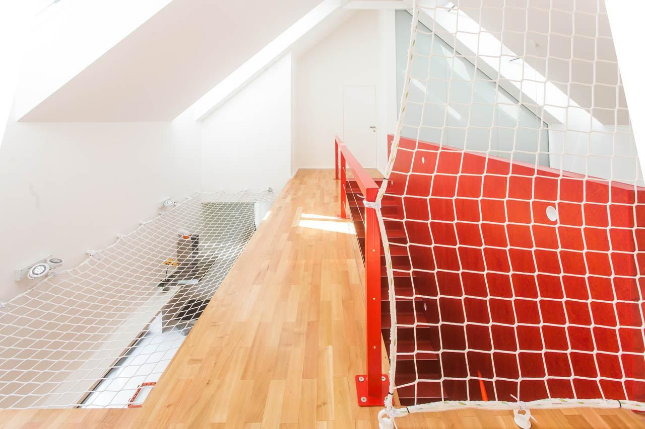Patro ukrývá dva hlavní pokoje, které jsou spojeny javorovým molem se zábradlím a bezpečnostní sítí. Netradiční řešení sítě dovoluje levitaci nad obytným prostorem a je podle majitelů nejlepším místem pro čtení knih. Prostorem se vůbec nešetřilo, i když jde jen o dispozici 4+kk. Každý pokoj v patře má svou koupelnu i šatnu, kde se tísnit nemusíte.