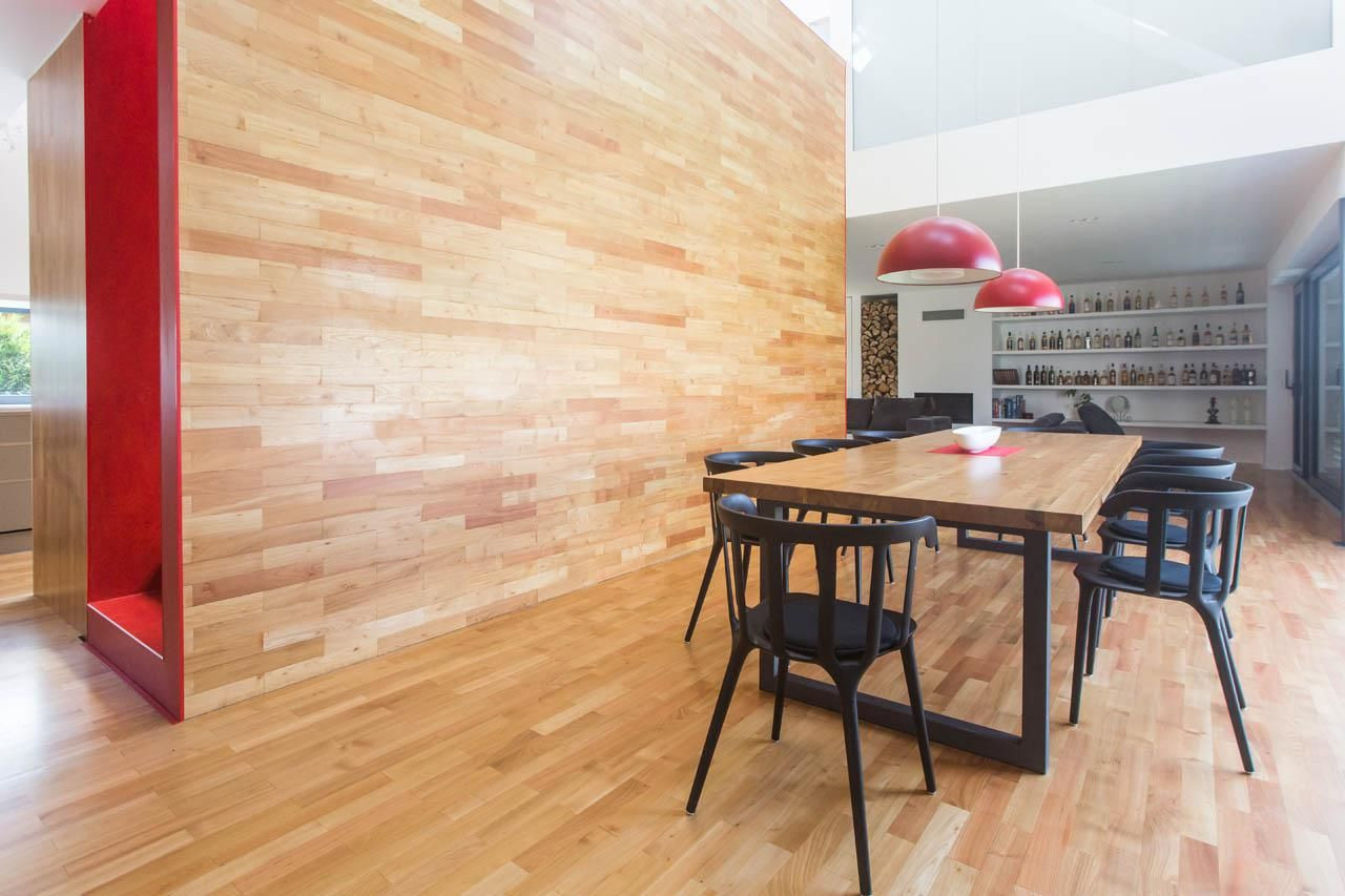 Jakmile se nabažíte krásného kontrastu javoru a červeně, upoutá Vás prosklená stěna dlouhá 10,5m a vysoký prostor nad ní. Člověk se zde cítí jako v kostele - výška tohoto prostoru je opravdu majestátní. Velkoryse lze propojit obývací prostor se zahradou. Otevíratelná část prosklené stěny má šířku nadstandardních 3,5 metrů, takže můžete být se zahradou opravdu v těsném kontaktu, ale zároveň ukryti před nepřízní počasí.