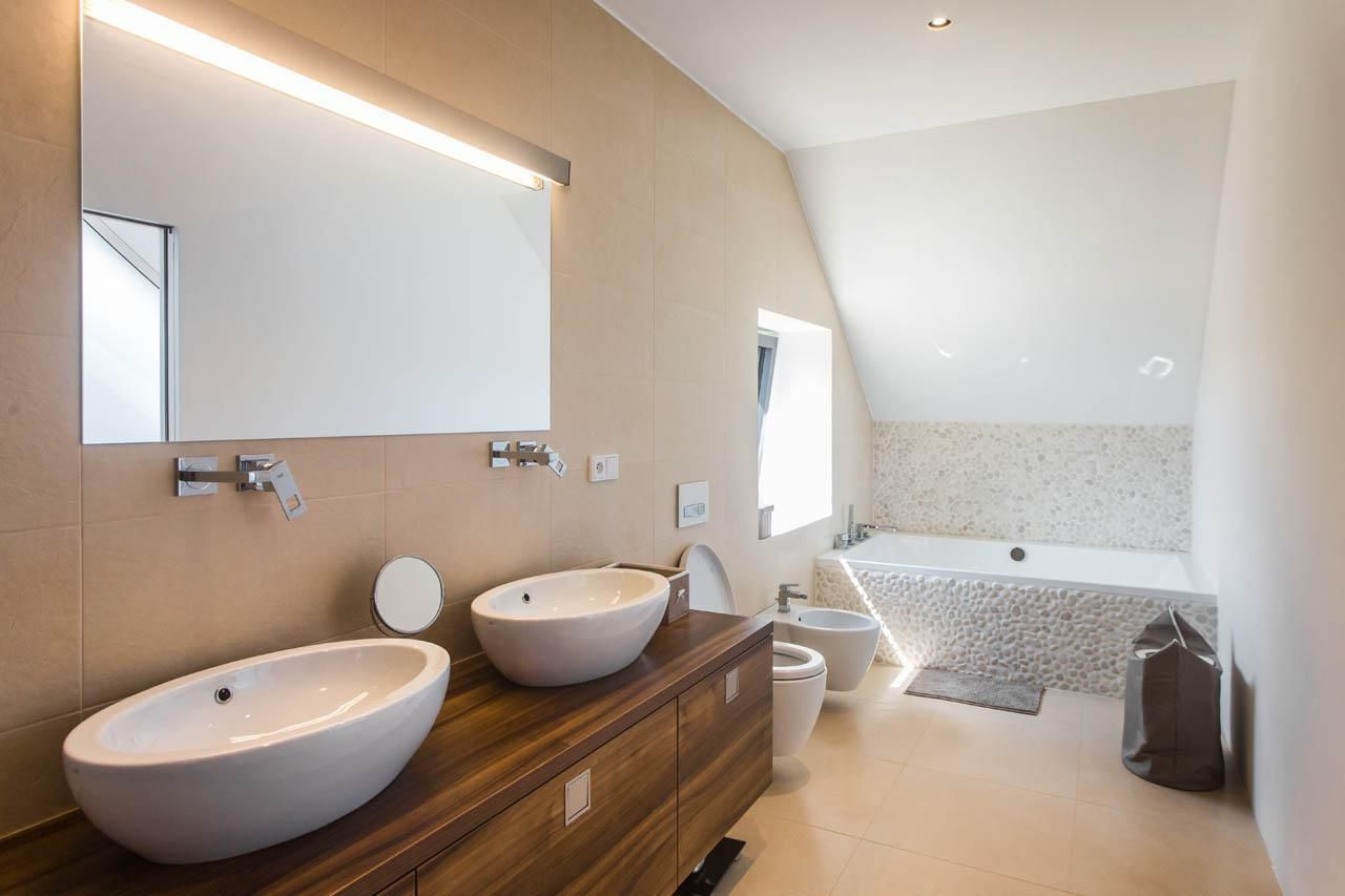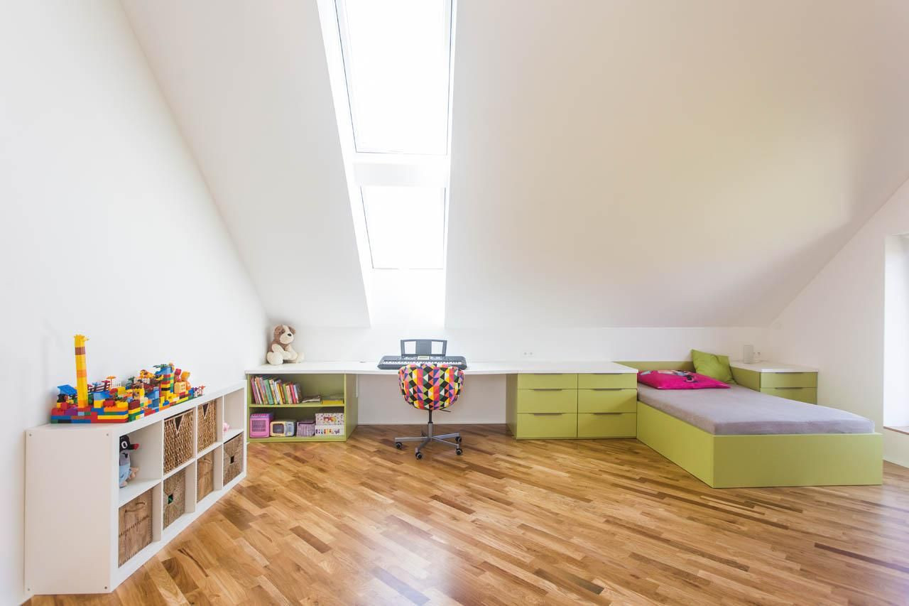 I když je práce s prostorem velkorysá v obou patrech, neplýtvalo se jím. Proto je v domě kompletně podlahové topení i chytré úložné prostory typu skladovací místnost pod schodištěm.