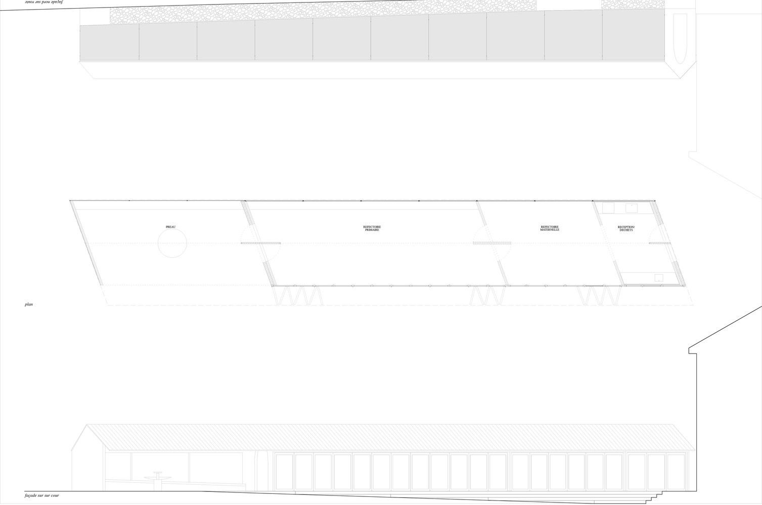 Necelých 70 kilometrů jižně od sídla kanceláře mladých architektů ze studia BAST stojí v jihofrancouzské obci Montbrun-Bocage nová přístavba historické budovy školy. Kompaktně působící jednopodlažní stavba kosodélníkového půdorysu vytváří chráněný dvůr školy, úpravy venkovního schodiště pak dodávají další kvality přilehlého exteriéru školy. Neokázale působící architektura ze základních materiálů využívá minimum stavebních prvků, čímž se přibližuje například výborným nízkonákladovým projektům školních budov ve Francii od studia Lacaton & Vassal.