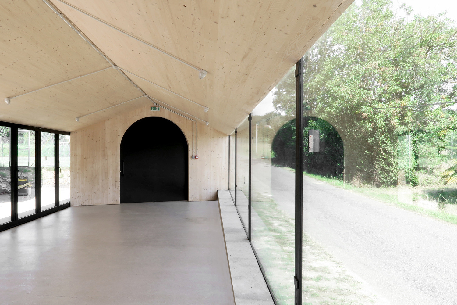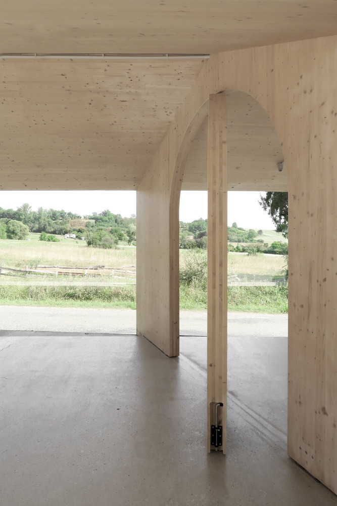 Samotná stavba působí až primitivním, přesto ale kultivovaným dojmem. Na první pohled se jedná pouze o jednoduchou střechu z vlnitého plechu s přesahem, skleněnou fasádu dělenou v pravidelném rastru a příčné a štítové stěny z dřevěných CLT panelů, které najdeme také v konstrukci střechy.