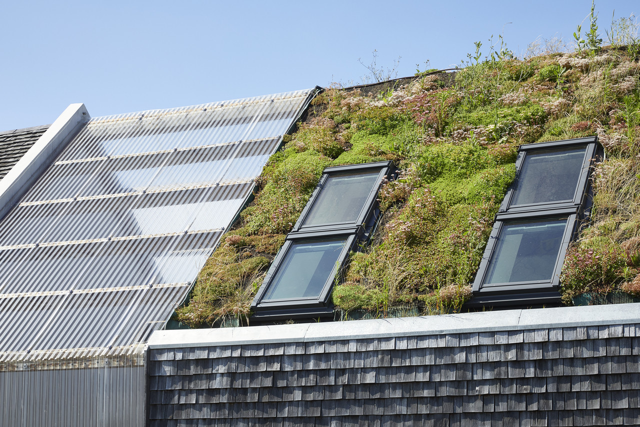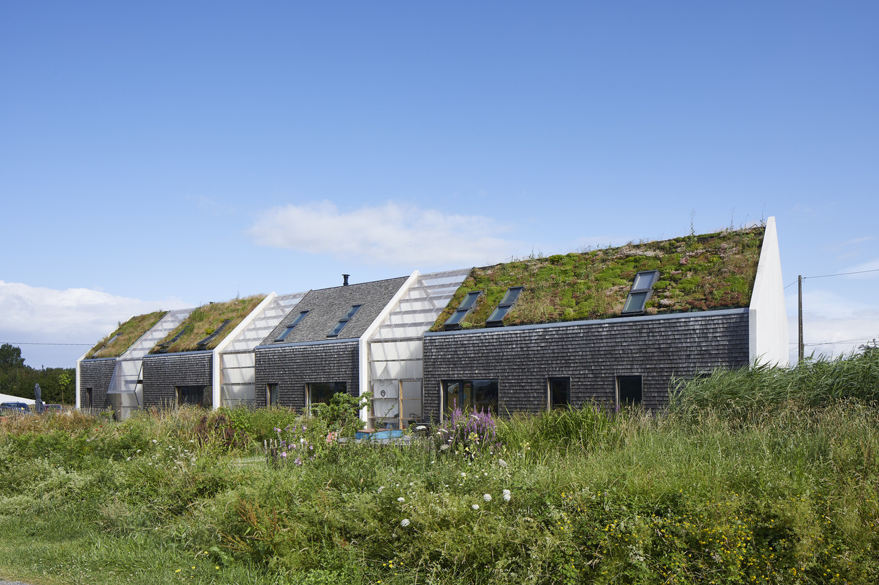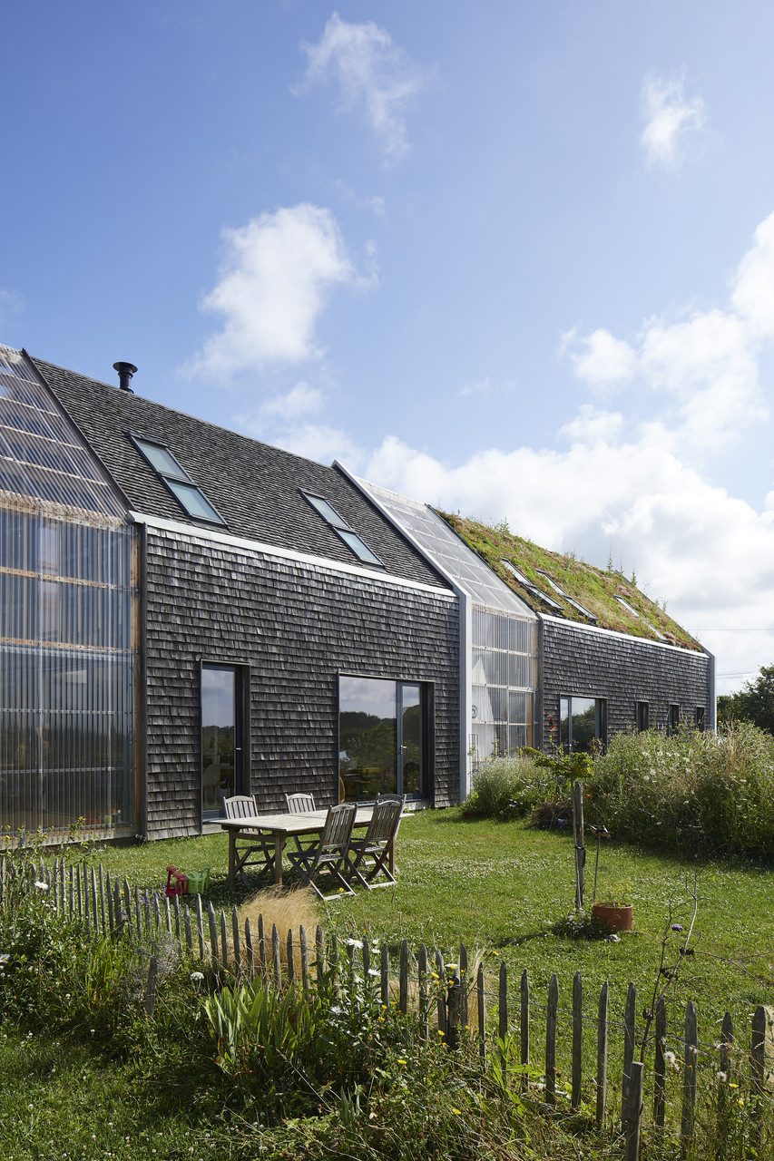 Umístění domu v ochranném krajinném pásmu lokality Erdeven a s tím spojené přísné regulace do velké míry určily finální tvar novostavby – místní regulativy totiž nařizují přesně danou výšku hřebene a sedlovou střechu pod úhlem 45 stupňů. Architektům se nicméně povedlo prosadit alespoň to, aby dvoupodlažní objekt pokrývaly štípané dřevěné šindele namísto (pro tento region typické) bílé omítky. A svolení dostali i v případě zelené střechy.