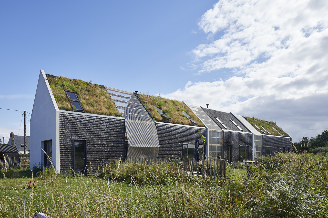 Na jihu Bretaně u drobného městečka Erdeven se kamarádi, bývalý spolužáci a nynější kolegové ze studia j+e architectes rozhodli realizovat nový koncept vlastního společného bydlení. Na třech sousedících pozemcích tak vybudovali jeden podlouhlý objekt propojující hned tři rodinné domy, ateliér architektů a další společné prostory do jednoho kompaktního celku.