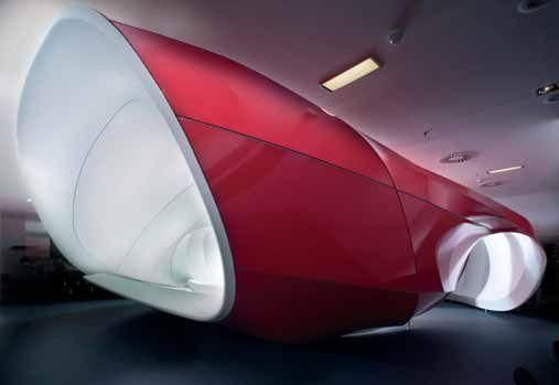 V prostoru bylo využito několik zajímavých stavebních technologií. Prostorové objekty byly realizovány složitě tvarovanou nosnou ocelovou konstrukcí, kterou jsme vzhledem k rozměrům skládali prvně v tovární hale a následně jsme ji montovali po částech přímo na místě. Pro obvod jsme zvolili ocelovou trubku průměru 60 mm a zbytek žeber byl řešen v ocelovém jeklu 25x25 mm. Následně byl tvar rozčleněn do segmentů pomocí hliníkových lišt pro napínání červeno-bílé fólie. Dalším atypickým výrobním postupem jsme museli vyrábět na míru navržený nábytek, který je prostorově a tvarově velmi složitý, a proto vyrobený z termoformingem ohýbaného corianu. Samotné realizaci však předcházelo důkladné zpracování návrhu ve 3D modelech.