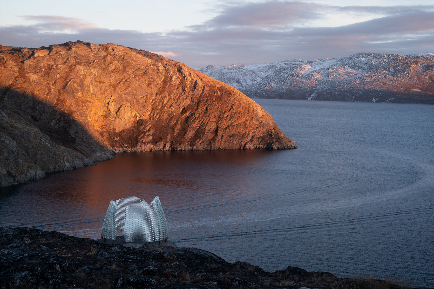 Pavilon ze skleněných bloků navrhl architekt do skalnaté krajiny na západním pobřeží Grónska. Tvoří jej ručně odlité bloky a jeho podoba se inspiruje místní kulturou.