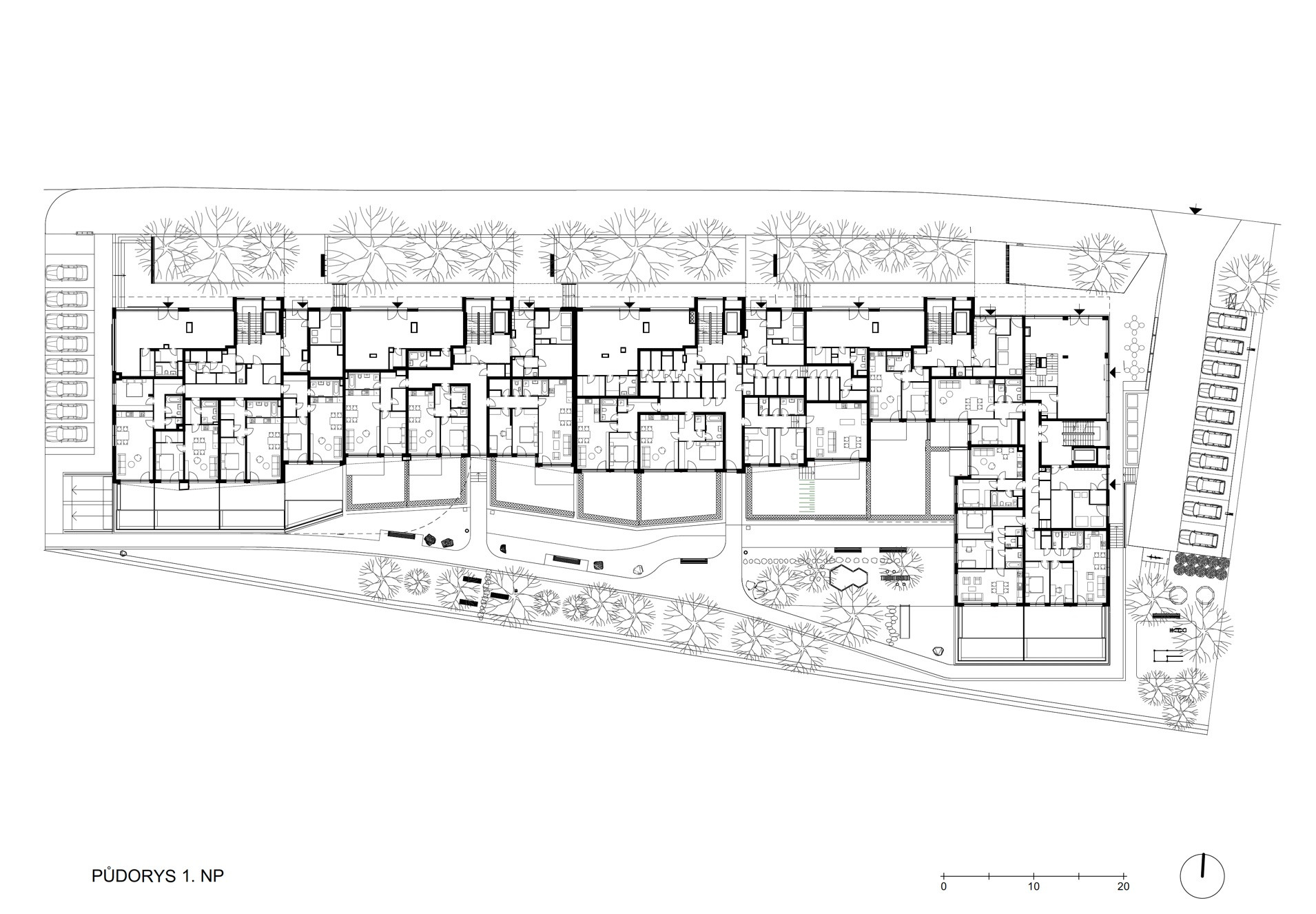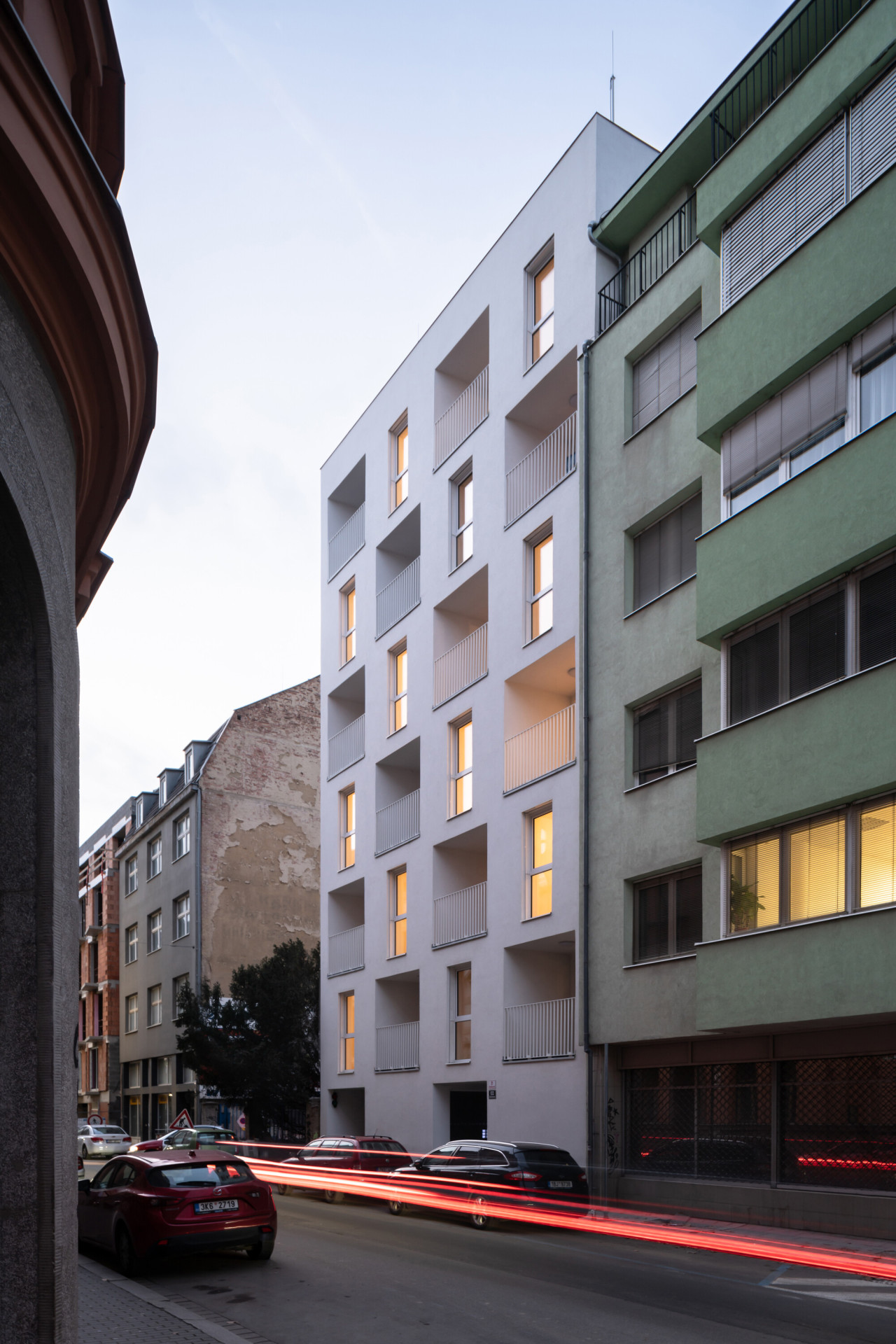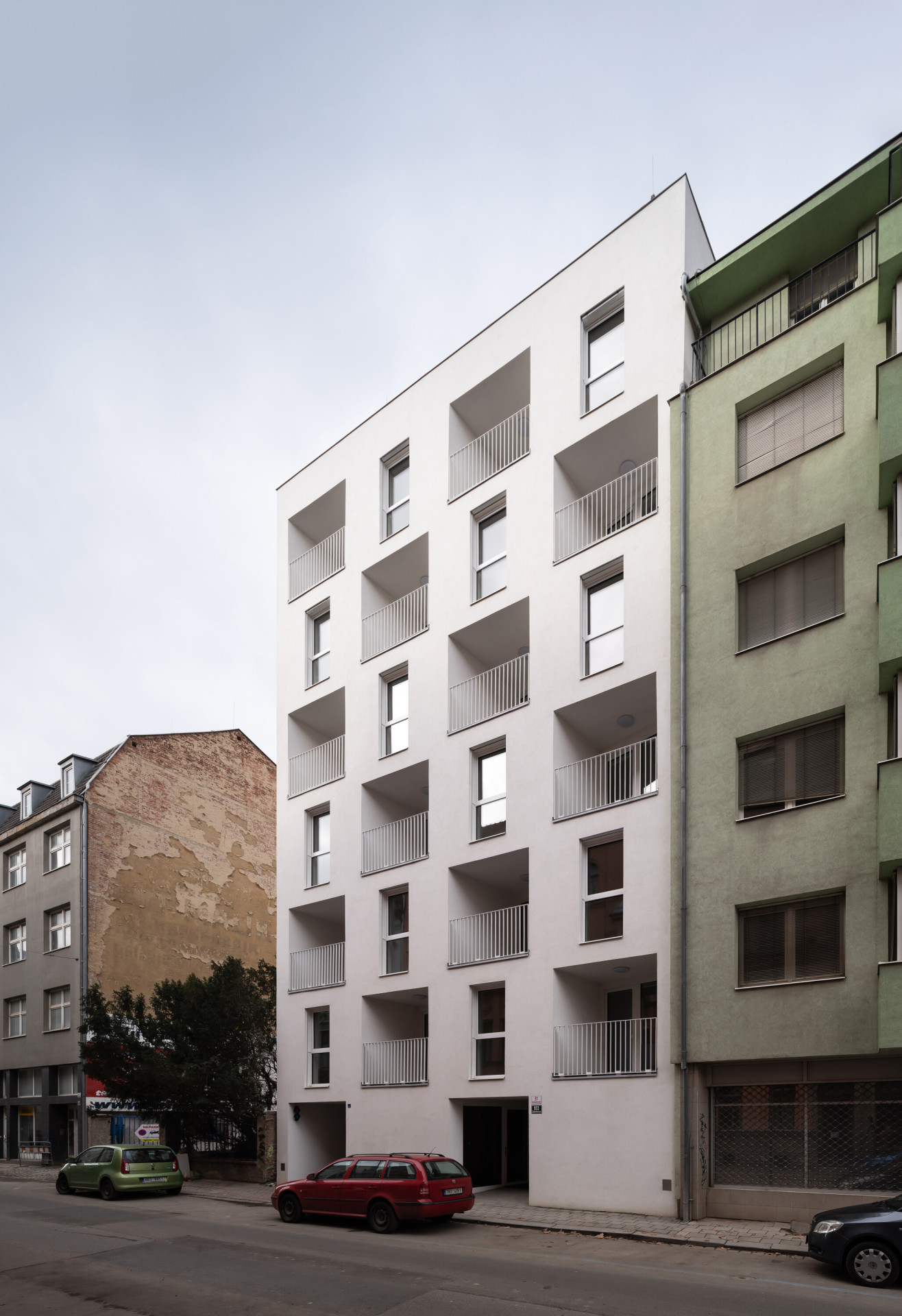 Dům má tvar L a architekti ze studia Podlipný Sladký architekti chytře pracovali se světovými stranami i rušnou ulicí U Plynárny. Většina bytů je obrácena na jih, západ a východ dovnitř „elka“. Tam je parkový prostor, najde se tu klouzačka a další herní prvky pro děti. Byty v prvním podlaží mají předzahrádky.