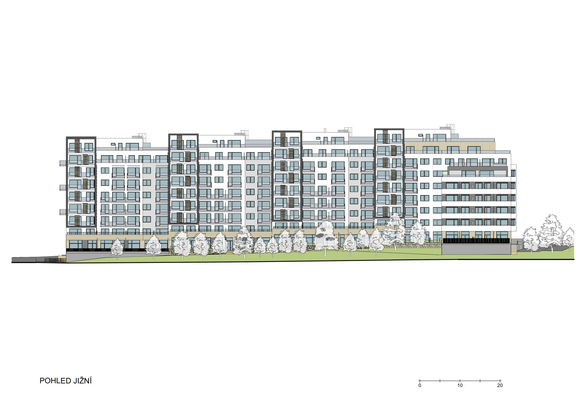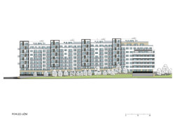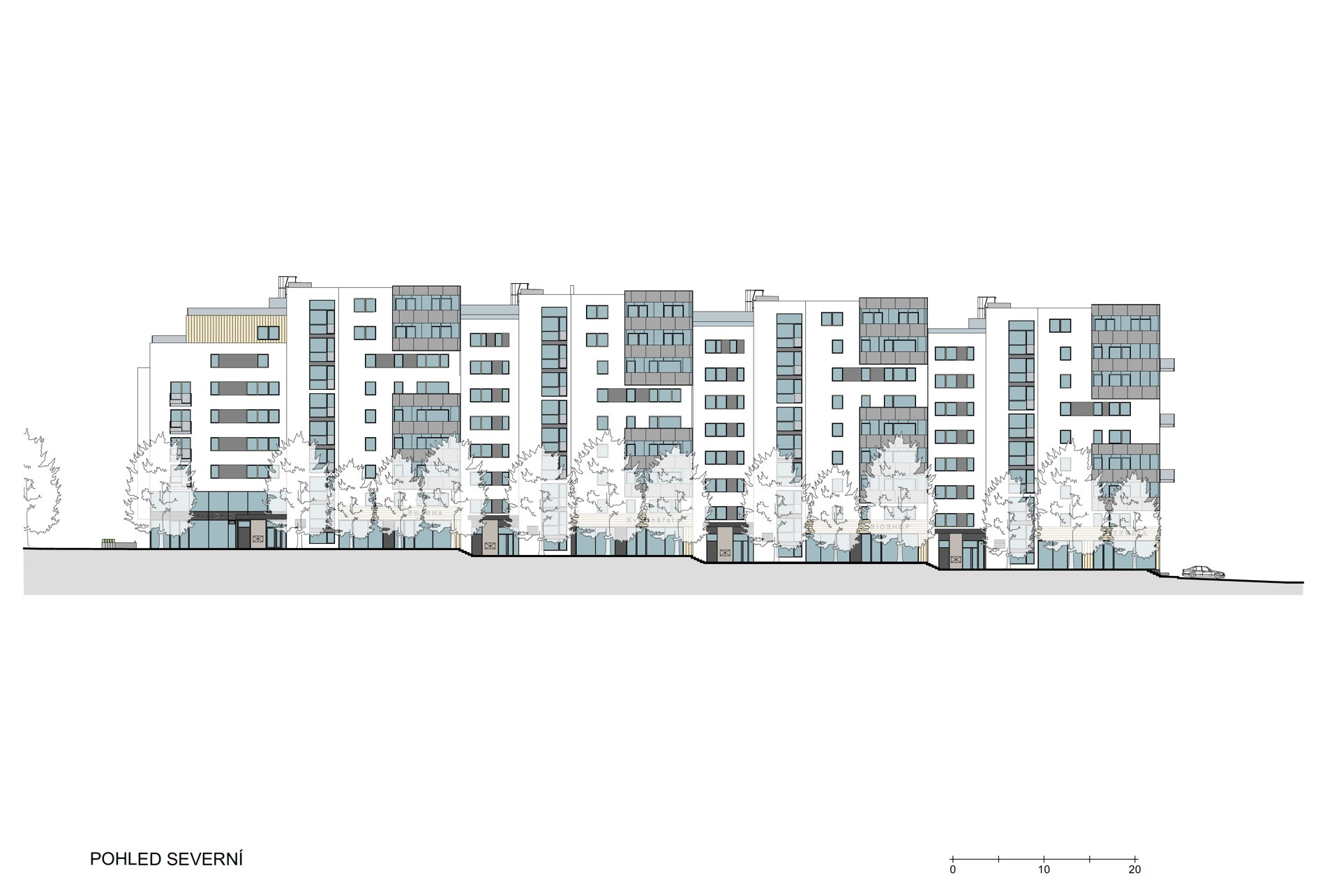 Na sever do rušné ulice U Plynárny jsou obrácené malé bytové jednotky. I ty jsou od komunikace odděleny pásem stromů a malými zelenými předzahrádkami. Mají zasklené lodžie a výhled na zalesněný vrch Bohdalec. V parteru jsou na této straně obchodní jednotky, jedna dokonce dvoupatrová, kde by mohla vzniknout kavárna či restaurace a dodat místu ještě více městskosti.