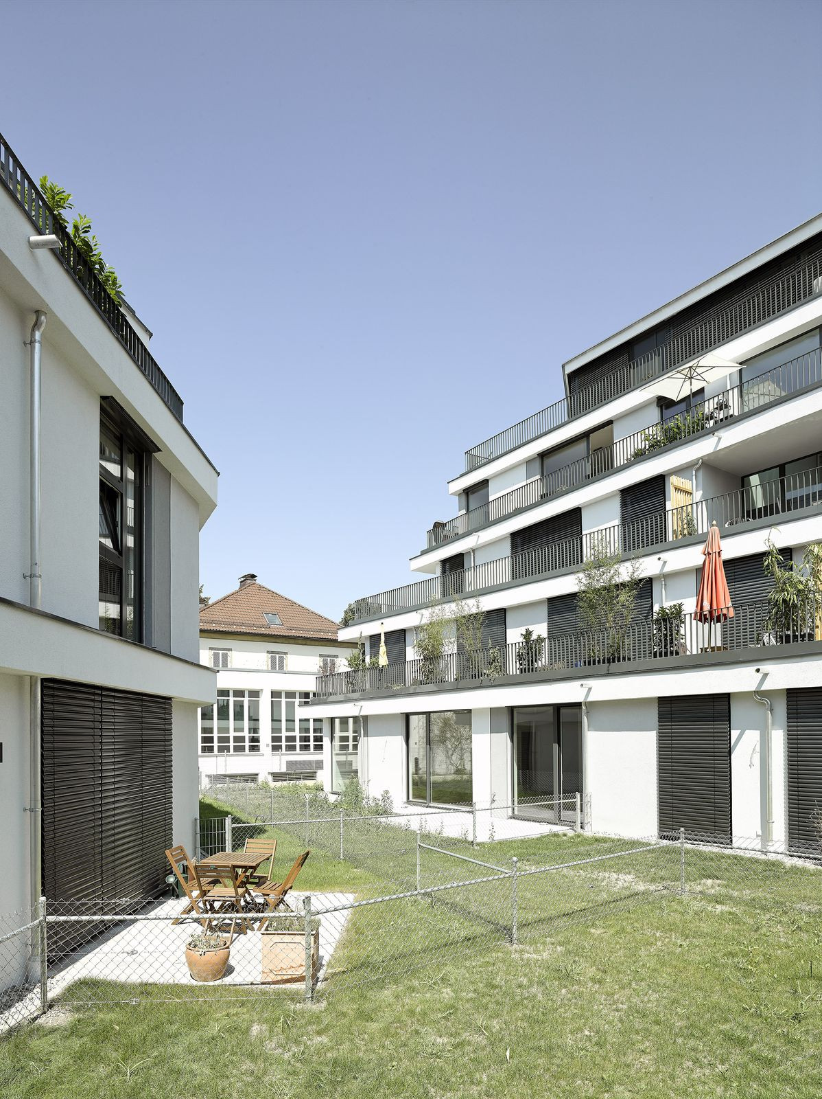 Na rozdíl od lineárního průčelí jsou fasády směrem do nádvoří určeny pro pobyt. Určitě tedy nikoho nepřekvapí velké množství balkónů a teras. Co jste ale možná nečekali, je, že každý apartmán má vlastní pobytovou plochu na travnaté terase. Spolu se zelenými střechami a prostorem nádvoří vznikla zelená oáza uprostřed města.