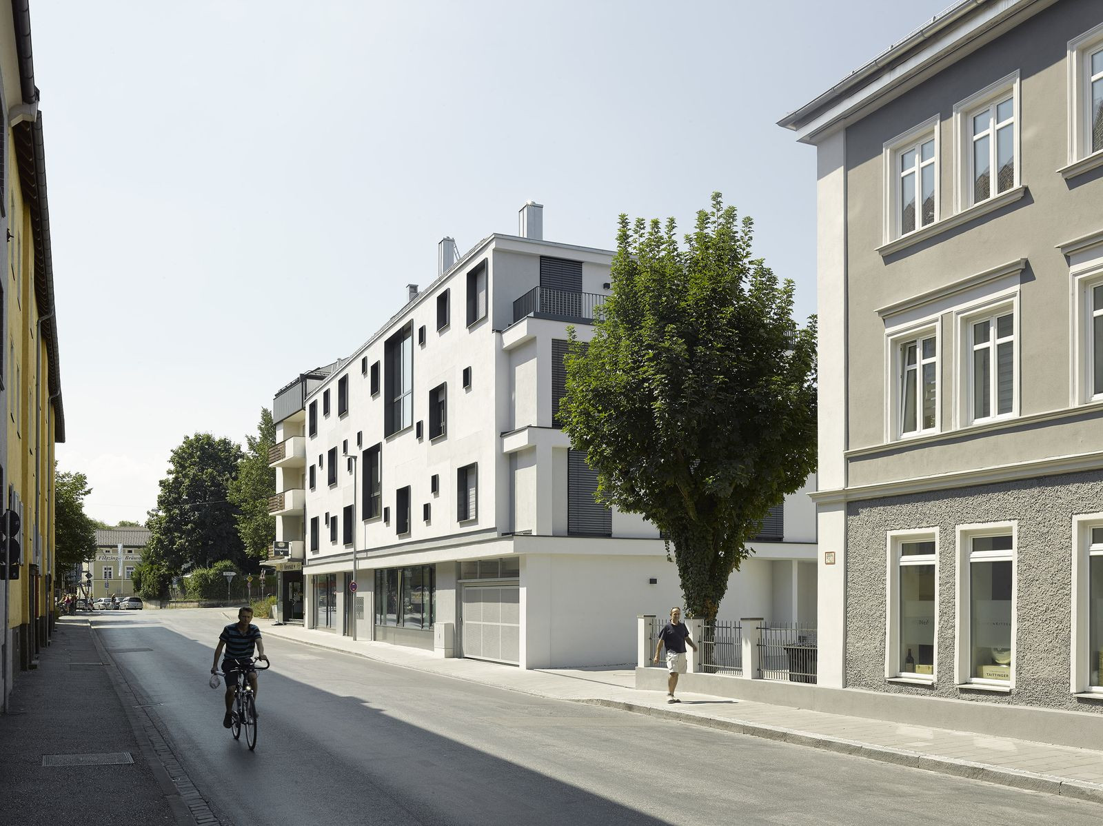 Pokud znáte Rosenheim, nepřekvapí vás, že je komplex přístupný z Prinzregentenstraße, což je jedna z hlavních tříd města. Podél této ulice komplex navazuje na již stávající budovy a vytváří tak dojem souvislého bloku, což je z urbanistického hlediska jednoznačné plus, neboť se tím posiluje městský charakter a třída působí homogenním dojmem. Není narušena uliční čára a obyvatelé se ve městě lépe pohybují. To už ovšem nemusí platit u vedlejších ulic, jako je Samerstraße, ze které je přístupný vnitřní dvůr. Díky této proluce je prostor mezi budovami světlejší a vzdušnější. Fasádní plochy směrem do ulic byly koncipovány jako perforovaná fasáda s volným umístěním oken.