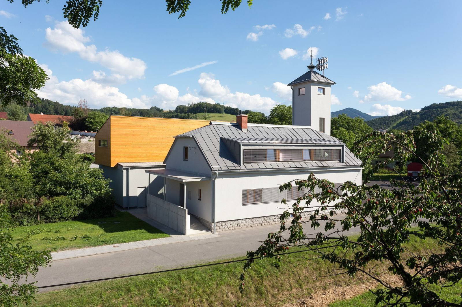 Původní objekt jsme sjednotili novou omítkou, novou krytinou a výměnou dřevěných oken. Interiér byl upraven pro klubovny spolku. V přízemí byl ponechán nájemní byt. Nová část budovy je konstrukčně řešena jako dřevostavba z masivních panelů, v exteriéru s dřevěnou provětranou fasádou z modřínových desek. Nachází se zde univerzální zasedací místnost, sociální zázemí a boční vstup do objektu.Hasičárna je první realizací našeho studia ve spolupráci s obci v uplynulém období. V současné době máme zpracované např. studie centra obce, fasády kostela na Myslíku či nový most v blízkosti hasičárny.