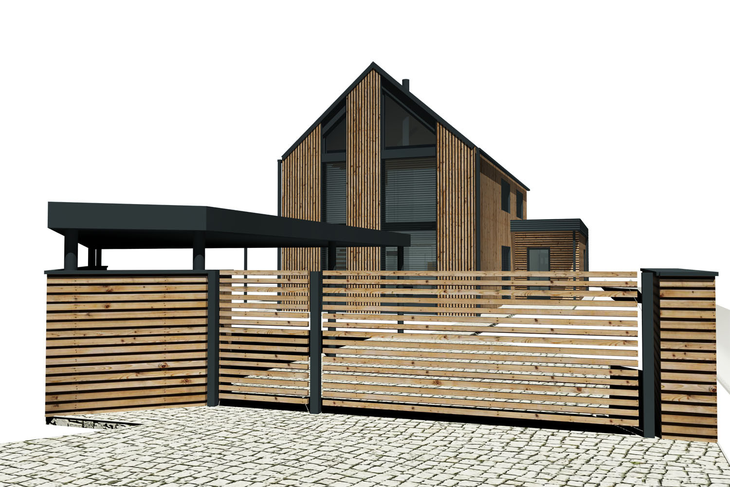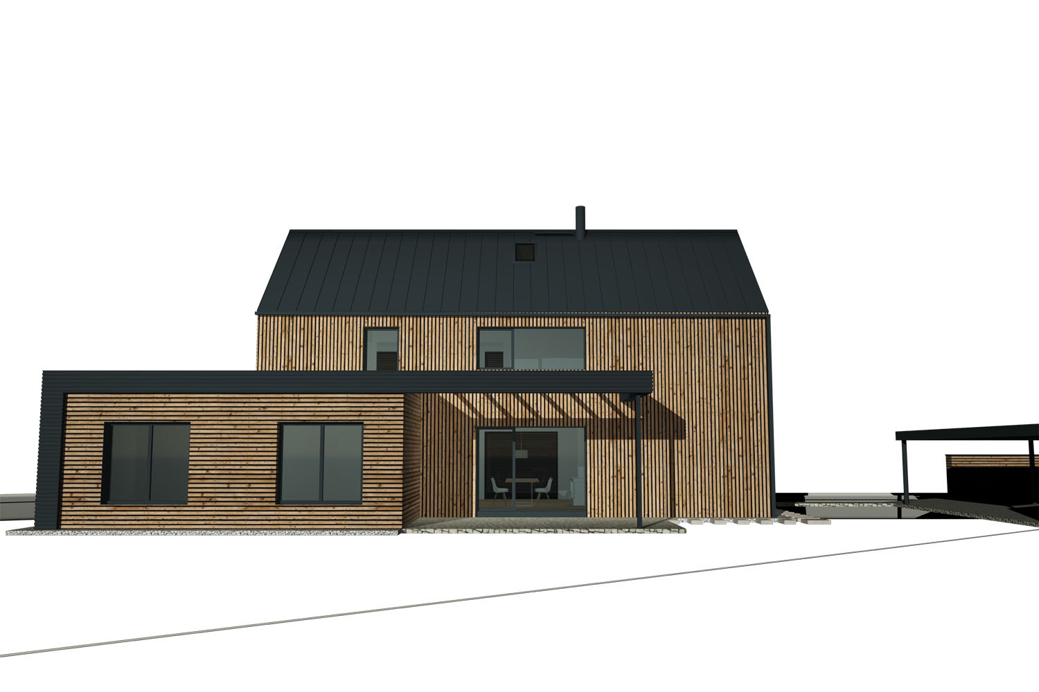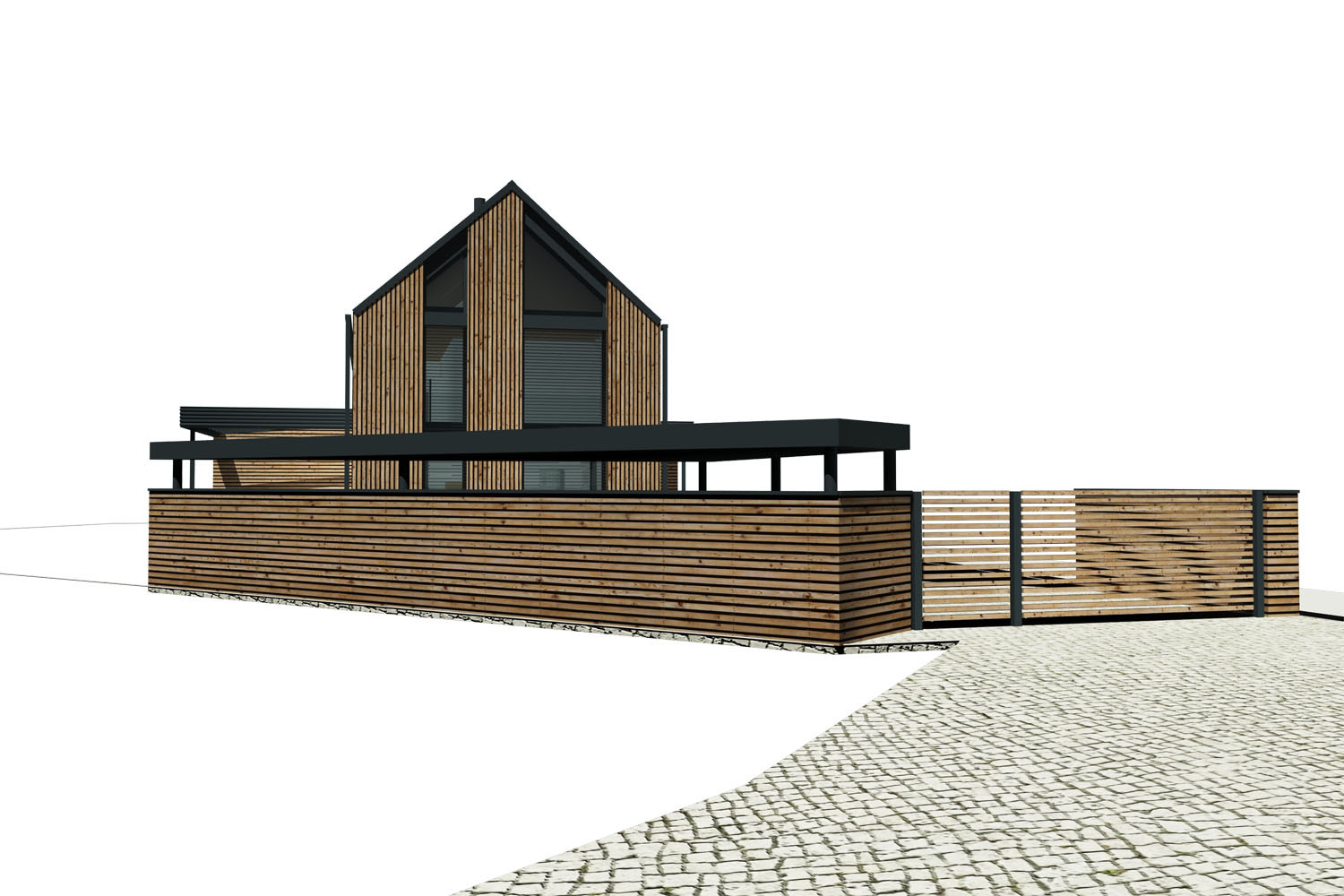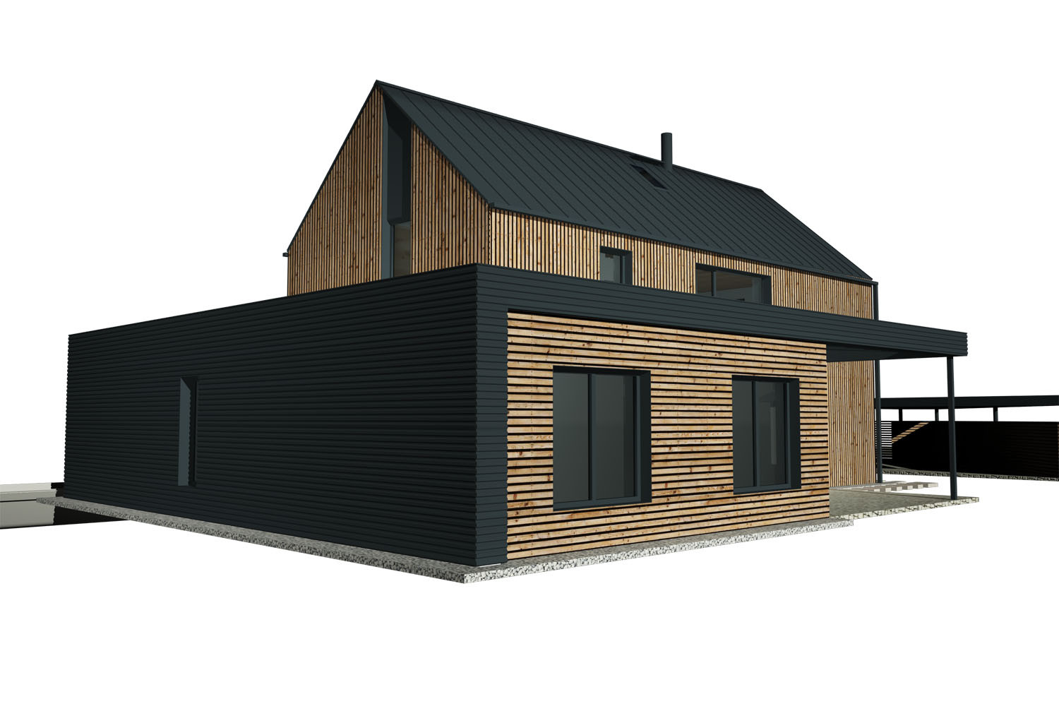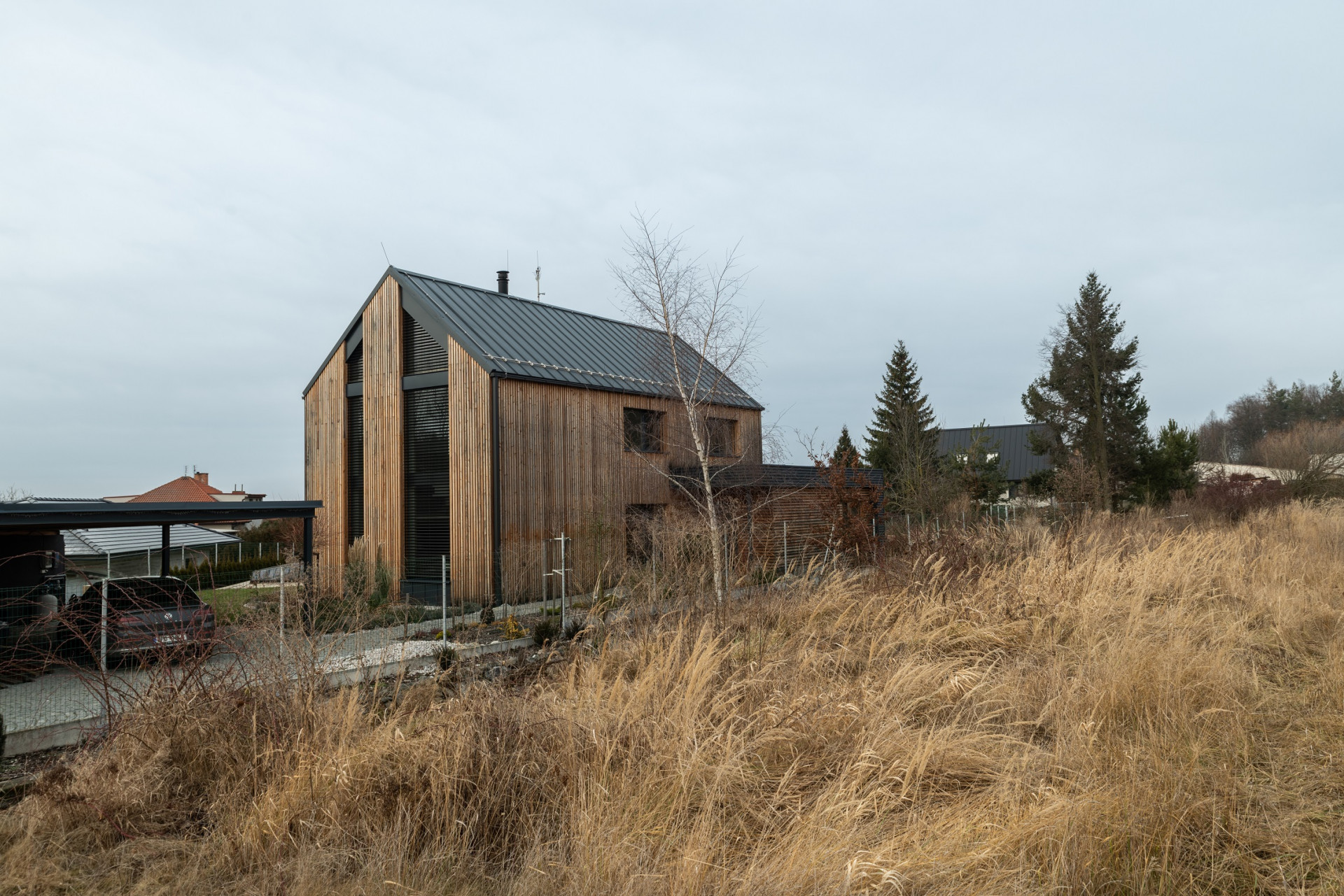 - Fasáda: sibiřský modřín a hliníkový antracitový plech