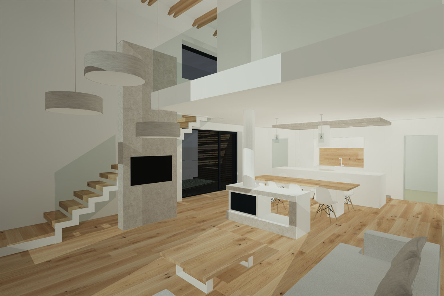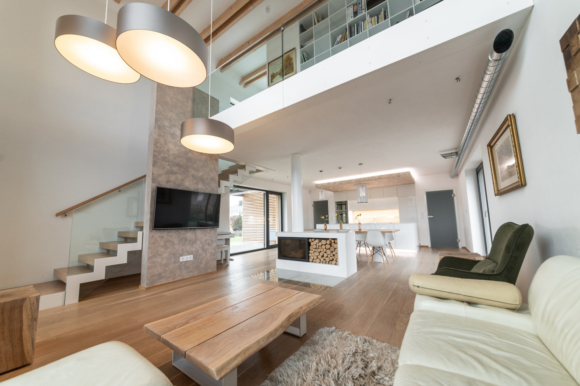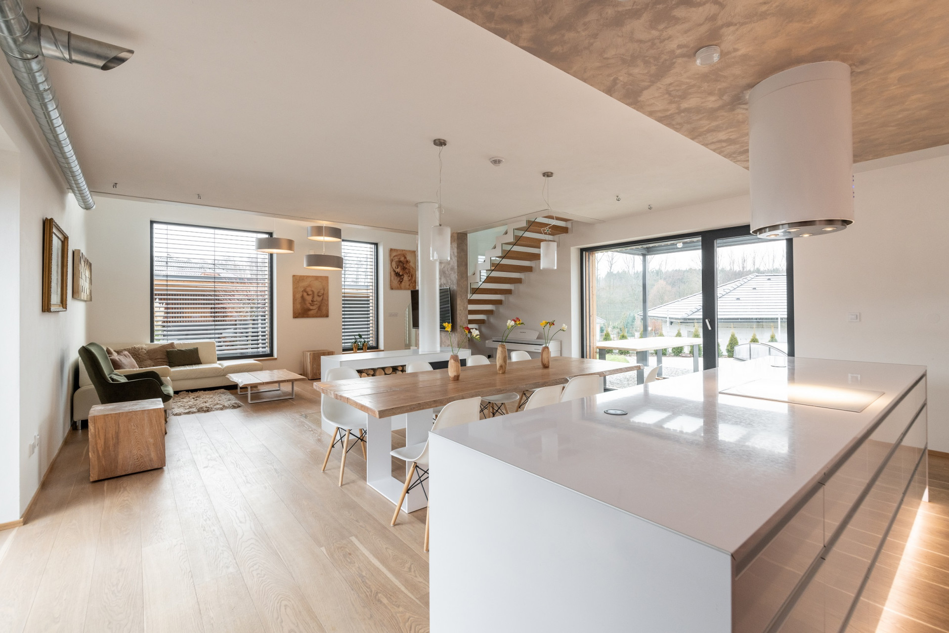 Srdcem domu a srdeční záležitostí architekta je společný prostor kuchyně, jídelny a obývacího pokoje. „Je to místo, kde se schází rodina a kde trávíme spoustu času. Tento prostor měl být hodně vzdušný, prosvětlený a měl poskytovat co nejvíce výhledů ven. Proto tu máme okna na tři světové strany a sluníčko k nám postupně svítí celý den. Prostor je perfektně prosvětlený a prosluněný,“ pochvaluje si investor.
