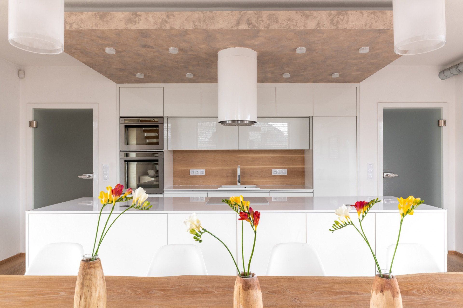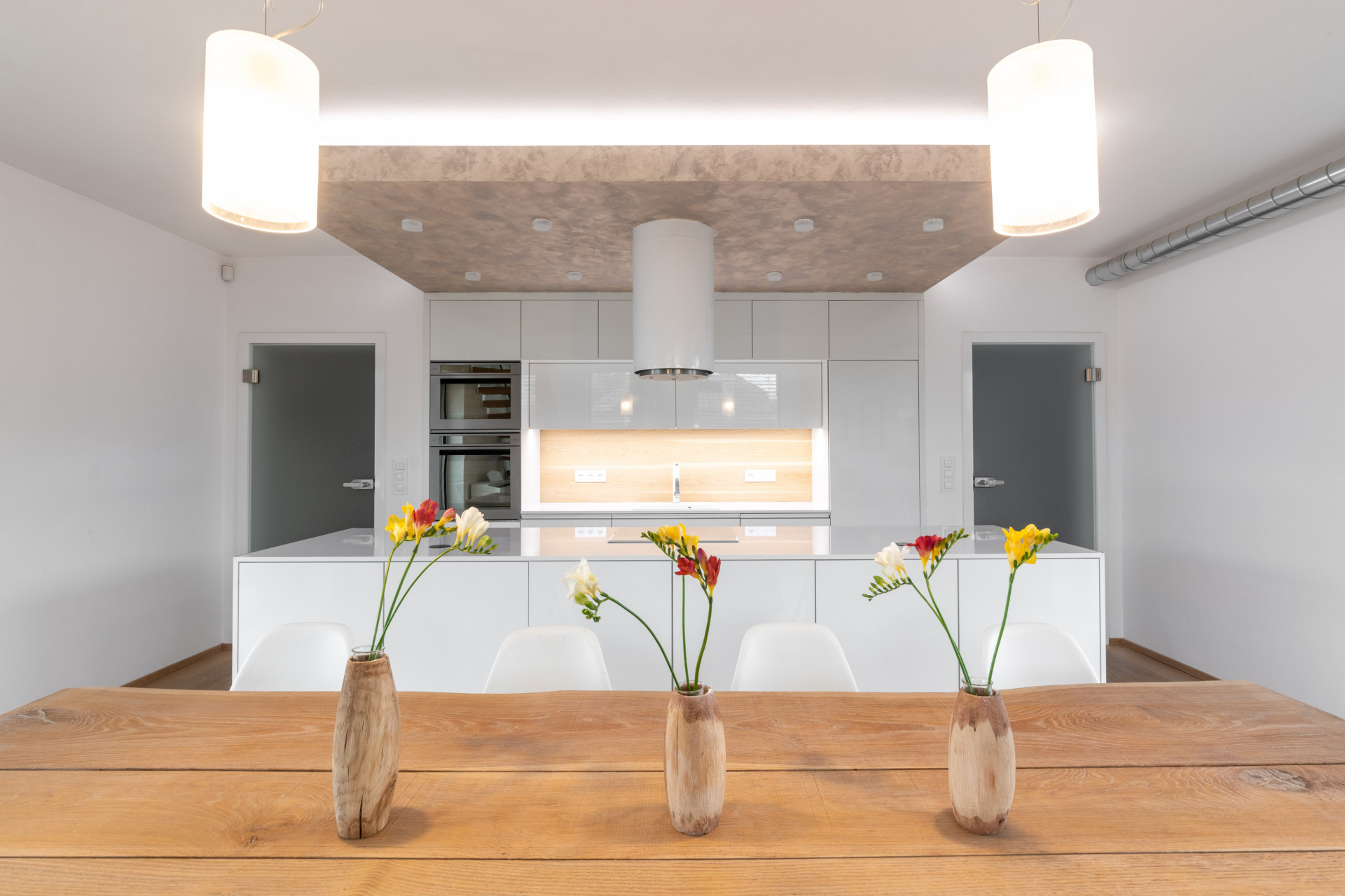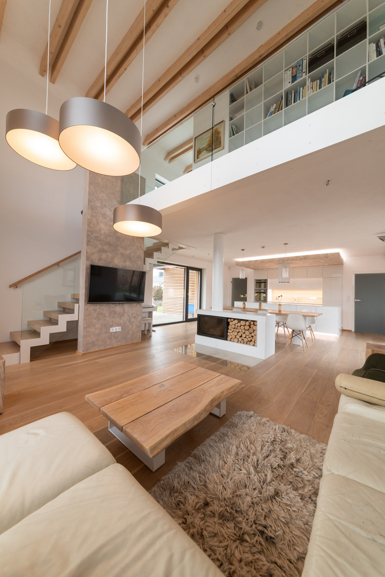 Srdcem domu a srdeční záležitostí architekta je společný prostor kuchyně, jídelny a obývacího pokoje. „Je to místo, kde se schází rodina a kde trávíme spoustu času. Tento prostor měl být hodně vzdušný, prosvětlený a měl poskytovat co nejvíce výhledů ven. Proto tu máme okna na tři světové strany a sluníčko k nám postupně svítí celý den. Prostor je perfektně prosvětlený a prosluněný,“ pochvaluje si investor.