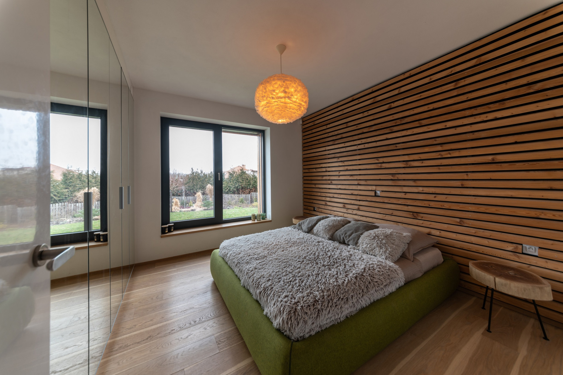Nejen zmíněný štít se promítá do interiéru, dalším prvkem jsou dřevěné latě fasády. „To, co jsem navrhl na fasádu, jsem chtěl zopakovat i uvnitř, aby interiér byl v kontextu s exteriérem,“ potvrzuje koncepci architekt. A tak například v ložnici či dětském pokoji je vždy jedna stěna obložena z modřínových latí, na toaletě je z nich realizován na stropě podhled.